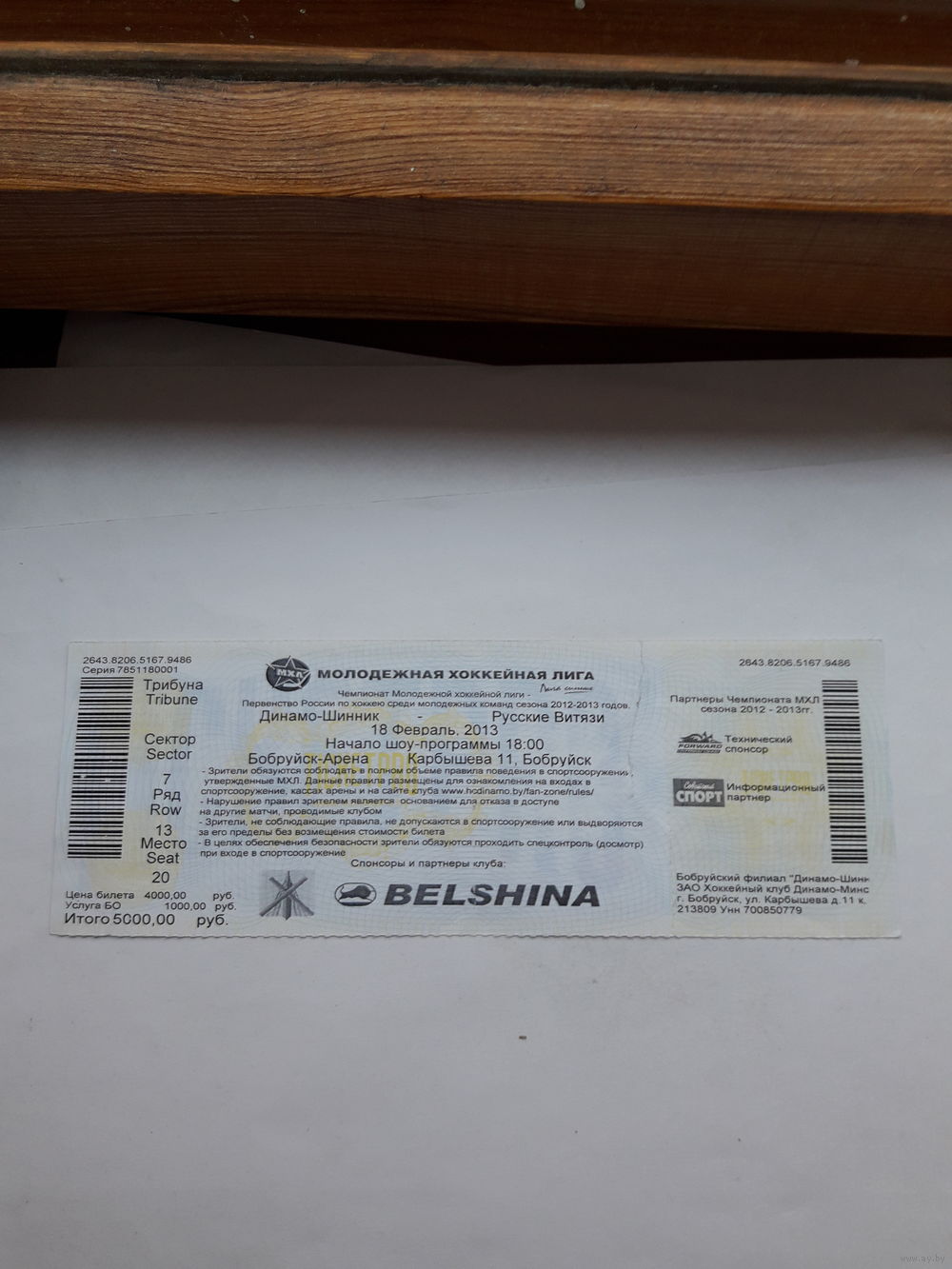 Входной билет Бобруйск Хоккей