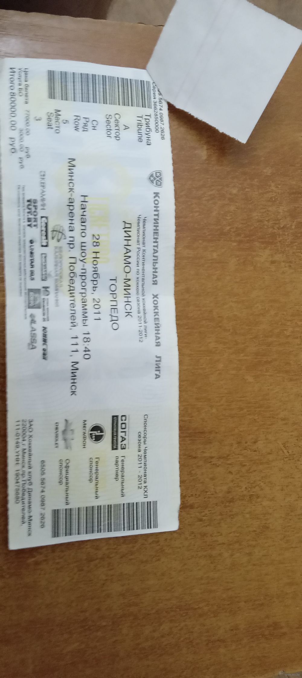 Входной билет на хоккей КХЛ Динамо Мн-Торпедо ,2011г