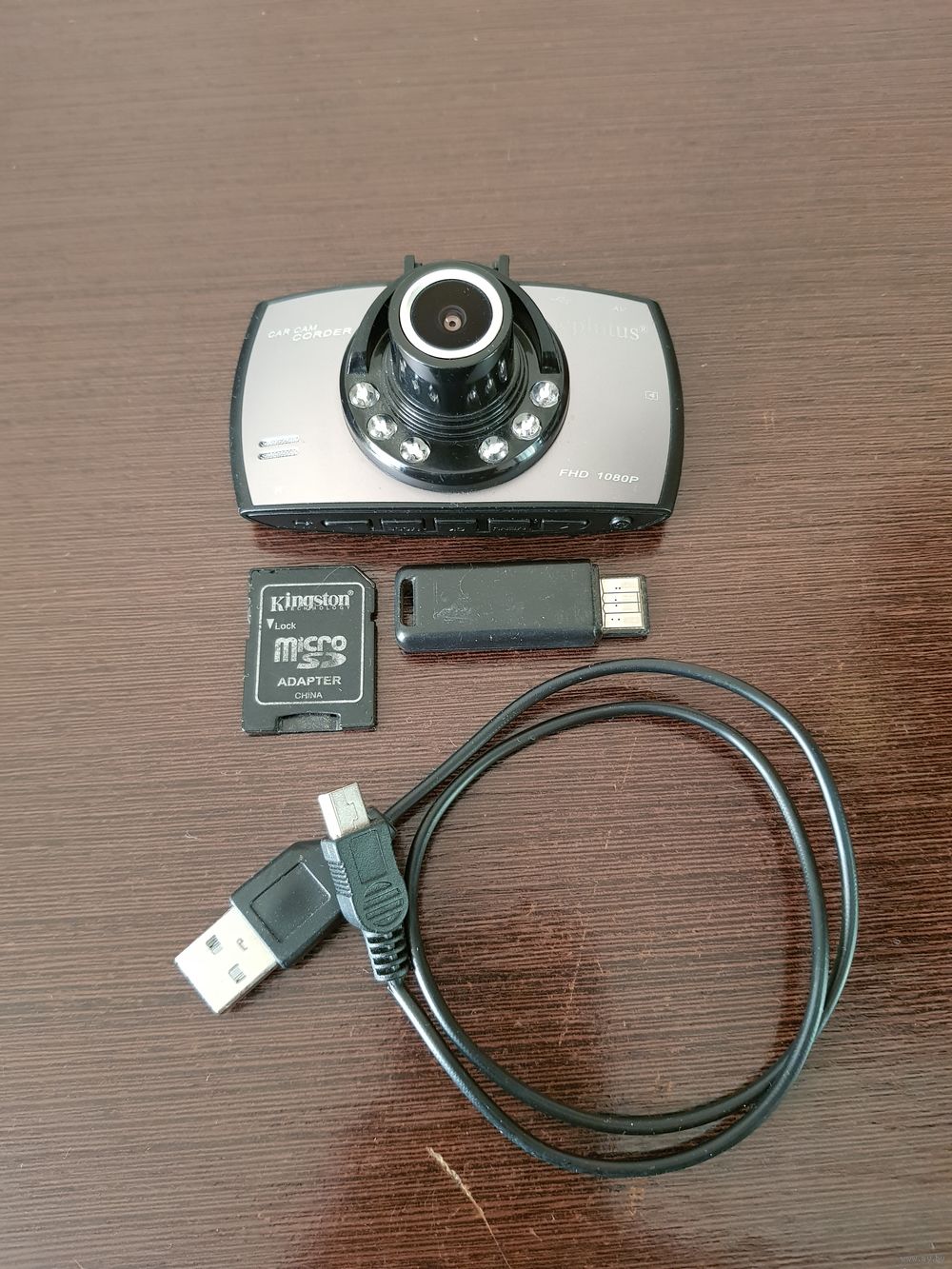 В комплекте: видеорегистратор + microSD 8Gb + переходник (2 шт.) + кабель.