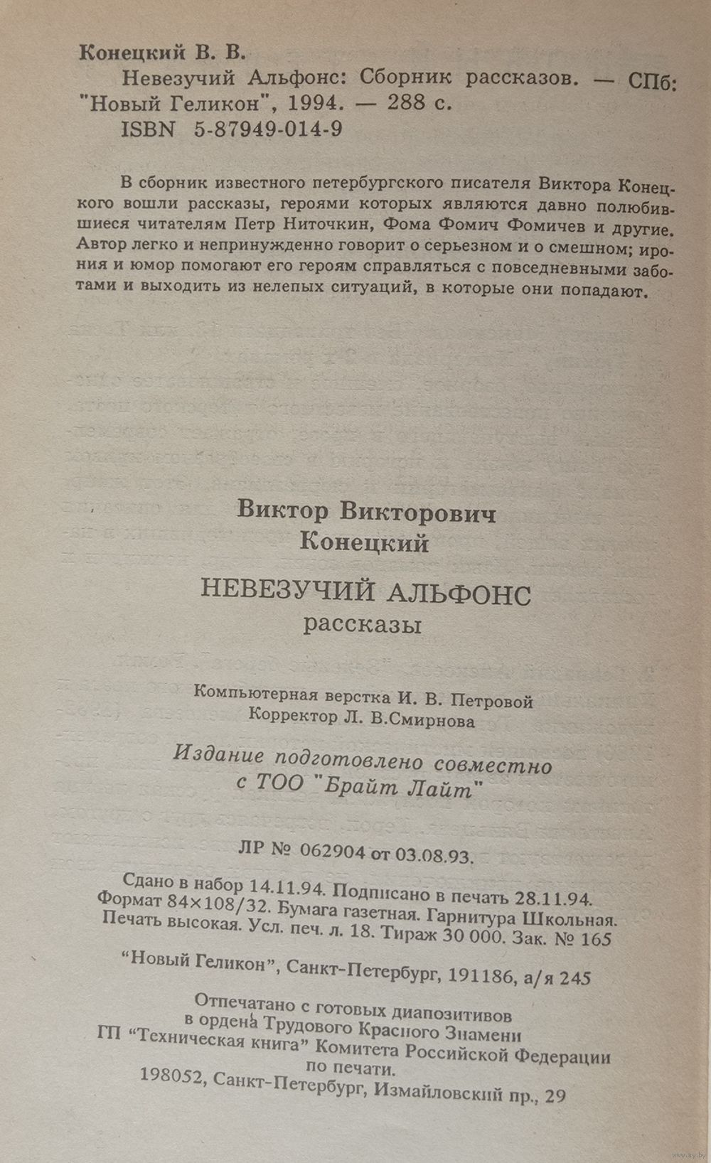 Виктор Конецкий. Невезучий Альфонс. Рассказы. Изд. Новый Геликон 1994г. 288 страниц.