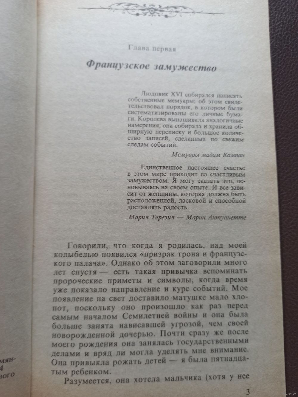 Королева вспоминает свои детские и юные годы в Вене, встречи с молодым Моцартом, пораженным ее красотой, она рассказывает историю своего замужества с наследником французского престола, будущим королем Людовиком XVI, описывает дворцовые интриги, пышные балы и запутанные любовные истории. И все это с искренностью человека, попавшего в неумолимую тень гильотины.