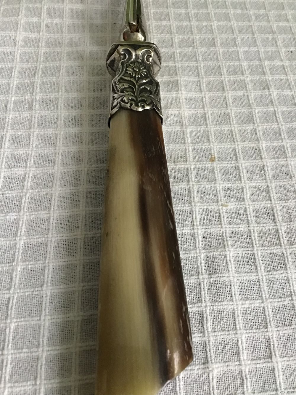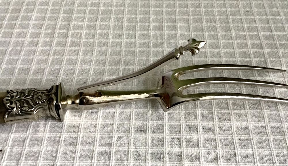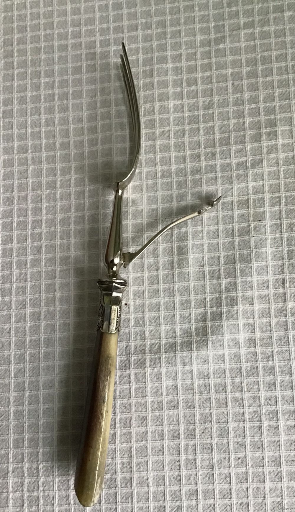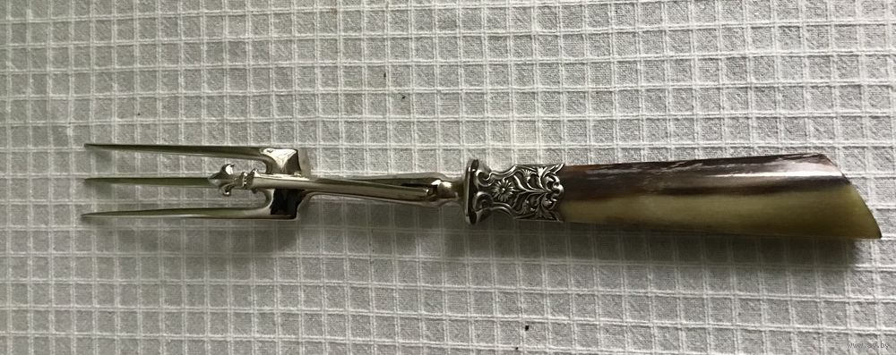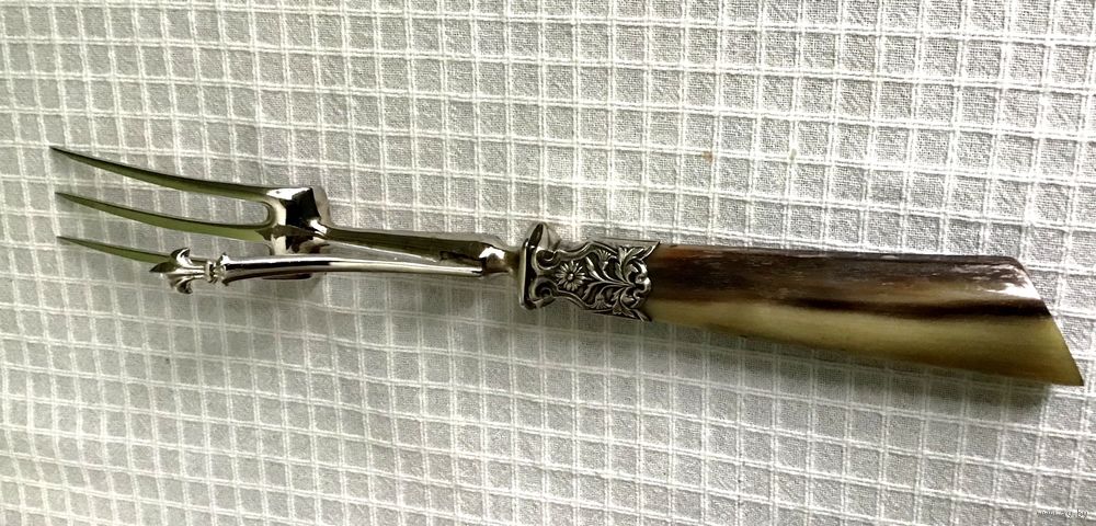 Траншерная (фр. tranhcer) вилка используется для порционной нарезки мяса и дичи. Франция, начало 20 века. Ручка - кость, материал вилки - кованая сталь. Длина 27 см. Состояние близко к идеальному.