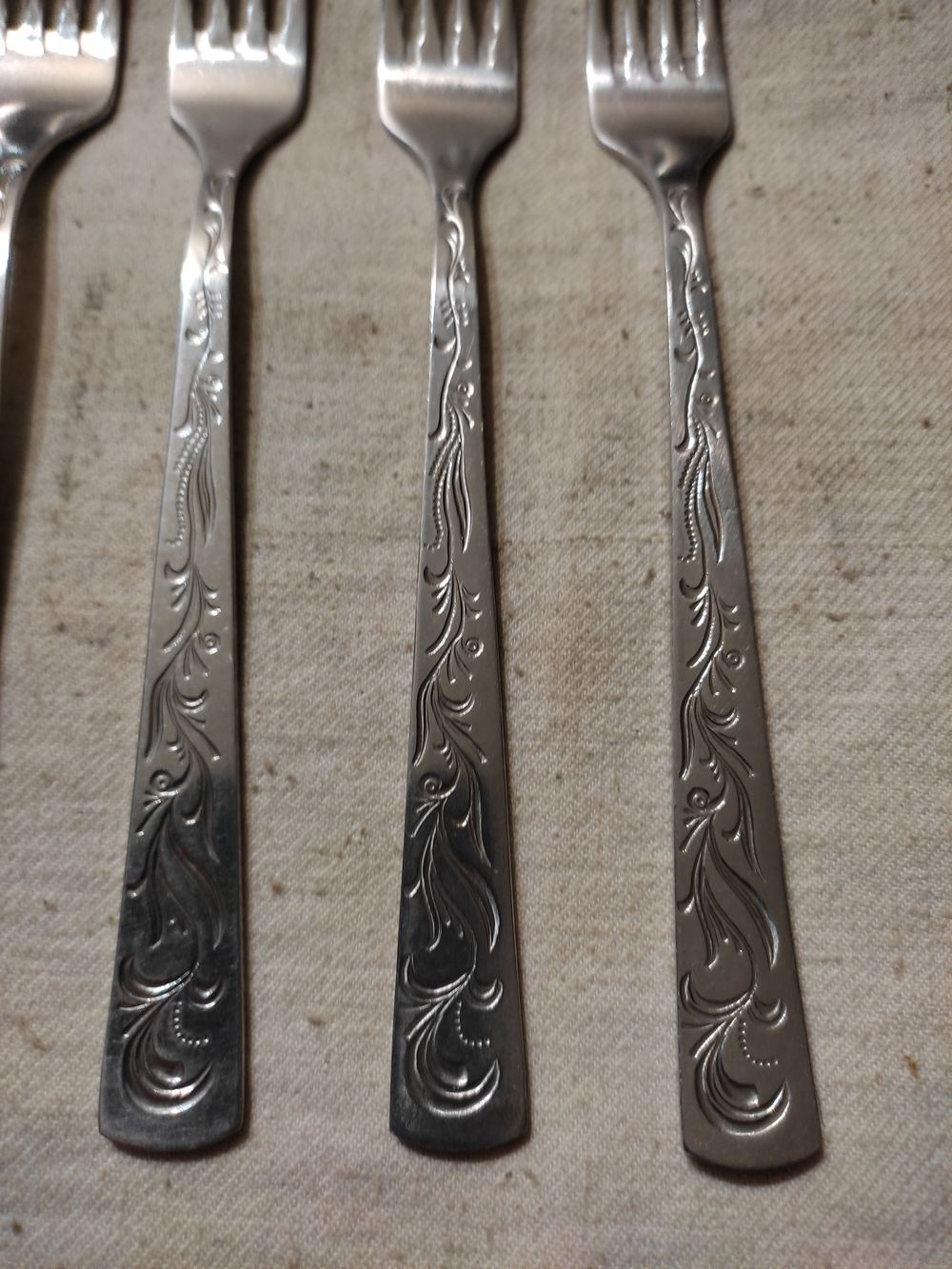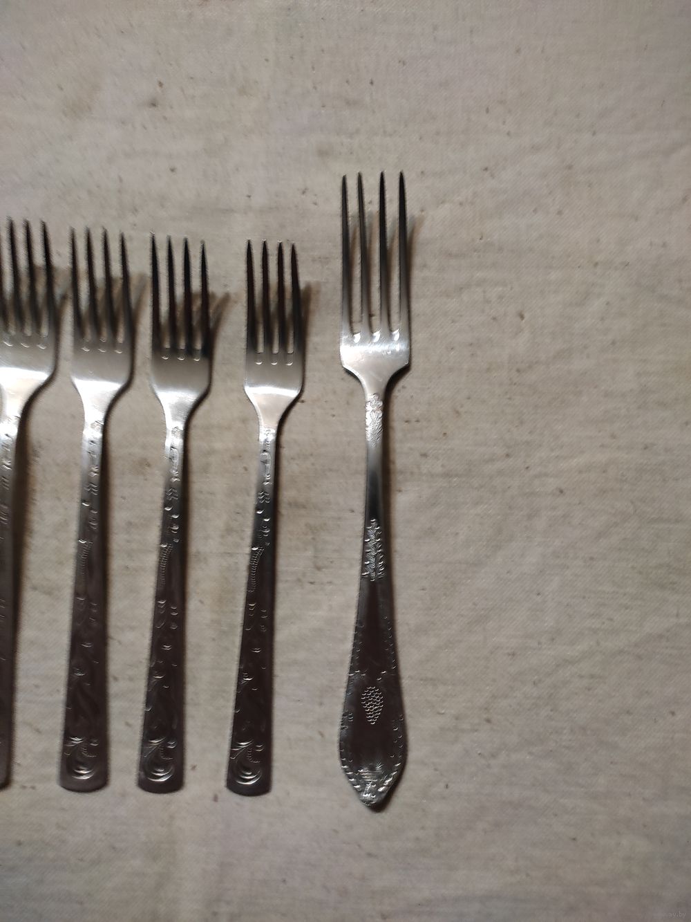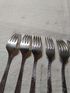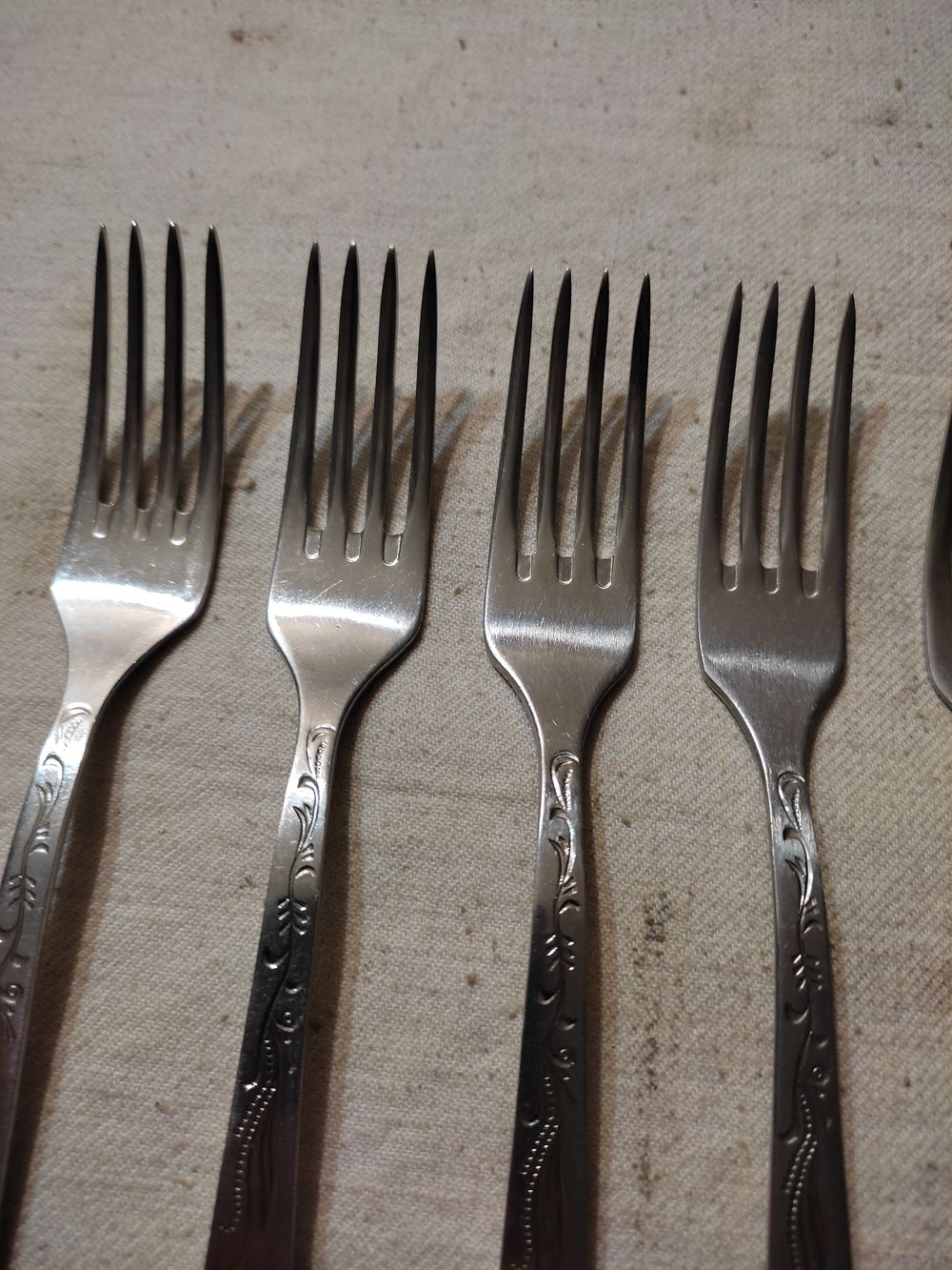 Вилки СССР , десертные , нержавейка , комплект 6 шт. Длина вилки - 17,5 см , вес одной вилки - 24 гр. Очень хорошее состояние , чисто вымыты. На последнем фото столовая вилка положена для сравнения. Цена за комплект. Высылаю : Белпочта , Европочта.