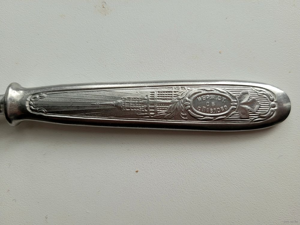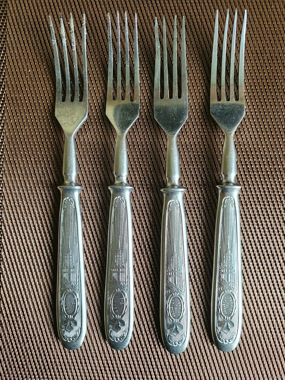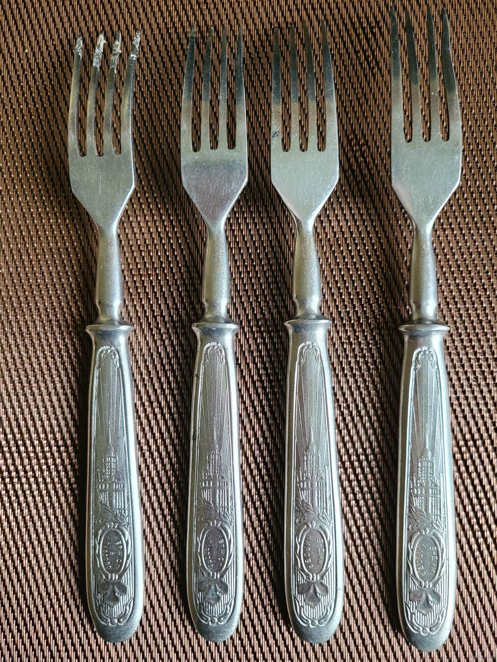 Вилки, нержавеющая сталь, 19 см, Павловский завод им. Кирова, клеймо советского периода с 1956 г. Художественное оформление рукоядки с изображением одной из сталинских высоток.