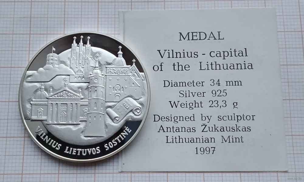 Литовский монетный двор. Зеркальное полированное покрытие (Пруф). Серебро 925 проба. Диаметр - 37 мм. Вес - 23,1 гр. Медаль в пластиковой капсуле. Оплата на карту Беларусбанка.