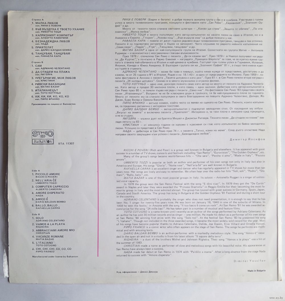 Виниловая пластинка ИТАЛЬЯНСКИЙ ХИТ- ПАРАД` 83. Балкантон.