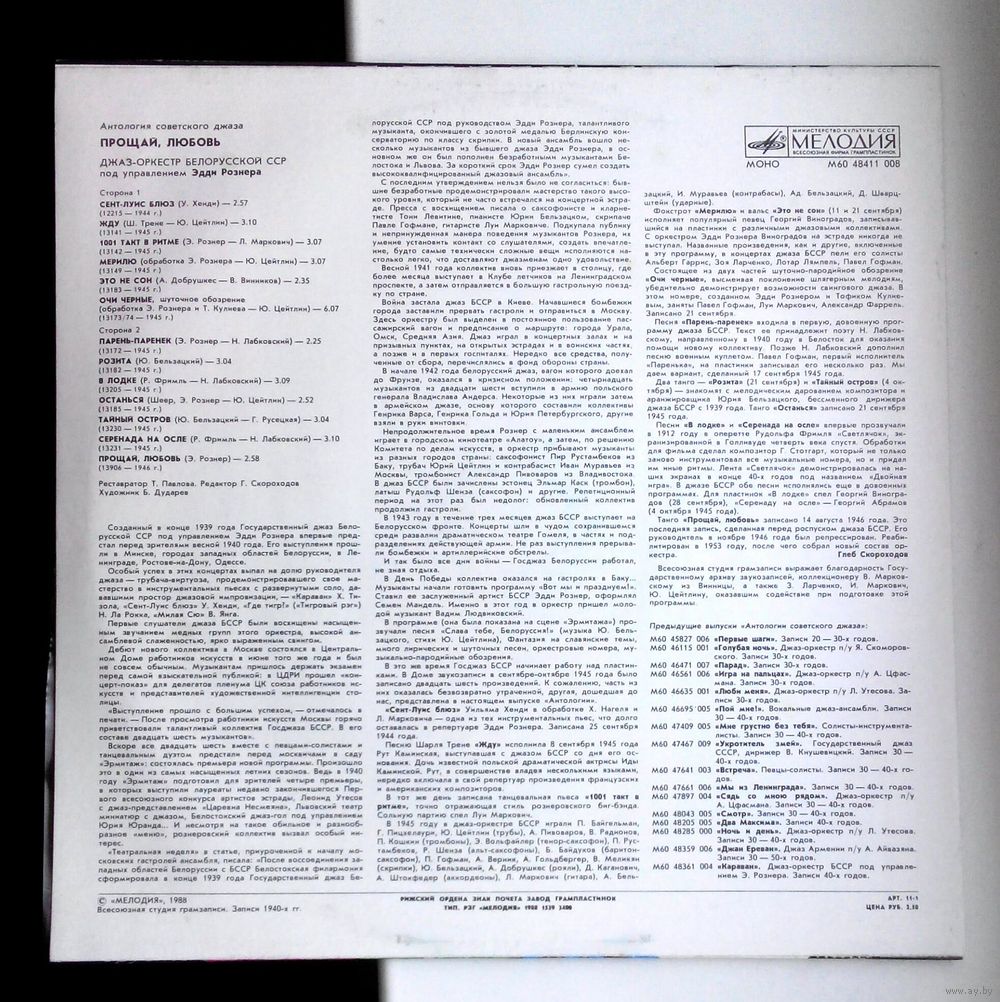 Виниловая пластинка (Ленинградский завод грампластинок, ,,Мелодия,,) Антология советского джаза ,,Прощай любовь,, Э.Рознер