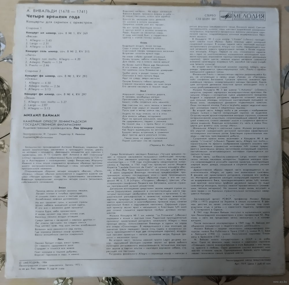 Это виниловая пластинка с записью цикла концертов «Времена года» Антонио Вивальди.