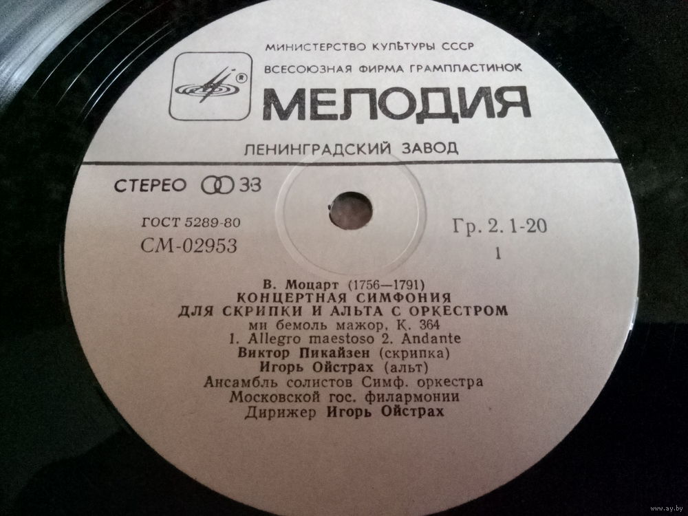 Виниловая пластинка В. МОЦАРТ. Концертная симфония для скрипки и альта с оркестром. (конверт отсутствует).