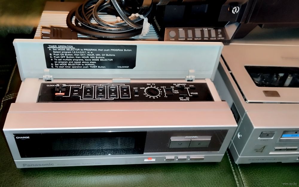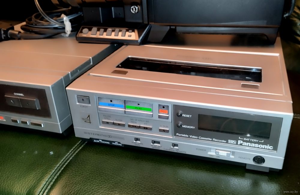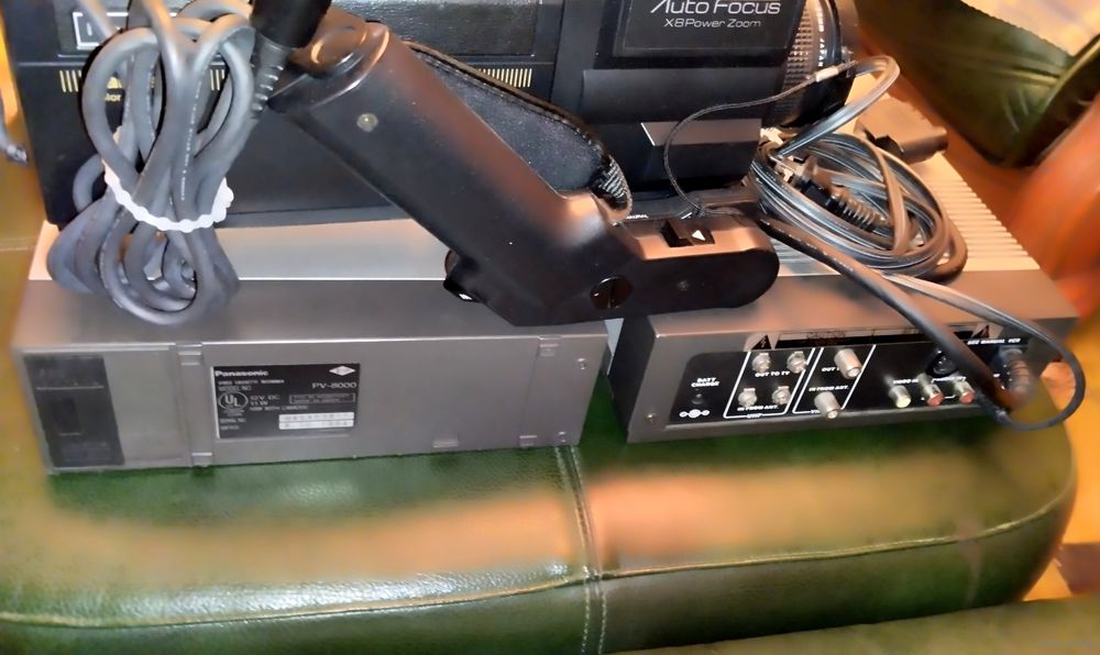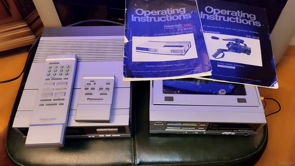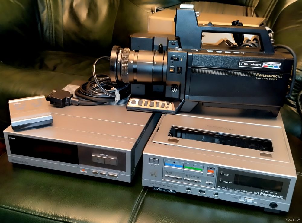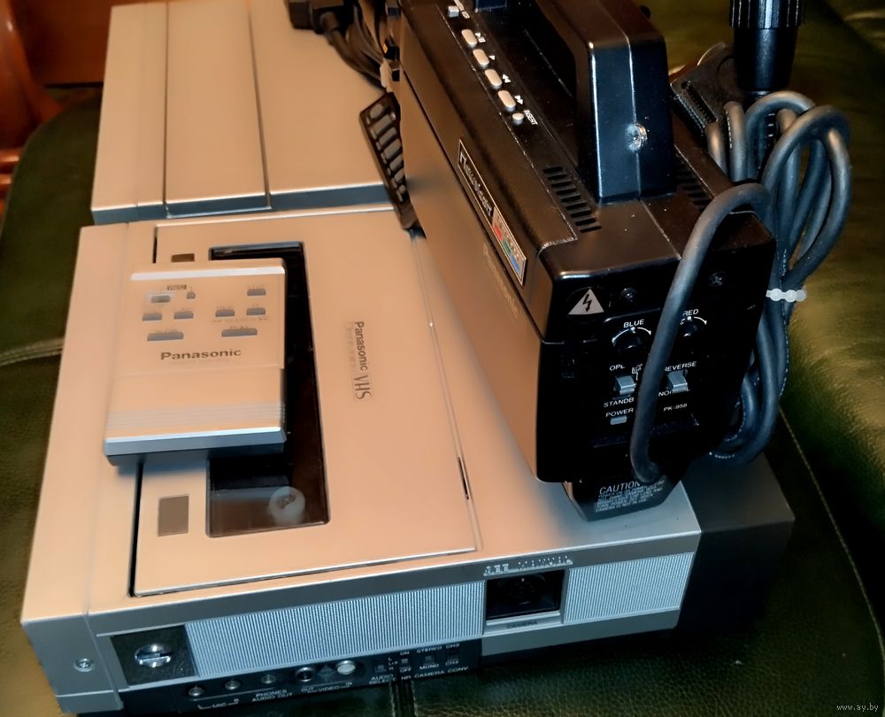 Винтаж 1984 Panasonic PV-8000/PV-A850 видеокомплект. Из Америки с 1990 года. 110в., NTSC. Включает в себя Стерео видеомагнитофон, програмируемый таймер. Видеокамера PK-958 с кабелем записи сразу на магнитофон (без кассет). Есть 2 оригинальных пульта и мануал. Сумка/кофр для камеры и чехол для переноски видеомагнитофона с ремешком в наличии. В работе практически на был. Состояние 10/10 кроме винила на сумках и поролона на микрофоне камеры.