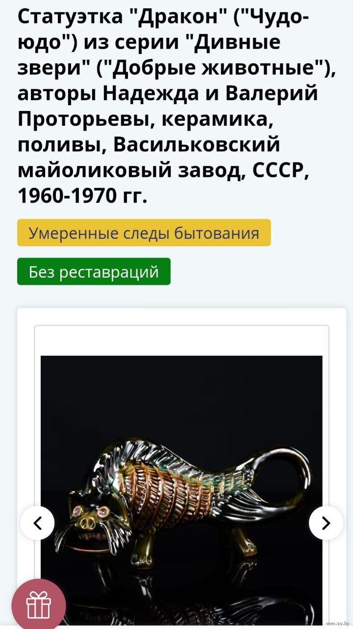 Описание: Состояние по фото. Обливная керамика. Имеется скол левого уха, малозаметные микроскольчики по туловищу Дракона. Статуэтка из серии "Дивные звери" ("Добрые животные"). Авторы: Валерий и Надежда Проторьевы.