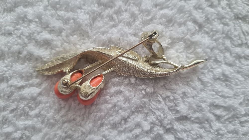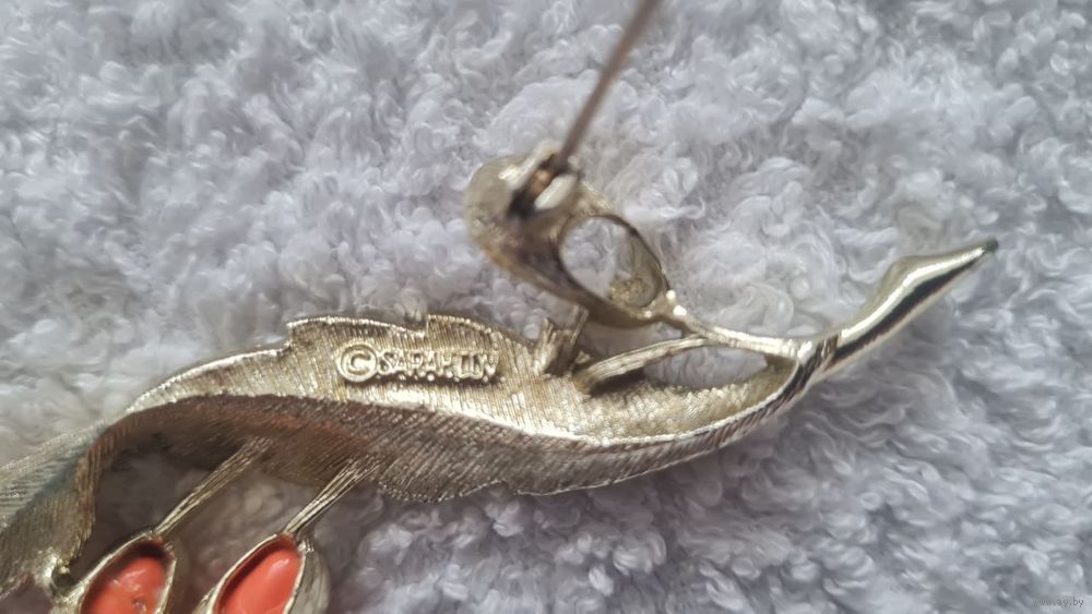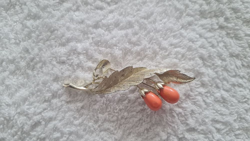 Винтажная брошь — модель «Bittersweet» от бренда Sarah Coventry, выполненная в золотистом тоне с оранжевыми вставками из люцита, имитирующими кораллы. 1960е г
