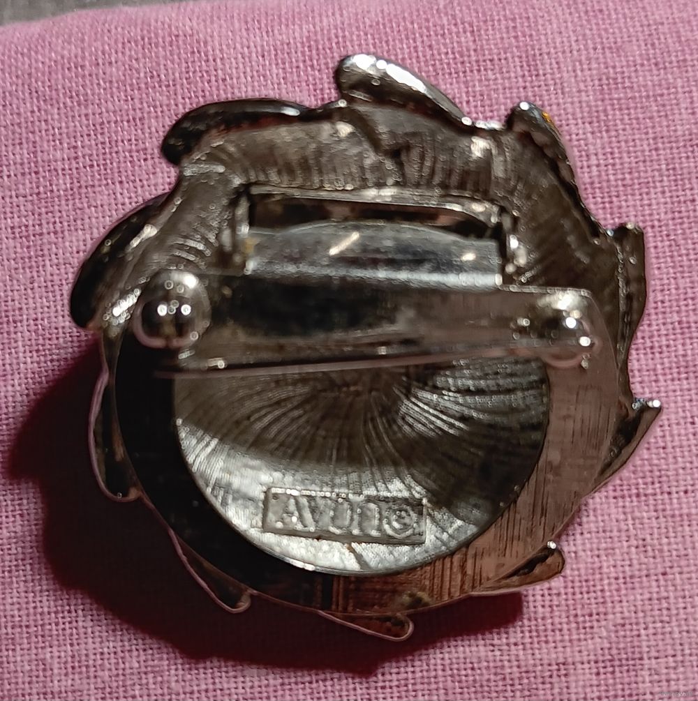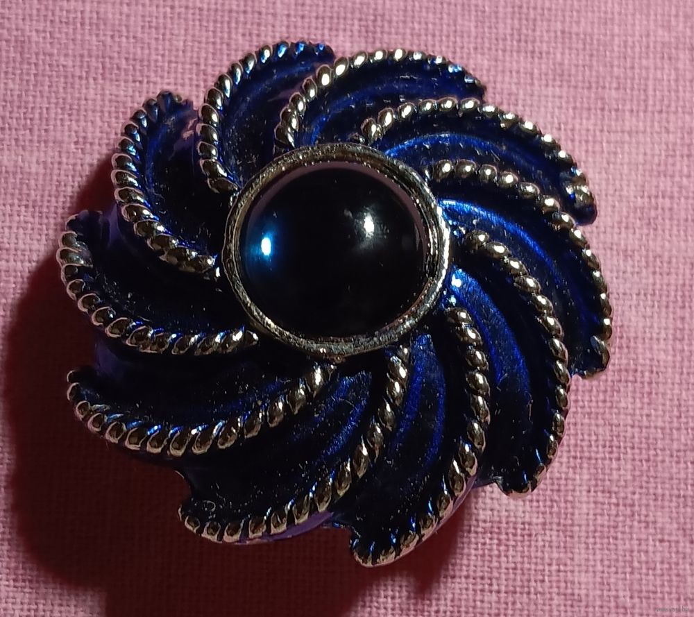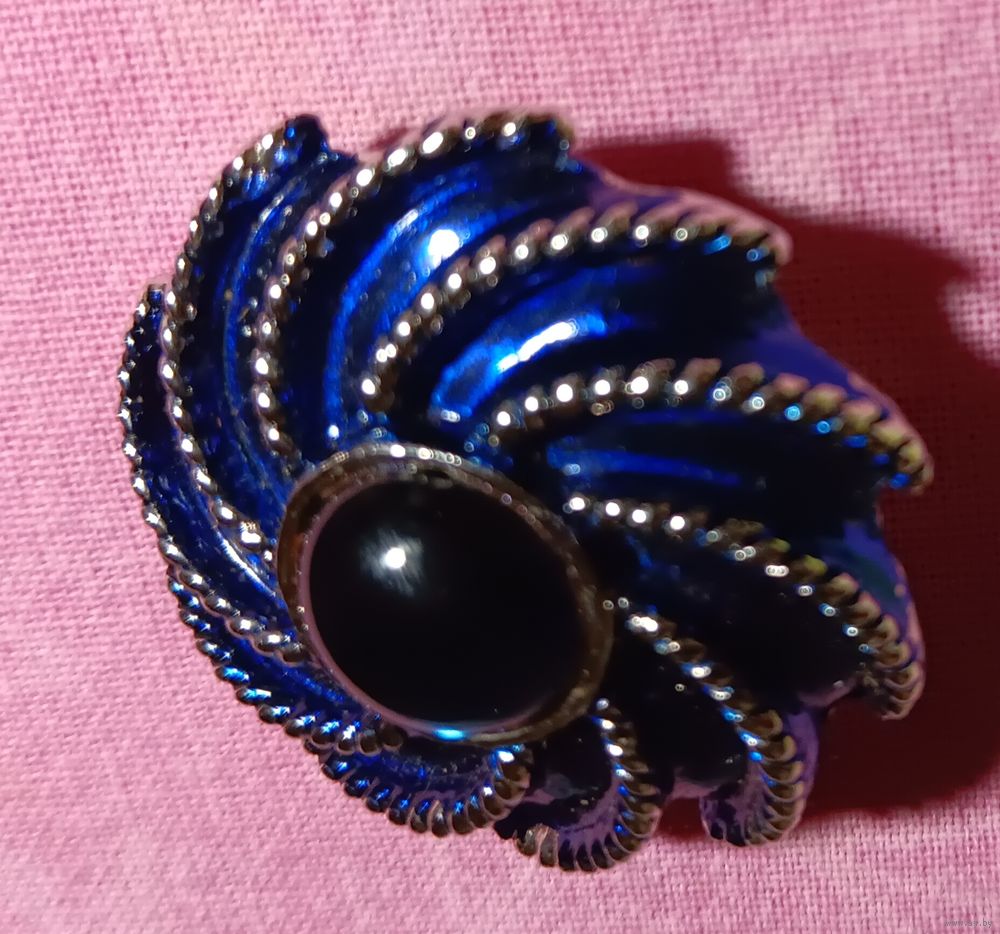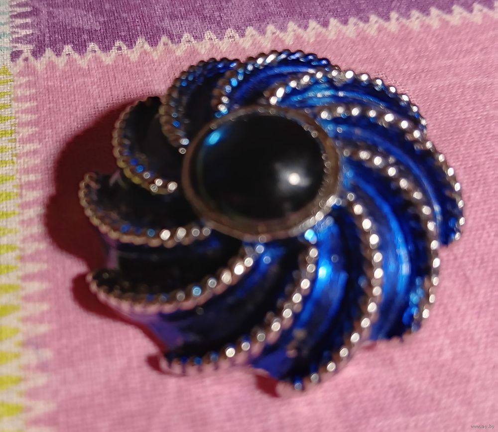 | Тёмно-синяя эмаль, кабошон глубокого синего цвета, ювелирный сплав серебристого цвета. Имеется одна 3 мм царапина на эмали. Других дефектов нет. | |