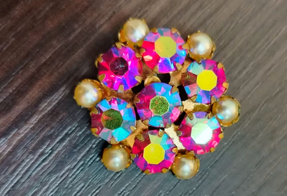 Винтажная брошь , украшена кристаллами и камнями с эффектом Aurora Borealis (северное сияние ) в хорошем состоянии без потерь камешков и с защелкой рабочей