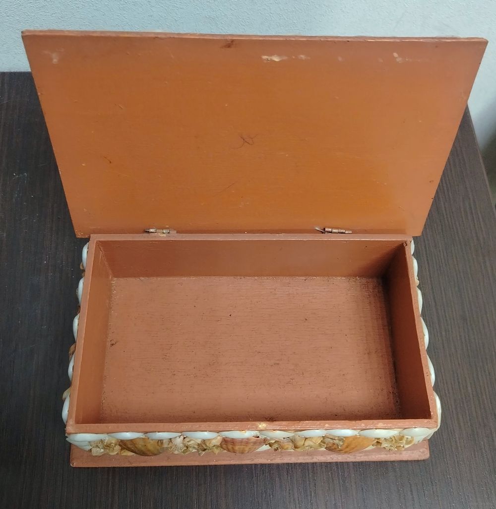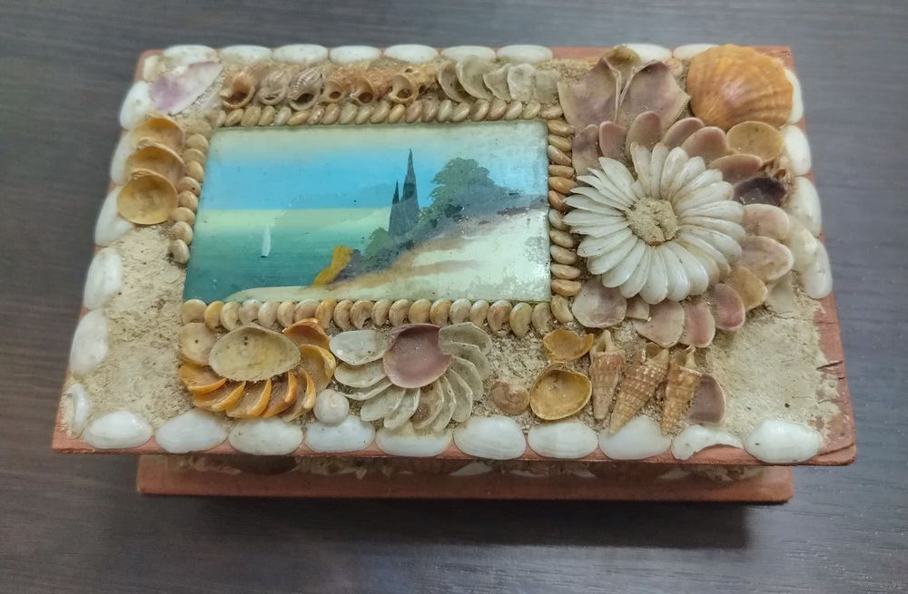Винтажная деревянная шкатулка , ручная работа , обклеена ракушкой , на верхней крышке картинка под стеклом . размеры 22 на 6.5 см вес. 520 грамм . состояние хорошее Б/У .