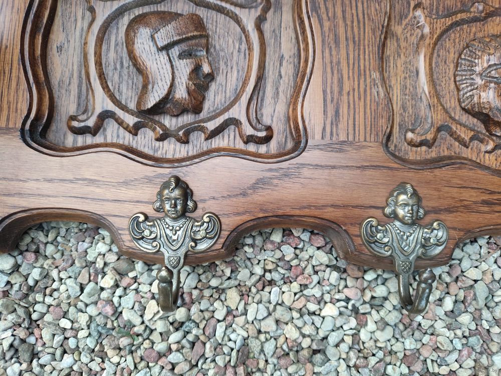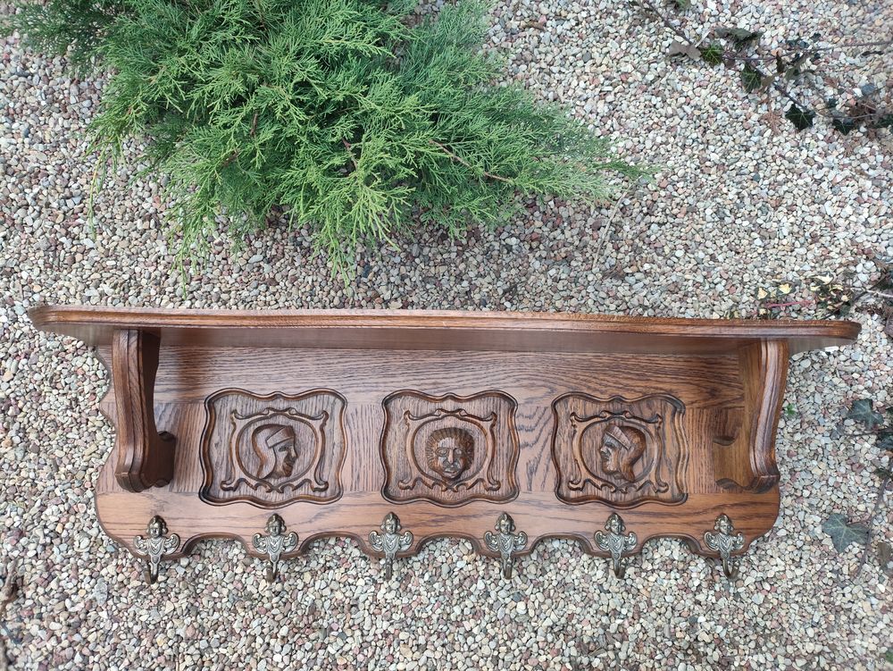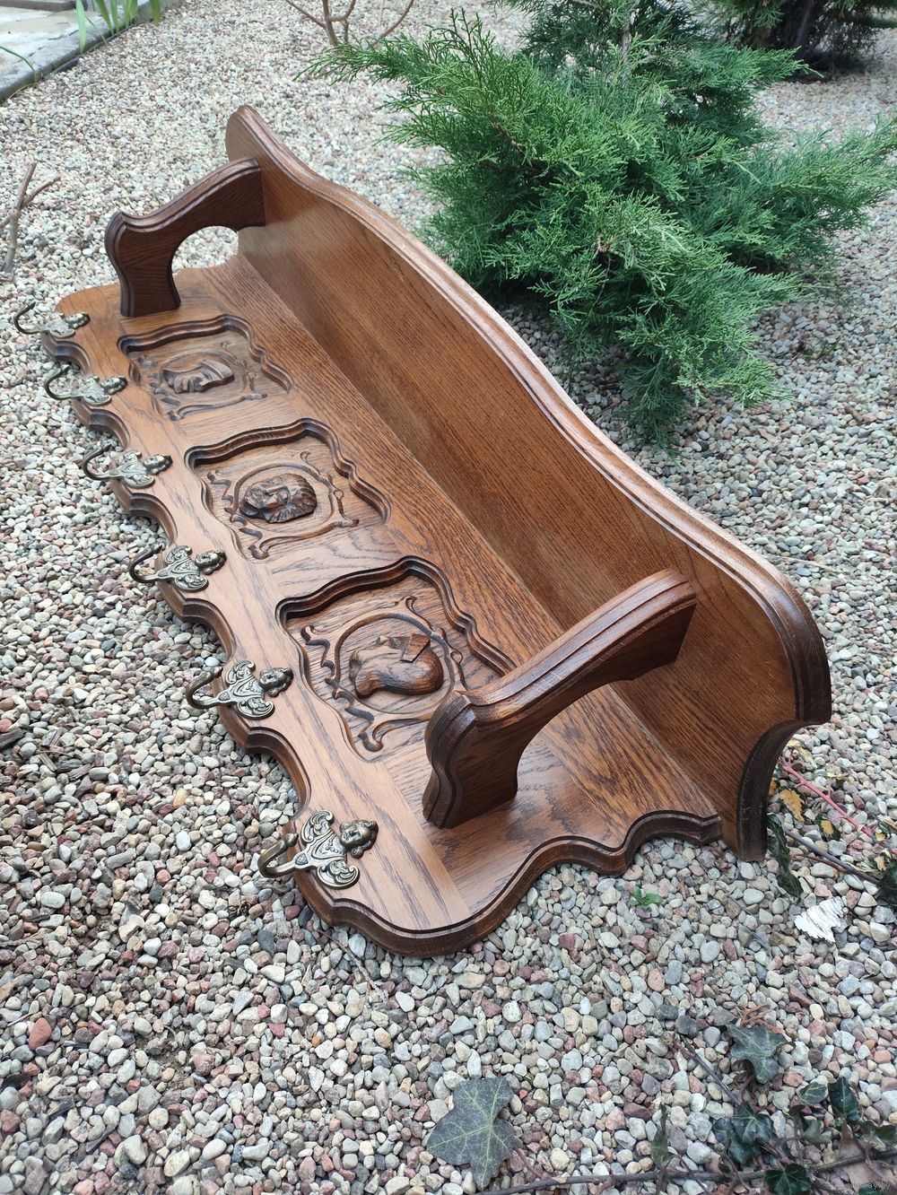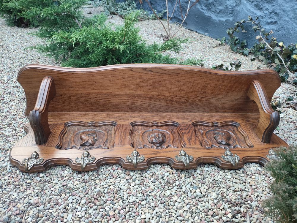 Вешалка выполнена из массива дуба с декоративными резными панелями, изображающими персонажей.