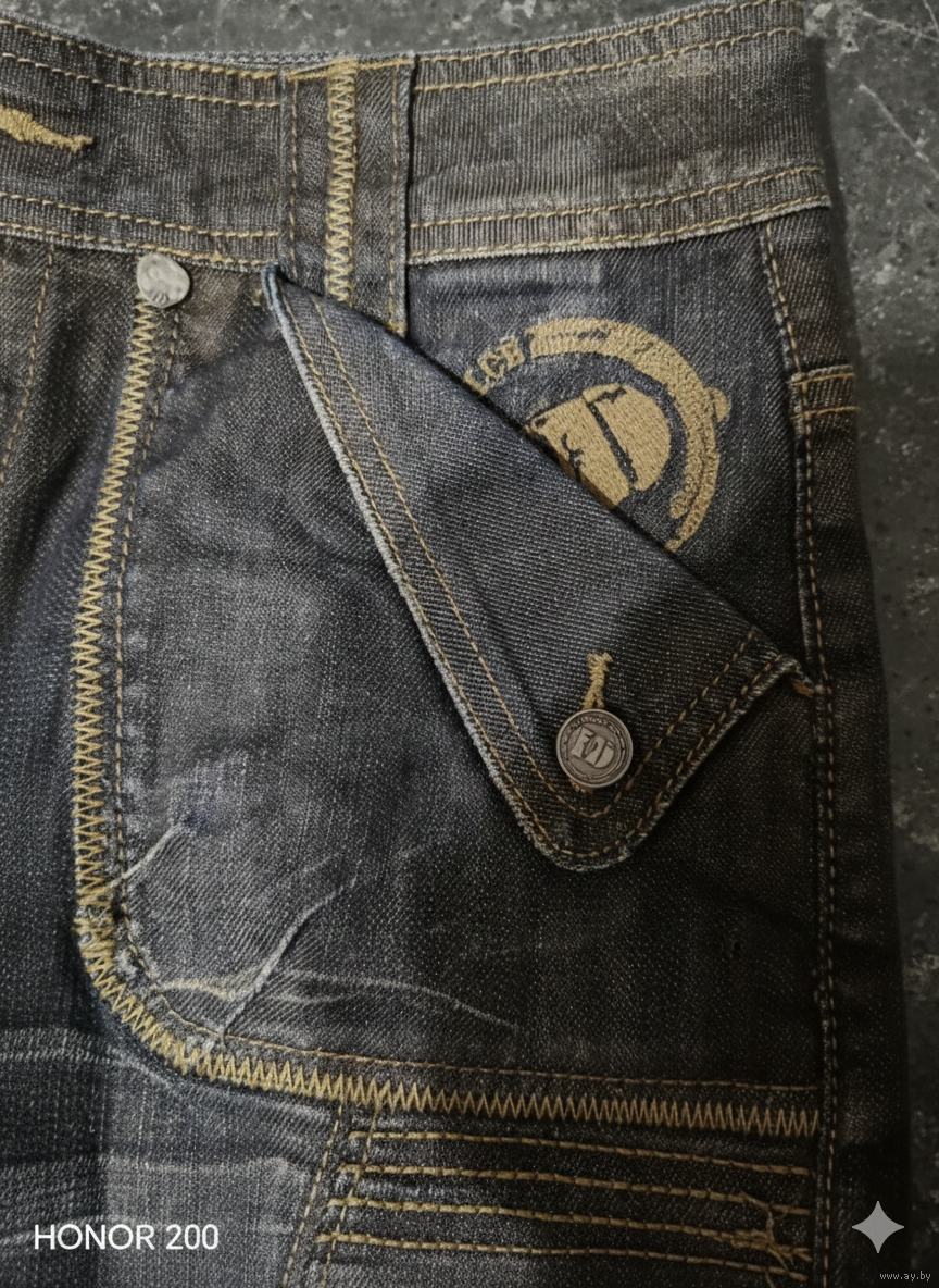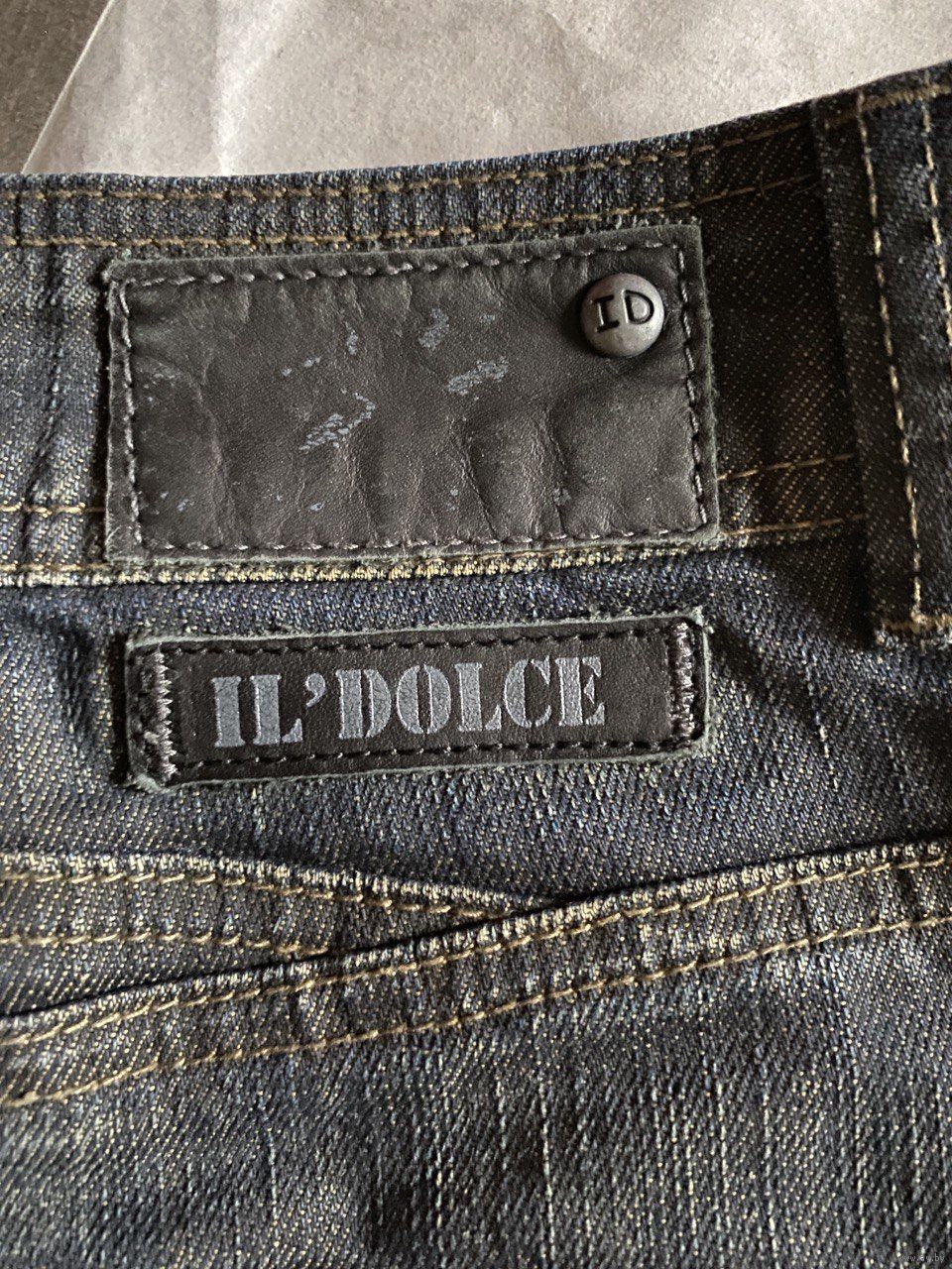 Темный деним от итальянского бренда IL’DOLCE с идеальной контрастной строчкой и массивными накладными карманами в стиле Diesel. Брендированная фурнитура «ID» и кожаный патч сзади. Посадка от низкой до средней (зависит от вашего размера). Тяжелый, качественный деним, а не тонкий масс-маркет.