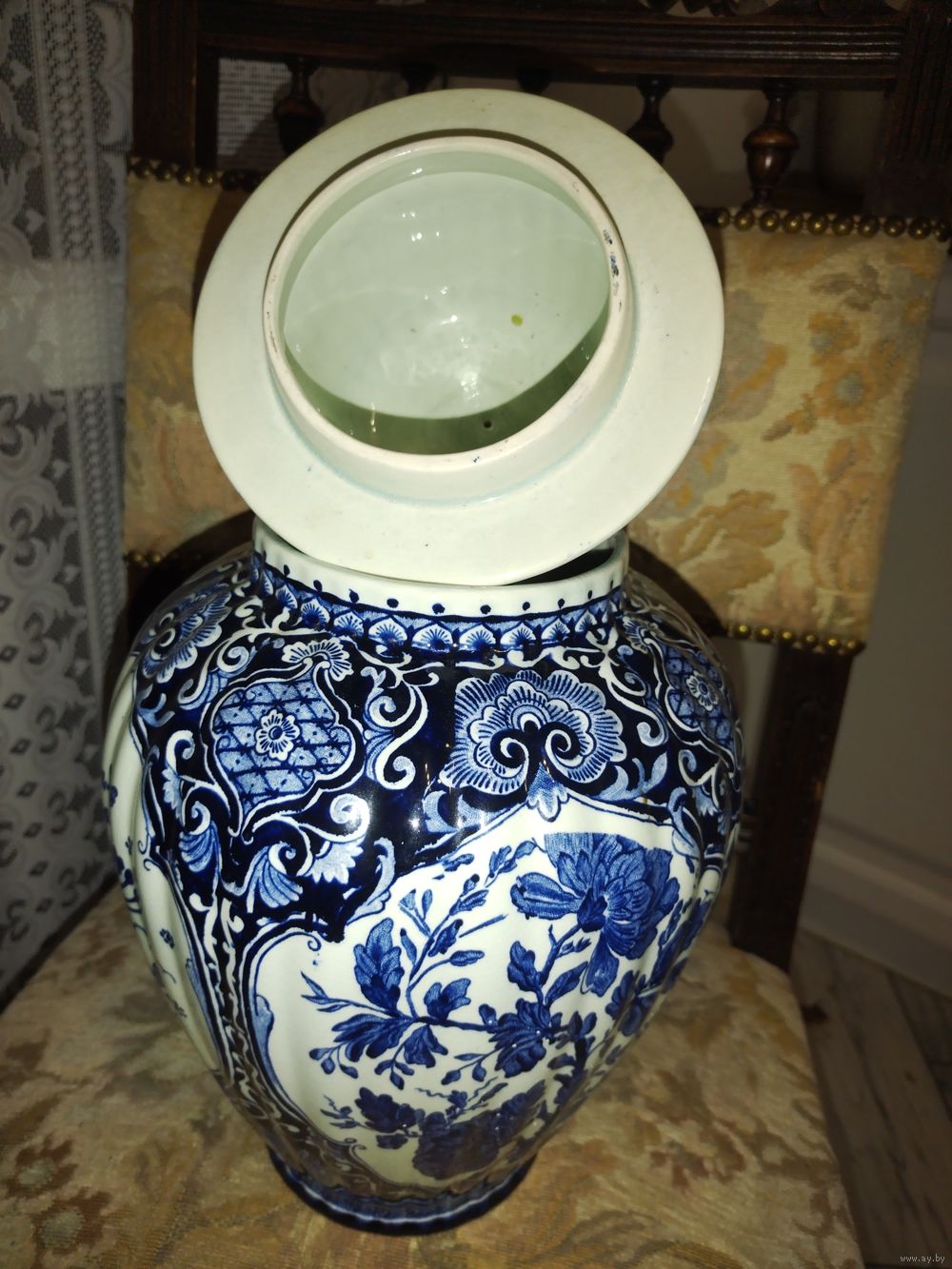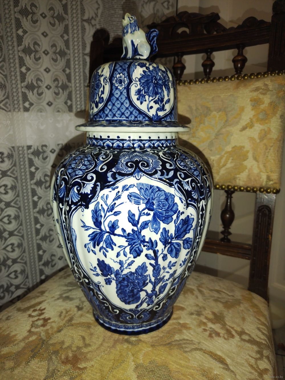 Голандия. Делфтская ваза-балюстрада Royal Sphinx. Фоянс. Вторая половина прошлого века, или старше.. . Ручная роспись. Рельефные стенки. Высота с крышкой 38, без 26,.широкая и часть 20см. Основание и горлышко 11 см. В отличном состоянии.
