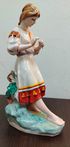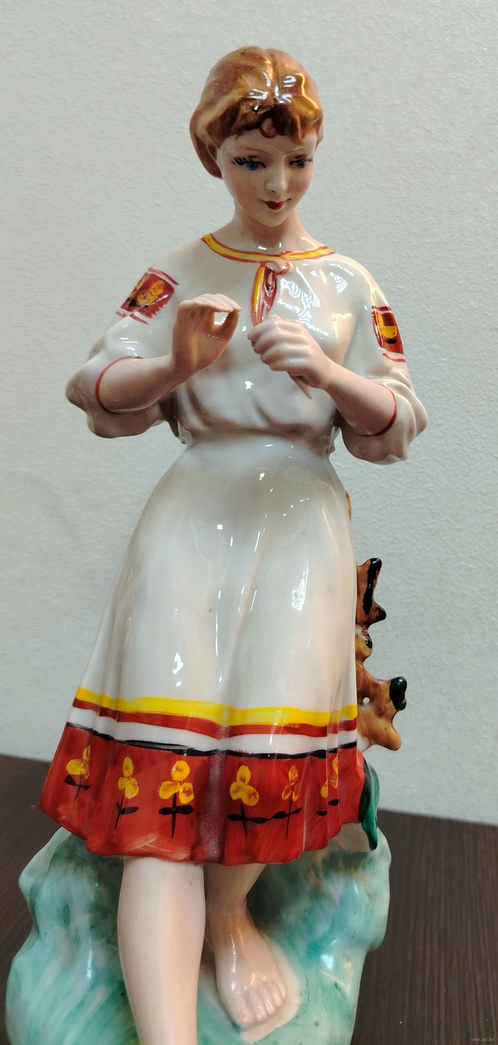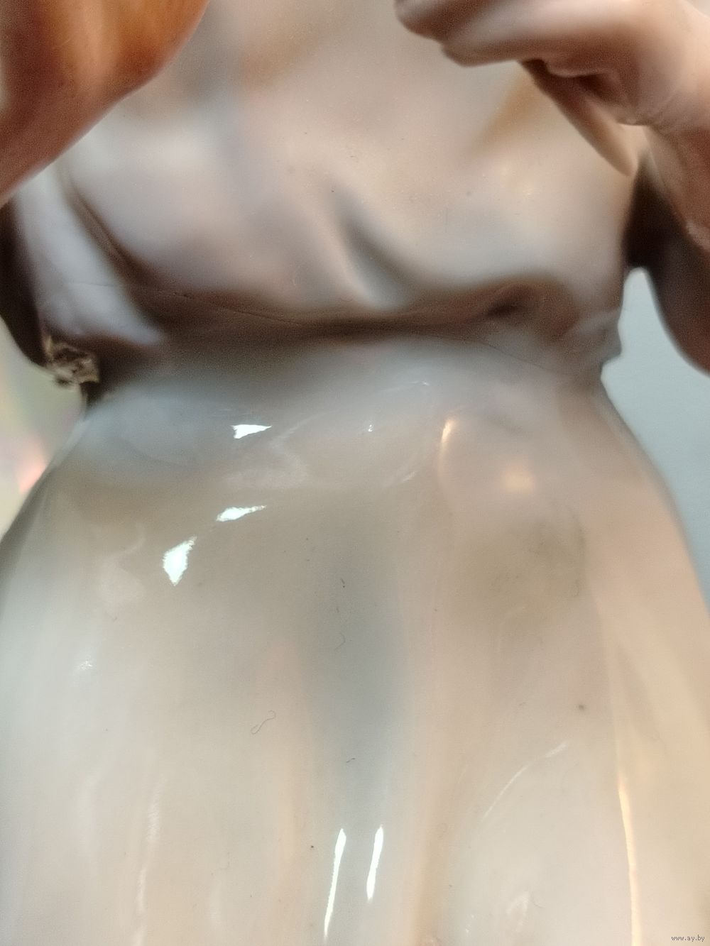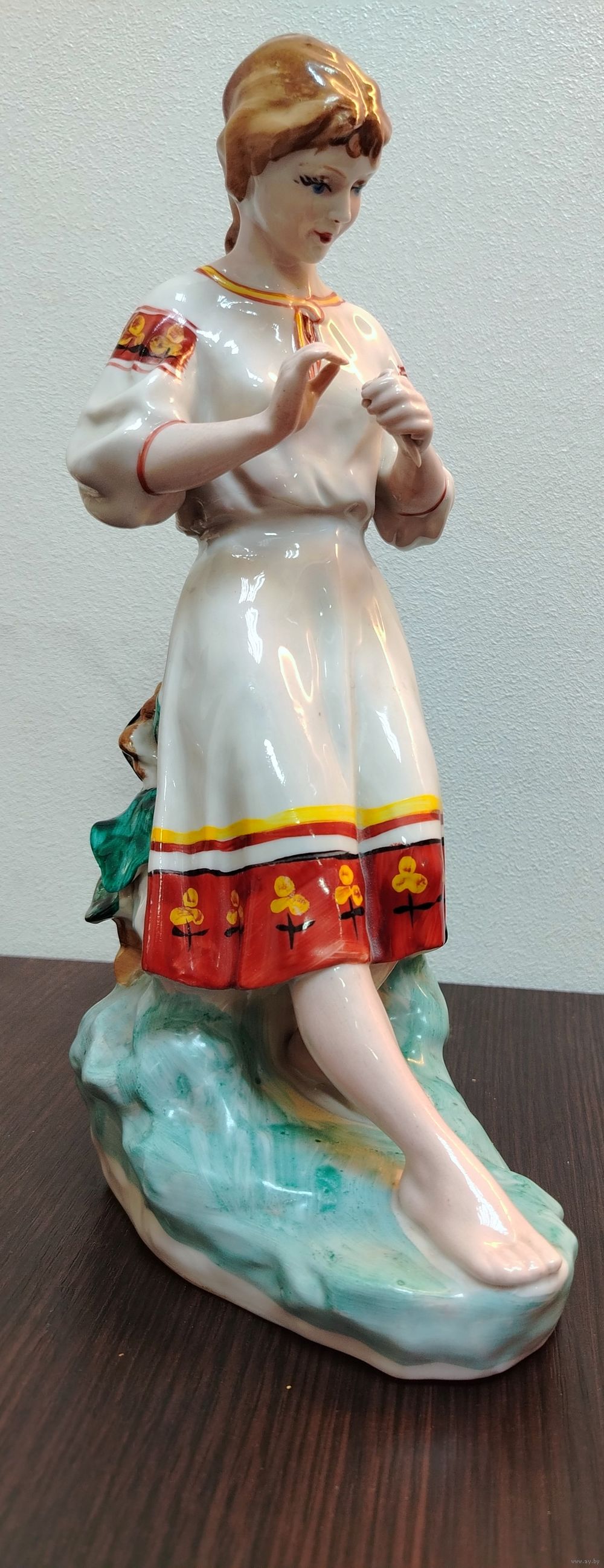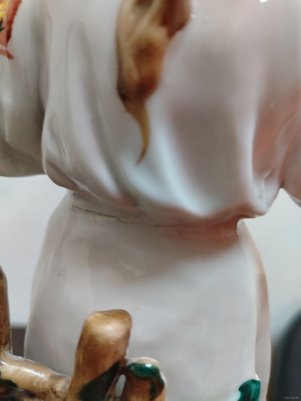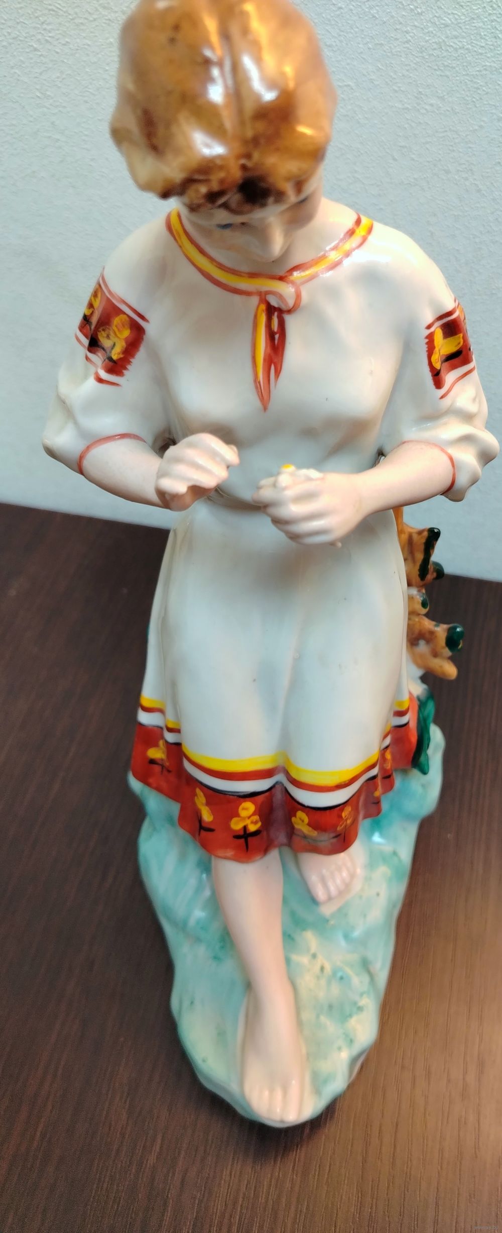 Фарфоровая статуэтка Гадание на цветке в хорошем состоянии без сколов потерь , не критическая трещина по кругу пояса . идеально подойдет в виде презента , подарка , или предмет декора. Размеры высота 30см ширина 15см .