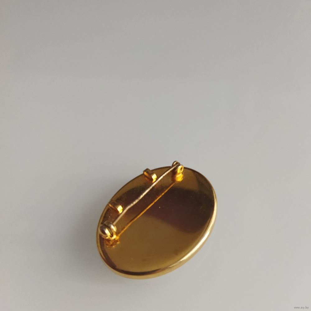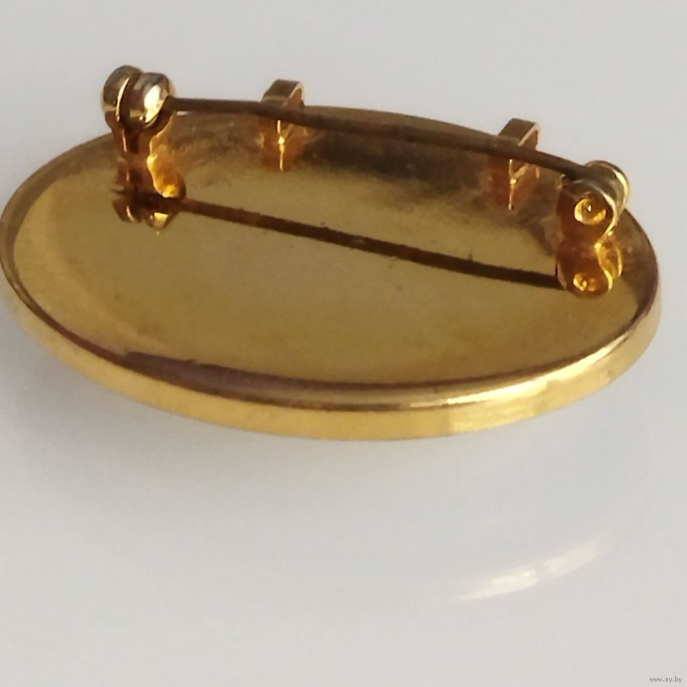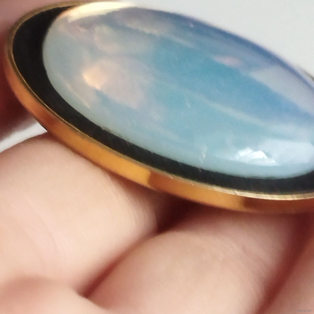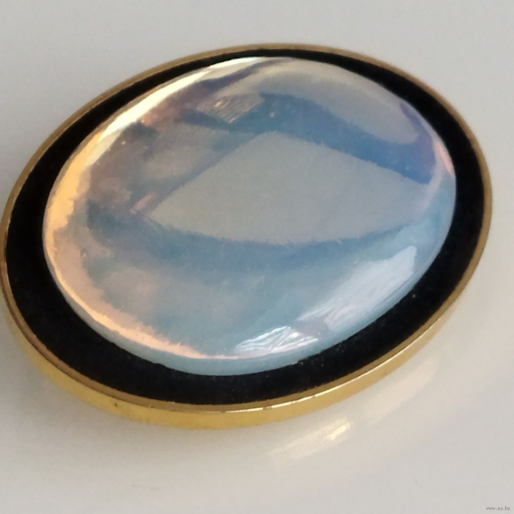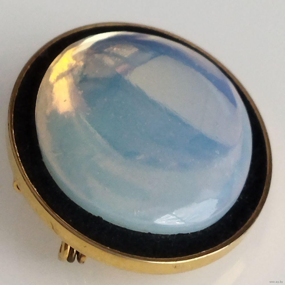 Овальный кабошон из опалита ( имитация лунного камня) с высокой прозрачностью и специфическим свечением и бликами при определенном освешении.Оправа- позолоченная рамка с темным внутренним контуром. Из Германии. Винтаж.