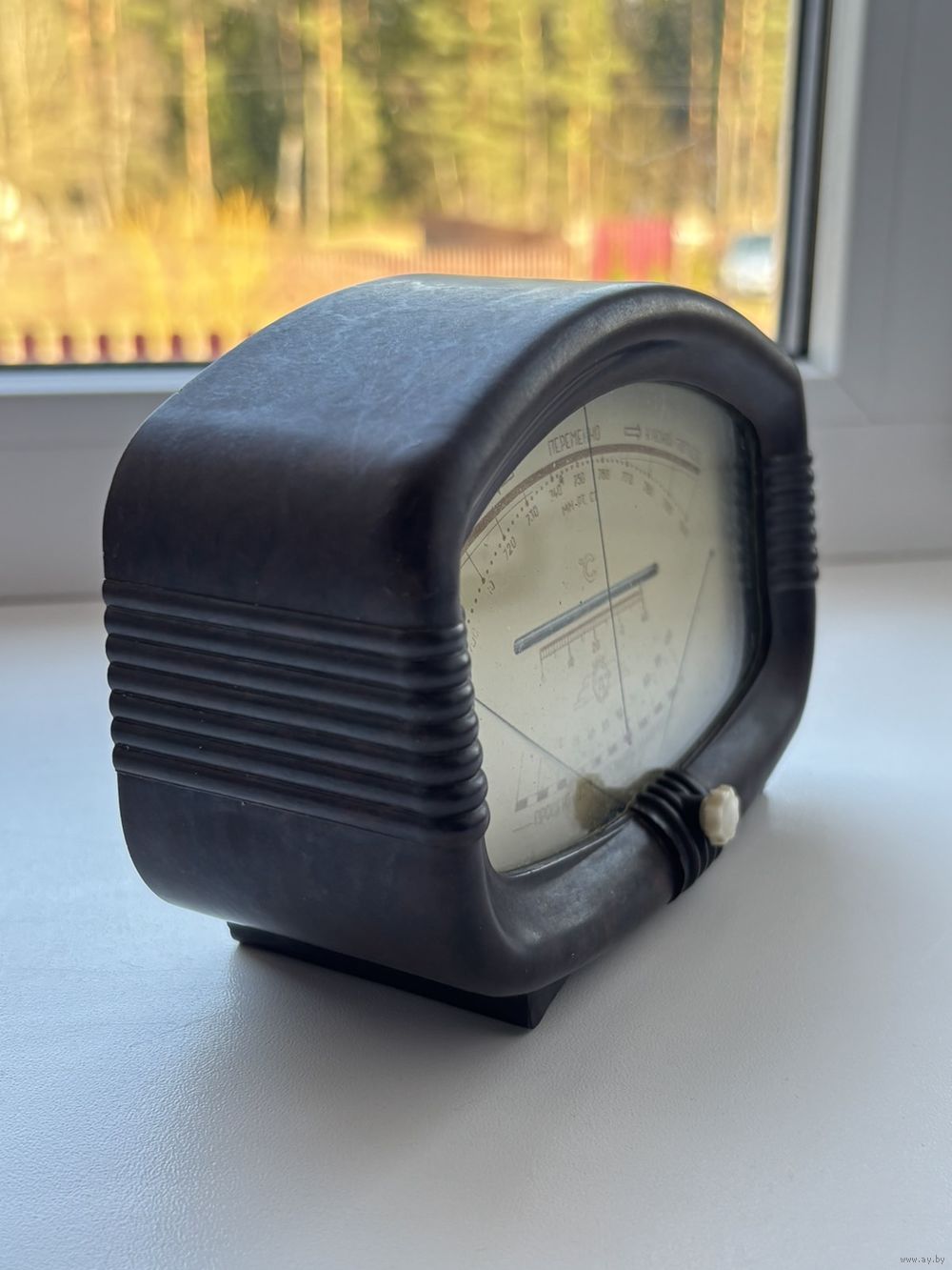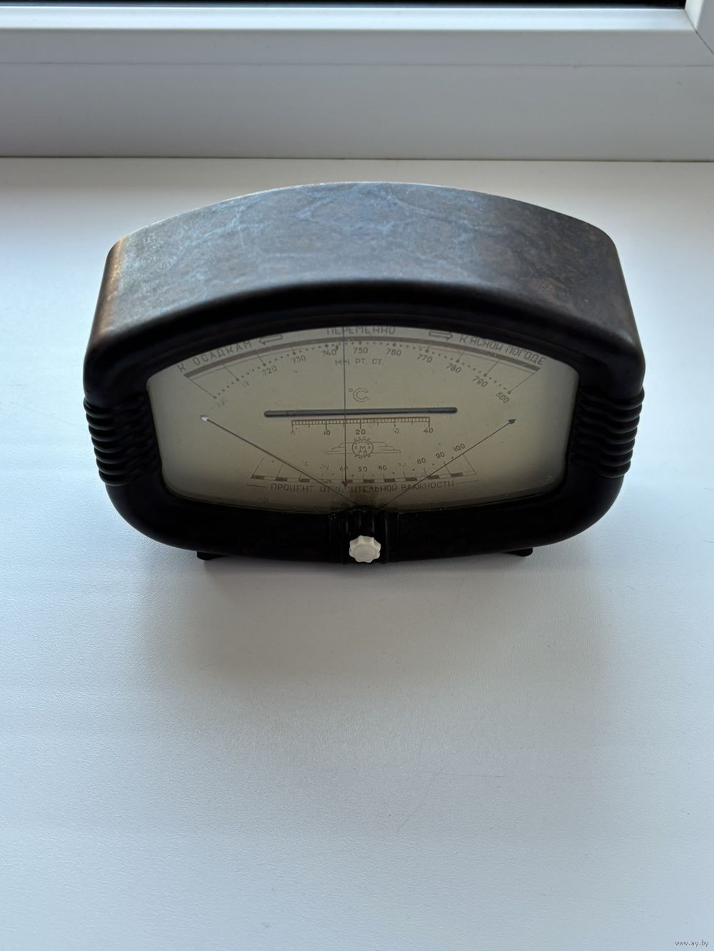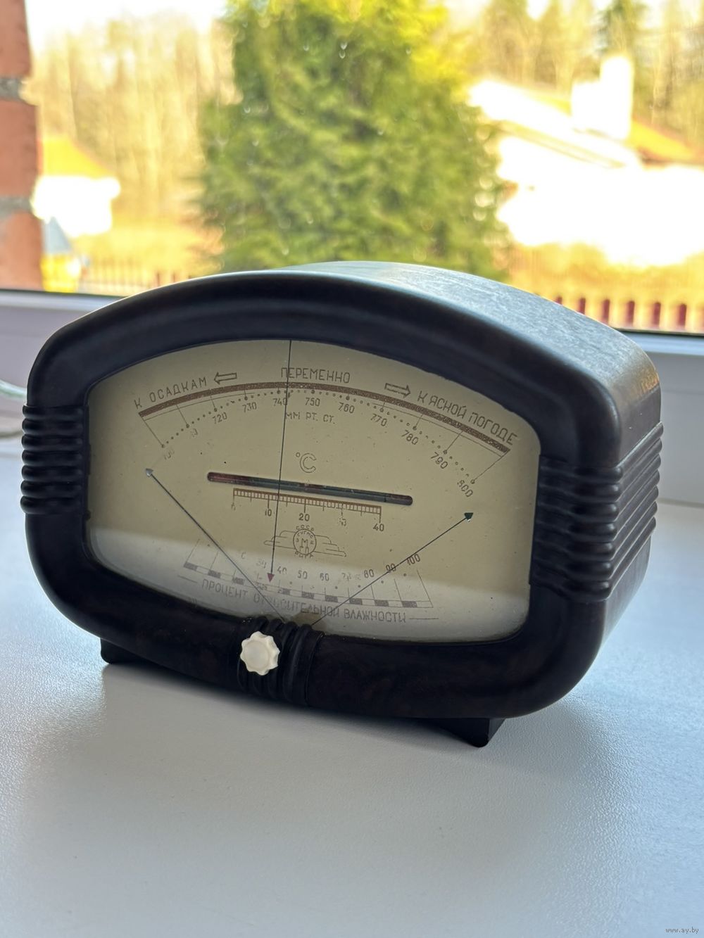 ИНФОРМАЦИЯ ПО ДАННОМУ ПРИБОРУ ЕСТЬ В ИНЕТЕ. БАРОМЕТР, ГИГРОМЕТР, ТЕРМОМЕТР В ОДНОМ ПРИБОРЕ. КОРПУС - КАРБОЛИТ (ранний вид пластмассы), ХАРАКТЕРНЫЙ ДЛЯ ПРЕДМЕТОВ ИНТЕРЬЕРА ТОЙ ЭПОХИ. САМ КОРПУС И ЗАЩИТНОЕ СТЕКЛО В ИДЕАЛЕ. ПО ИСПРАВНОСТИ НЕ СКАЖУ (не специалист). ИНТЕРЬЕРНЫЙ ПРЕДМЕТ СТАЛИНСКОЙ ЭПОХИ!!! РЕДКОСТЬ!!! СВЯЗЬ : ТЕЛЕФОН, ВАЙБЕР!!!
