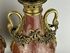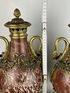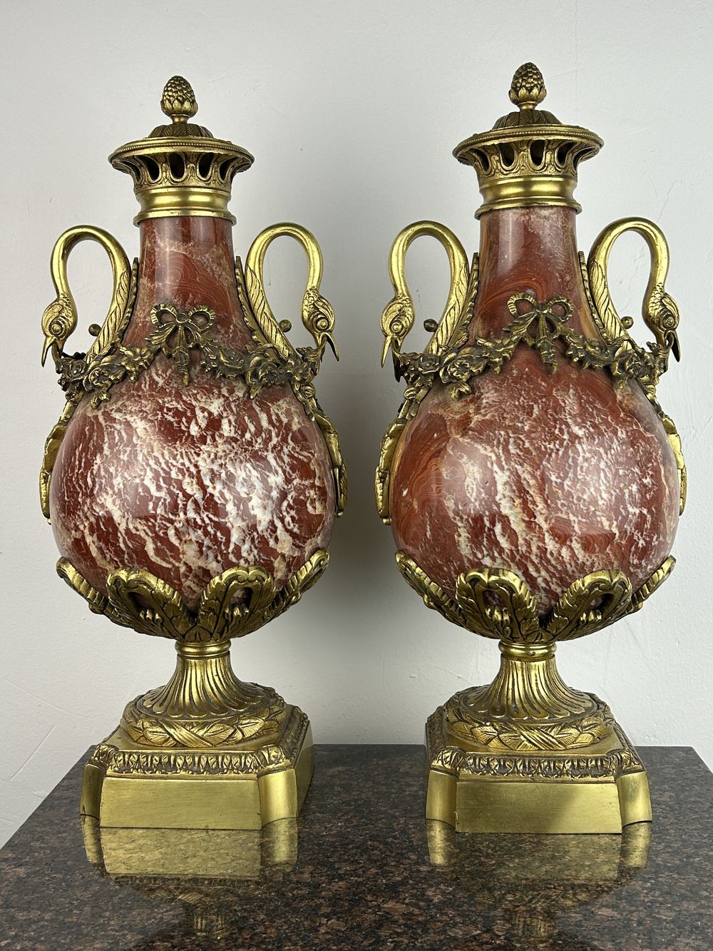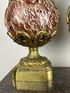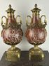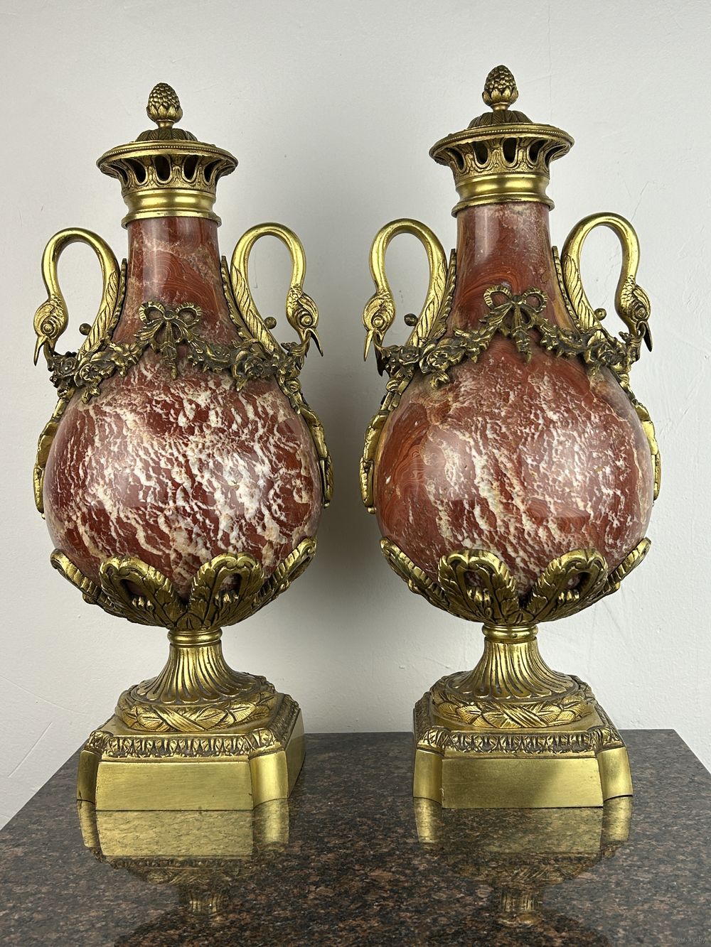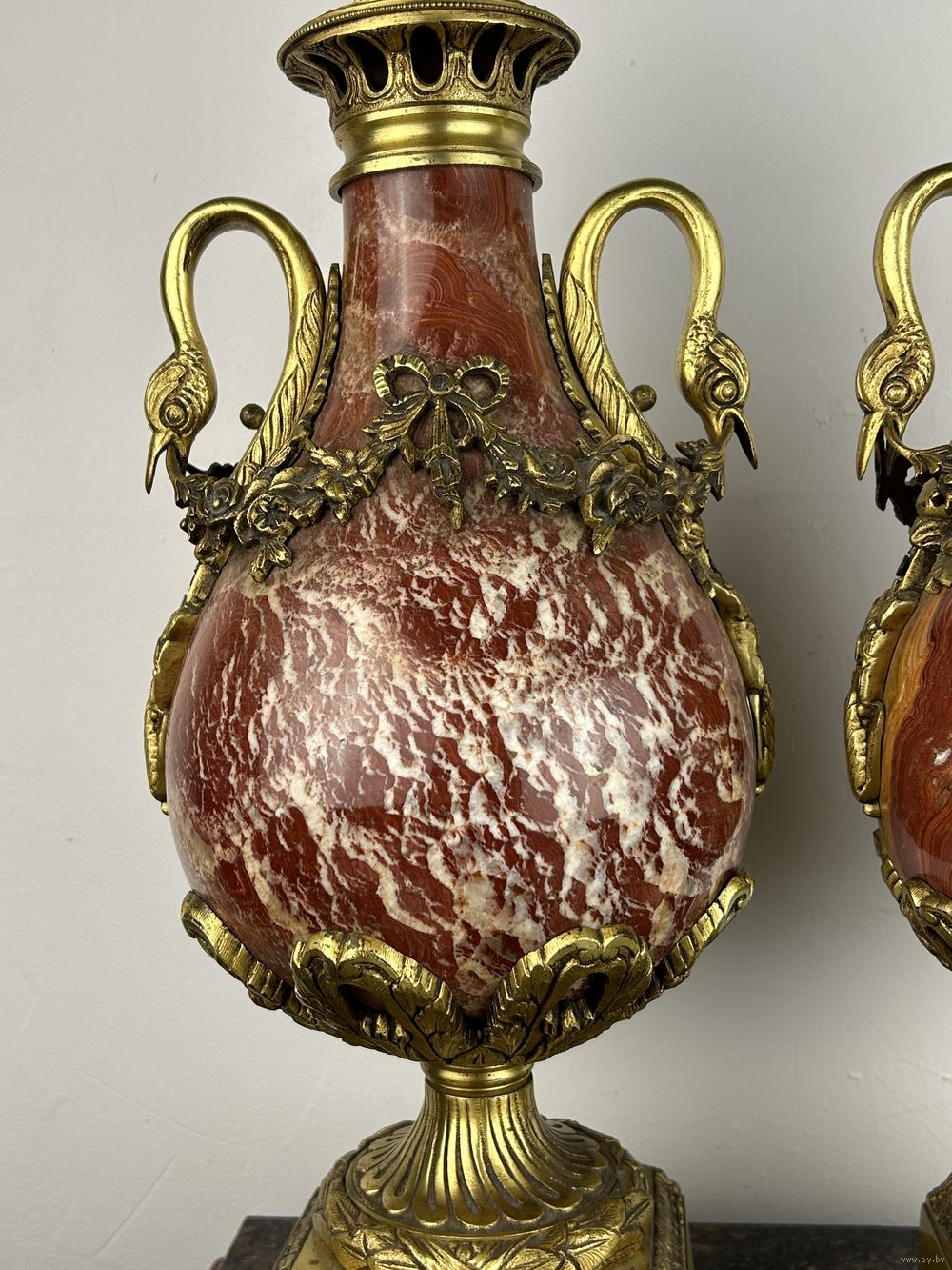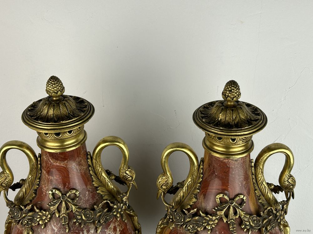 Декоративная ваза из мрамора темно-красного цвета с бронзовыми деталями, включая ручки в виде голов птиц и декоративный фриз.