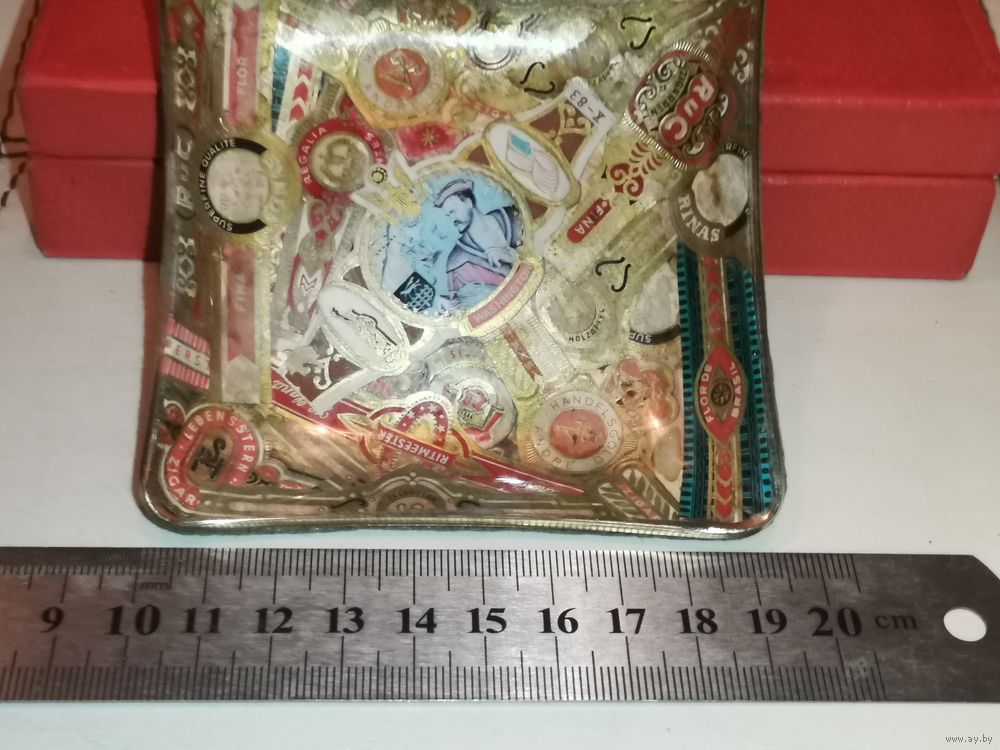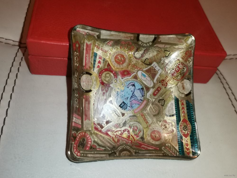 Винтажная пепельница с этикетками брендов от сигар и сигарет, залитая огнестойким лаком, размер 9*9 см.
