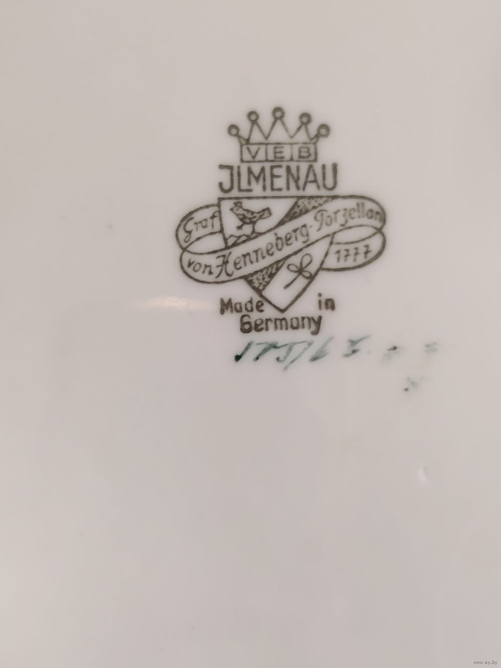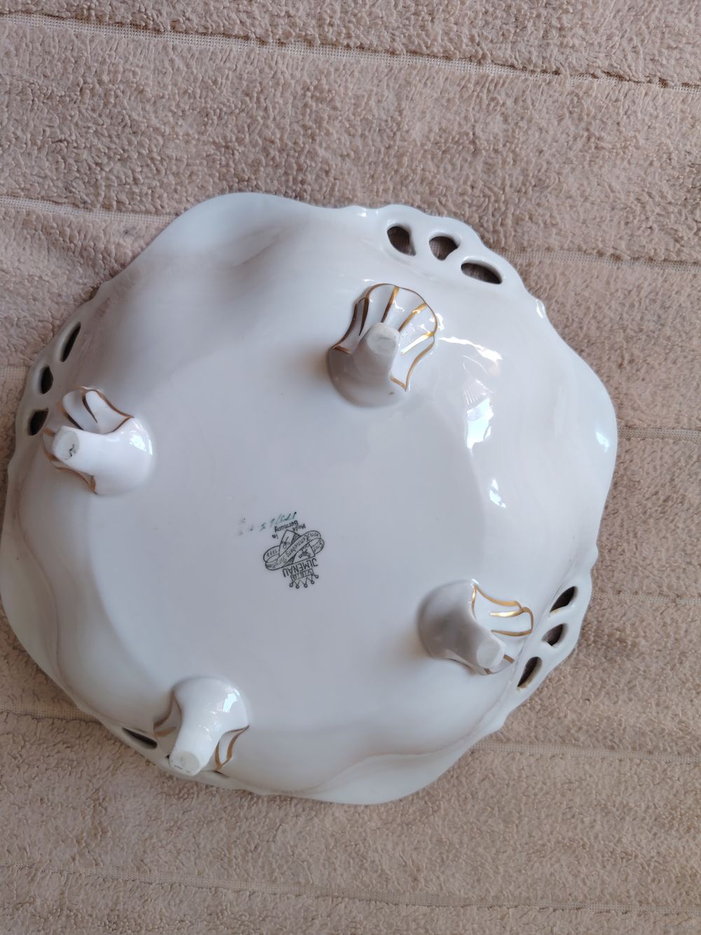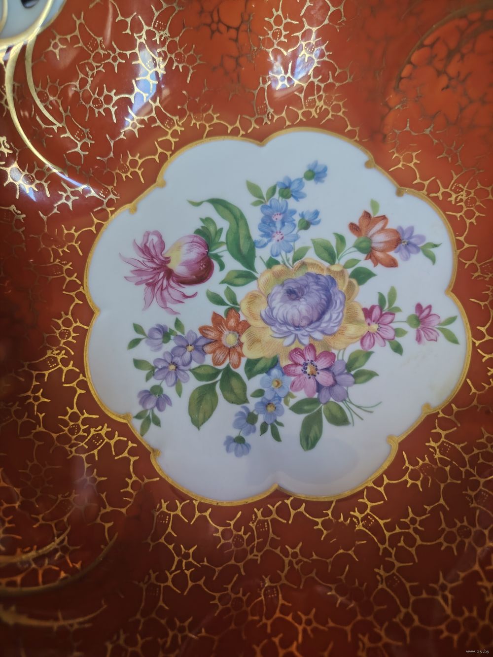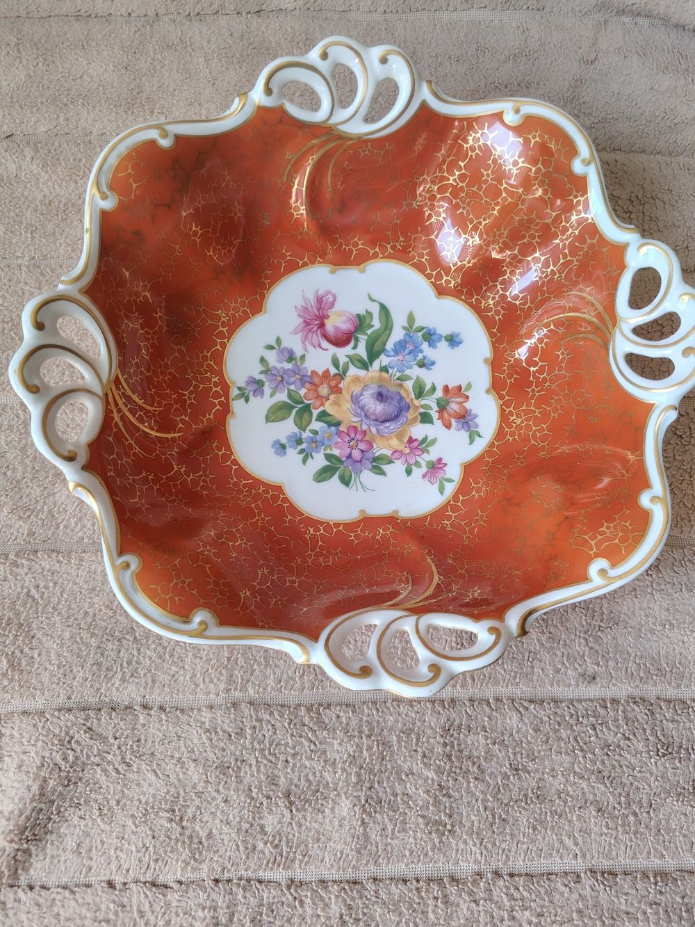 Винтажное фарфоровое блюдо (фруктовница или сухарница) немецкой мануфактуры Jlmenau (Ильменау), также известной как Graf von Henneberg Porzellan, Германия. Изделие украшено богатым золочением в технике «травленка» (золотая сеточка на цветном фоне) и центральным медальоном с цветочным букетом в стиле «Мейсен».