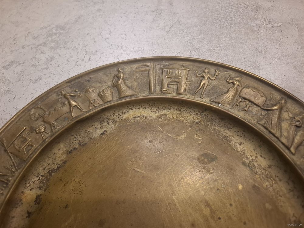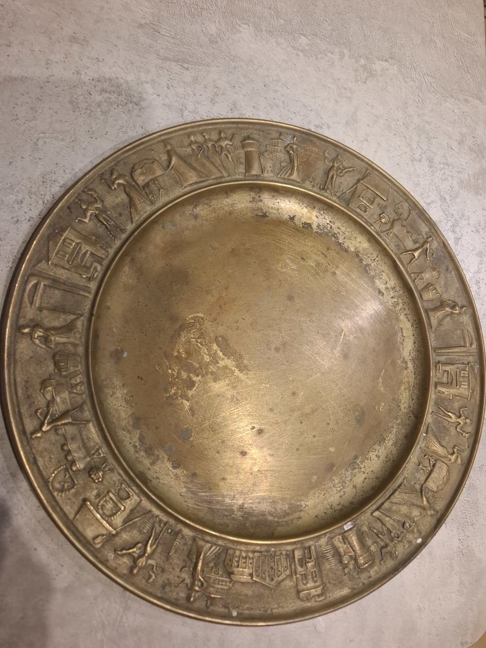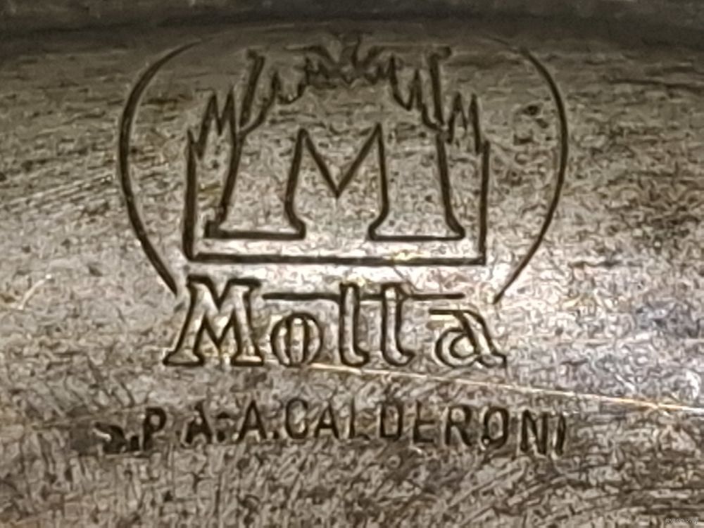 Заголовок: Винтажное блюдо Motta & Calderoni (Милан, 1950-е), 25 смРедкое коллекционное блюдо, созданное в середине XX века в Италии. Предмет представляет собой историческую коллаборацию знаменитого кондитерского дома Motta и престижной миланской мастерской Fratelli Calderoni (S.P.A. Calderoni) — одного из старейших производителей столового серебра в Европе.Дизайн: Широкий борт украшен детальным барельефом с панорамой главных символов Милана: Миланский собор (Дуомо), замок Сфорца, Триумфальная арка и сцены из жизни города.Материал: Посеребренная латунь / альпака.Клеймо: На обратной стороне четкое оригинальное клеймо "Motta" и "S.P.A. Calderoni".Параметры: Диаметр — 25 см, вес — 292 г.Состояние:
