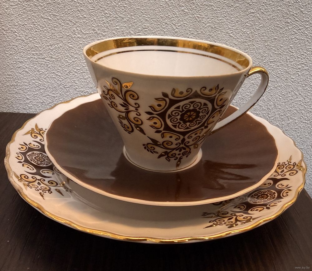 В комплекте: чашка, блюдце и десертная тарелка.