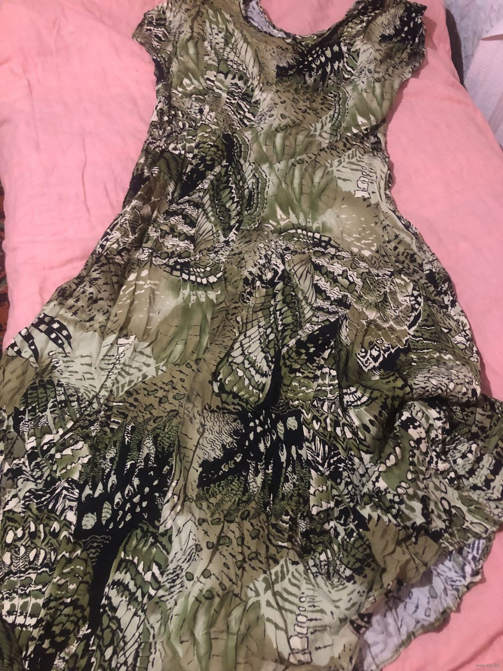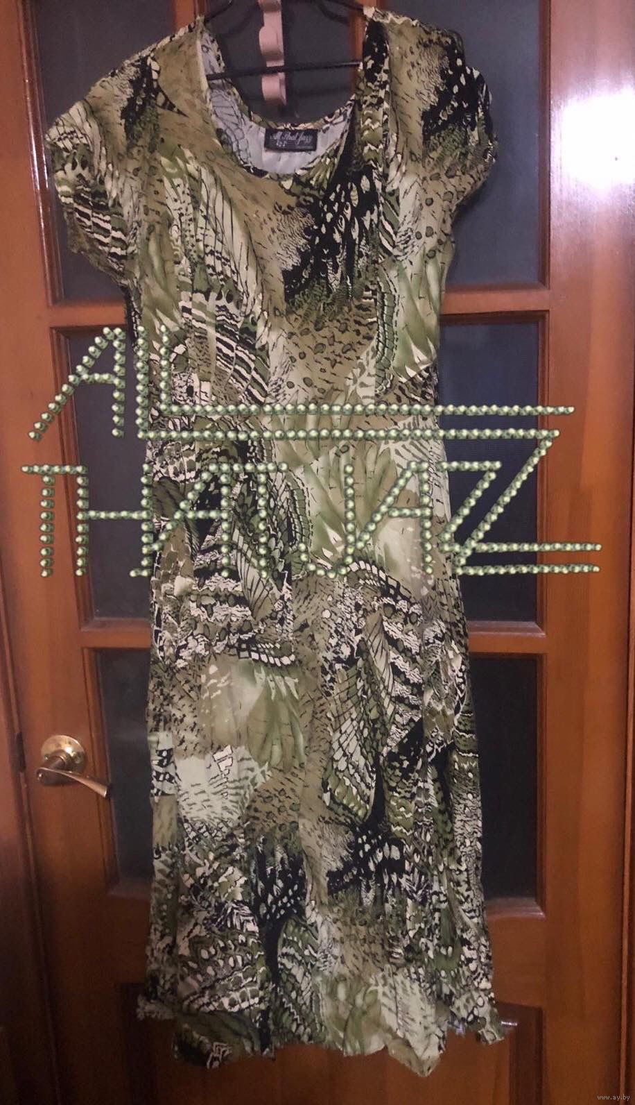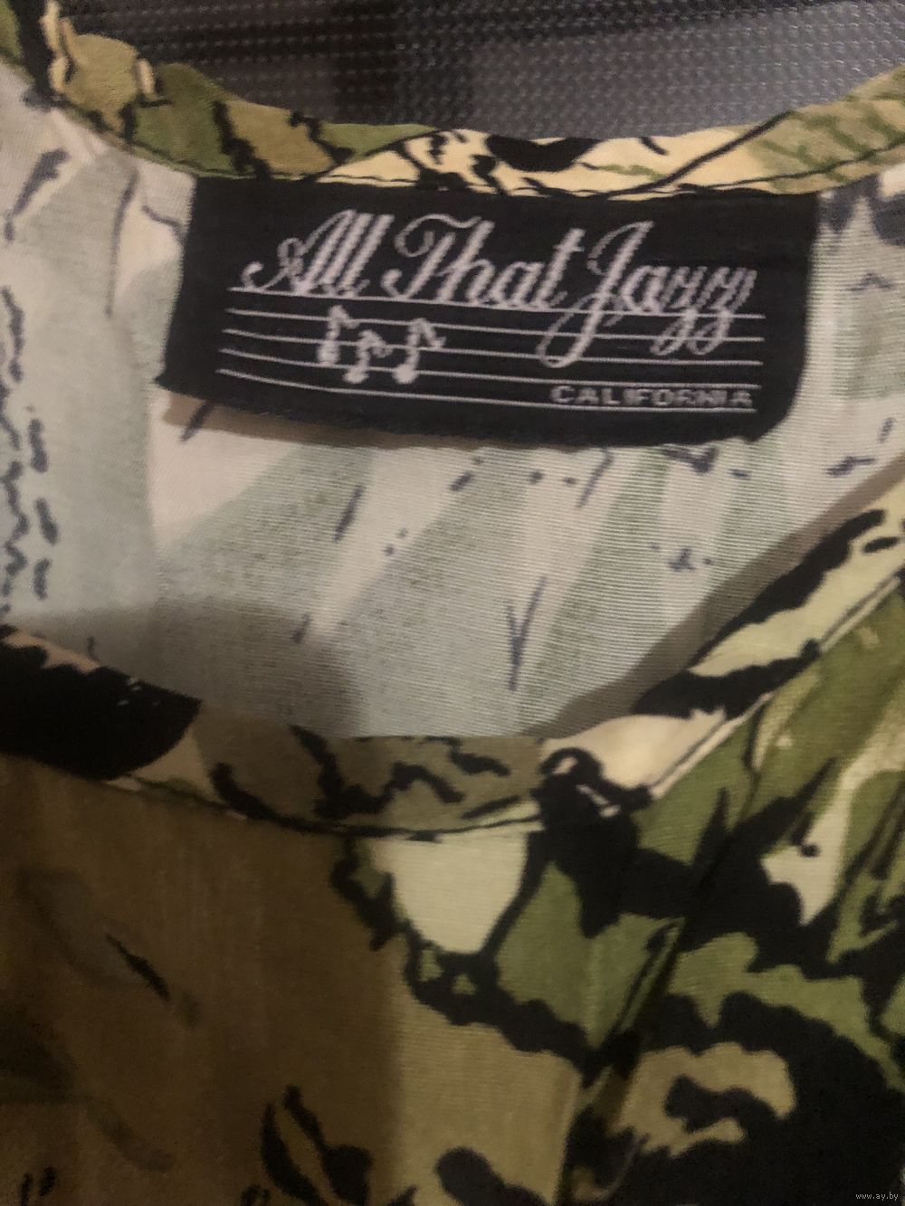 Легкое платье от калифорнистской компании All That Jazz» (Весь этот джаз) относится к винтажному бренду 80-х и 90-х, ориентированного на вечеринки и стиль диско. Платье имеет характерный для этого винтажного направления зелено-черный узор с абстрактным принтом. Длина платья по спине - 125 см. Длина от горловины до конца рукава- 24 см (рукав цельнокроеный), ширина горловины - 35 см. Ширина талии - 50 см. Юбка полуклеш. Ткань приятная к телу, похожа на вискозу. Платье впишется в тематическую вечеринку. Также прекрасно для летнего дня. Платье в хорошем состоянии.