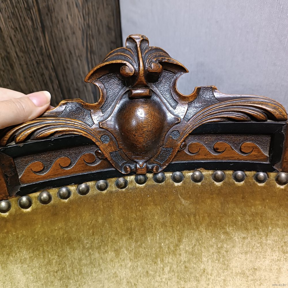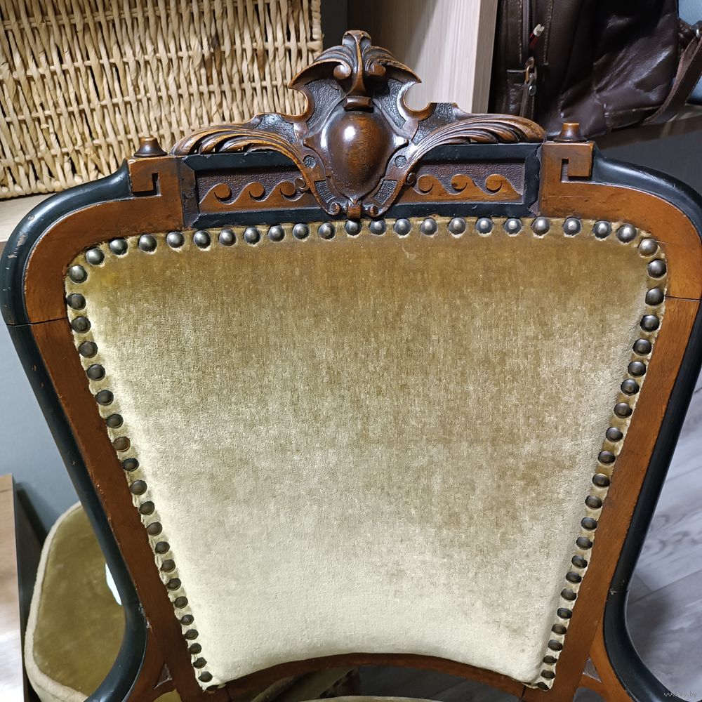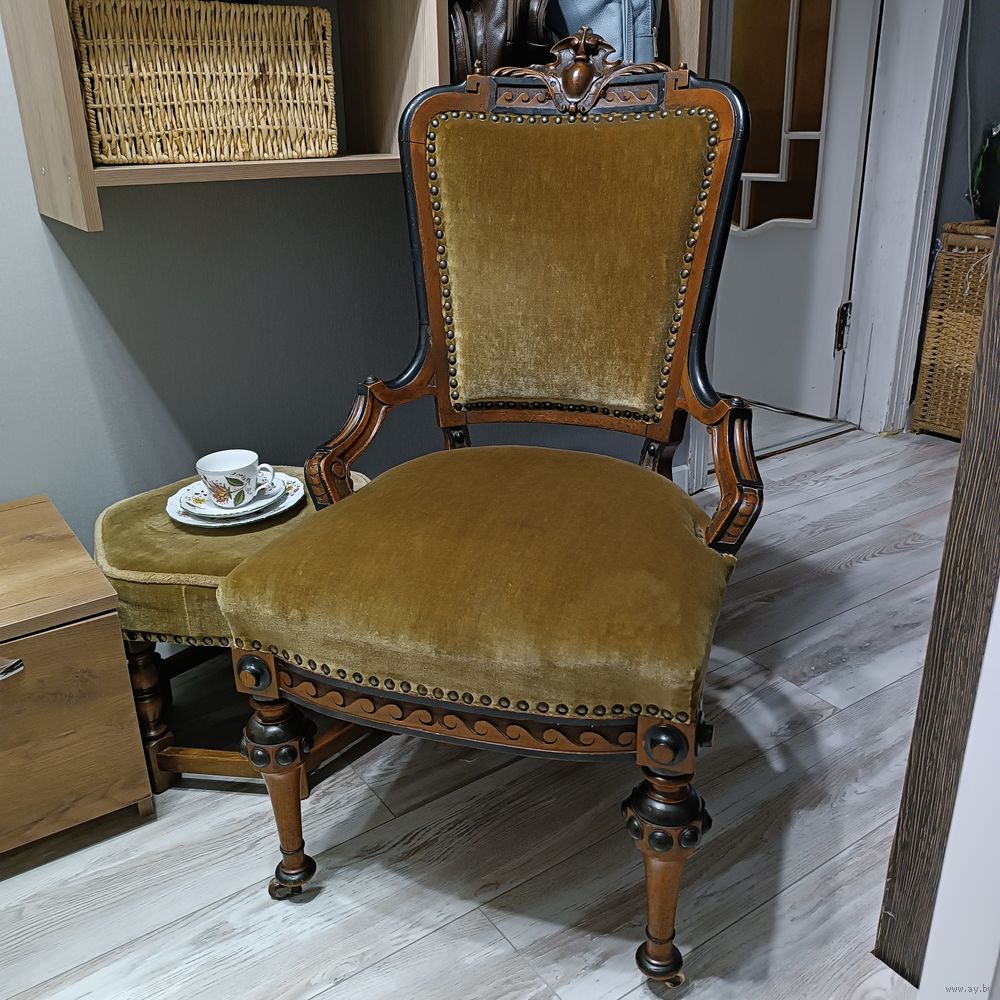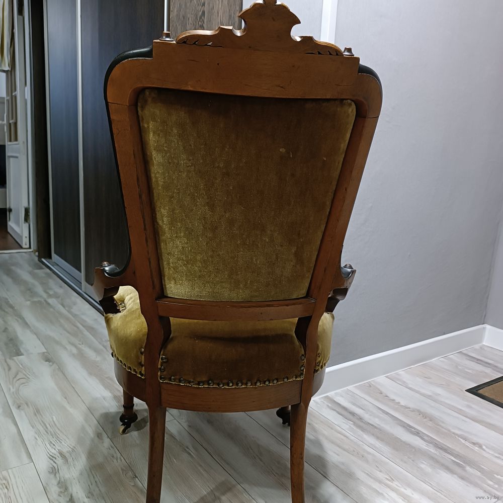 | Винтажное кресло 1920-30 годов. Массив дуба. Барочная резьба. Передние ножки на керамических колесиках. Кованые пружины. Кресло в отличном состоянии,в реставрации не было. | |