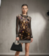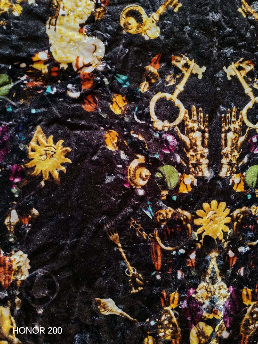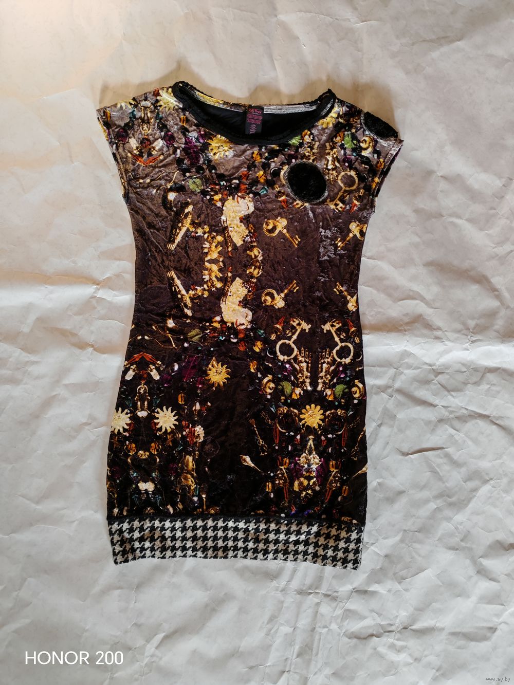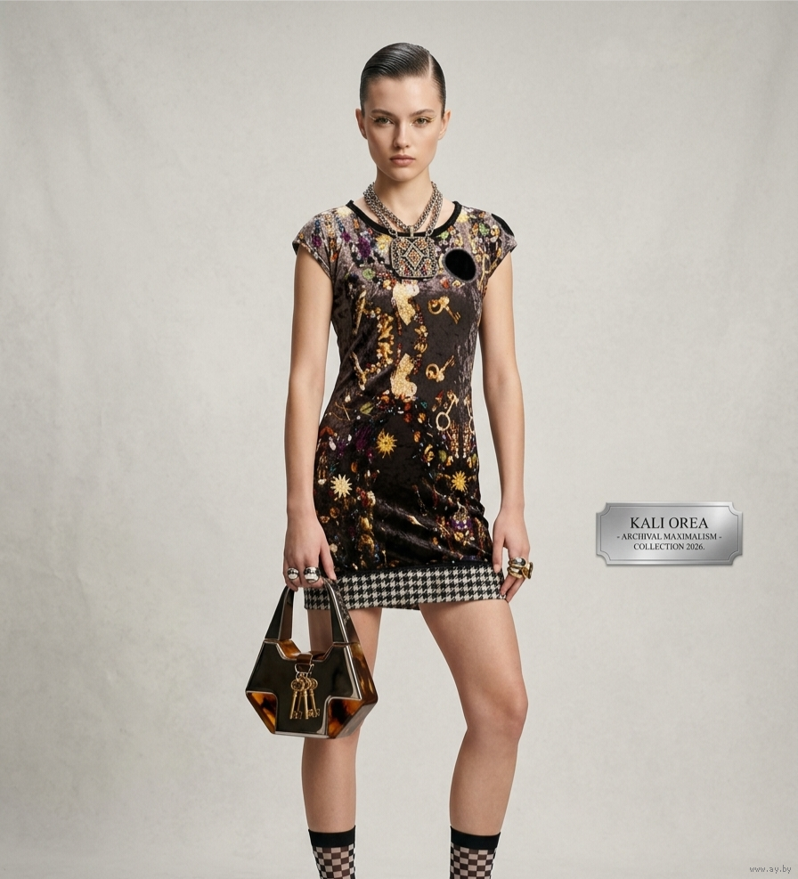 Редкое винтажное платье от бренда Kai Orea в стиле максимализм. Сочетание барочных золотых ключей и классического принта «гусиная лапка» (houndstooth) на подоле — это прямой ответ на подиумные коллекции Schiaparelli и Etro 2026 года.