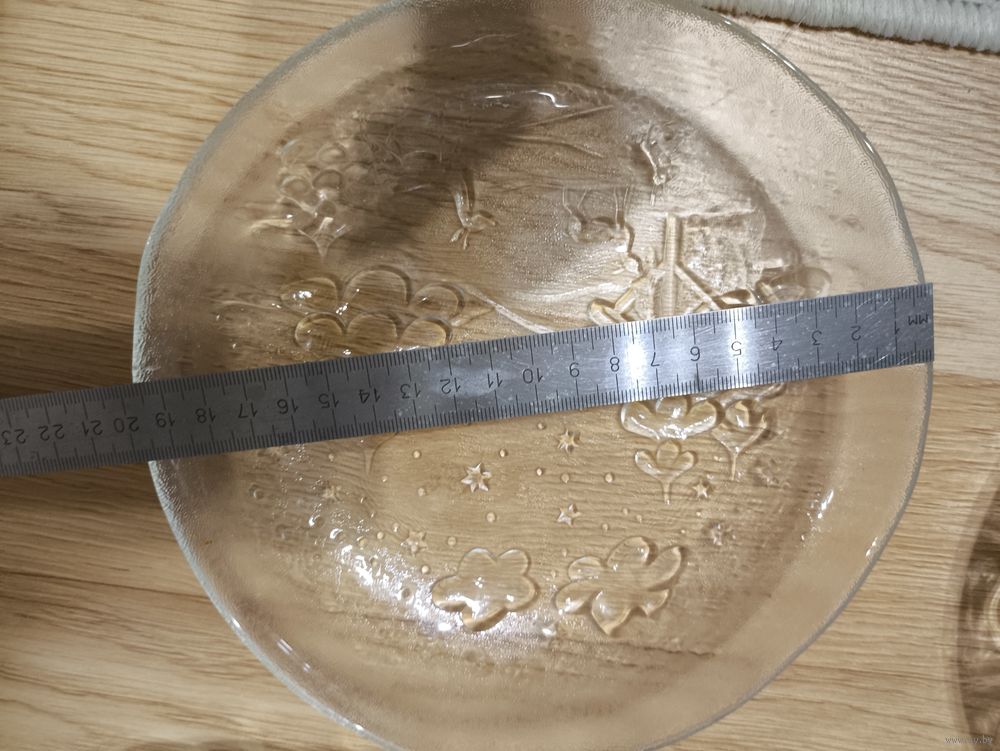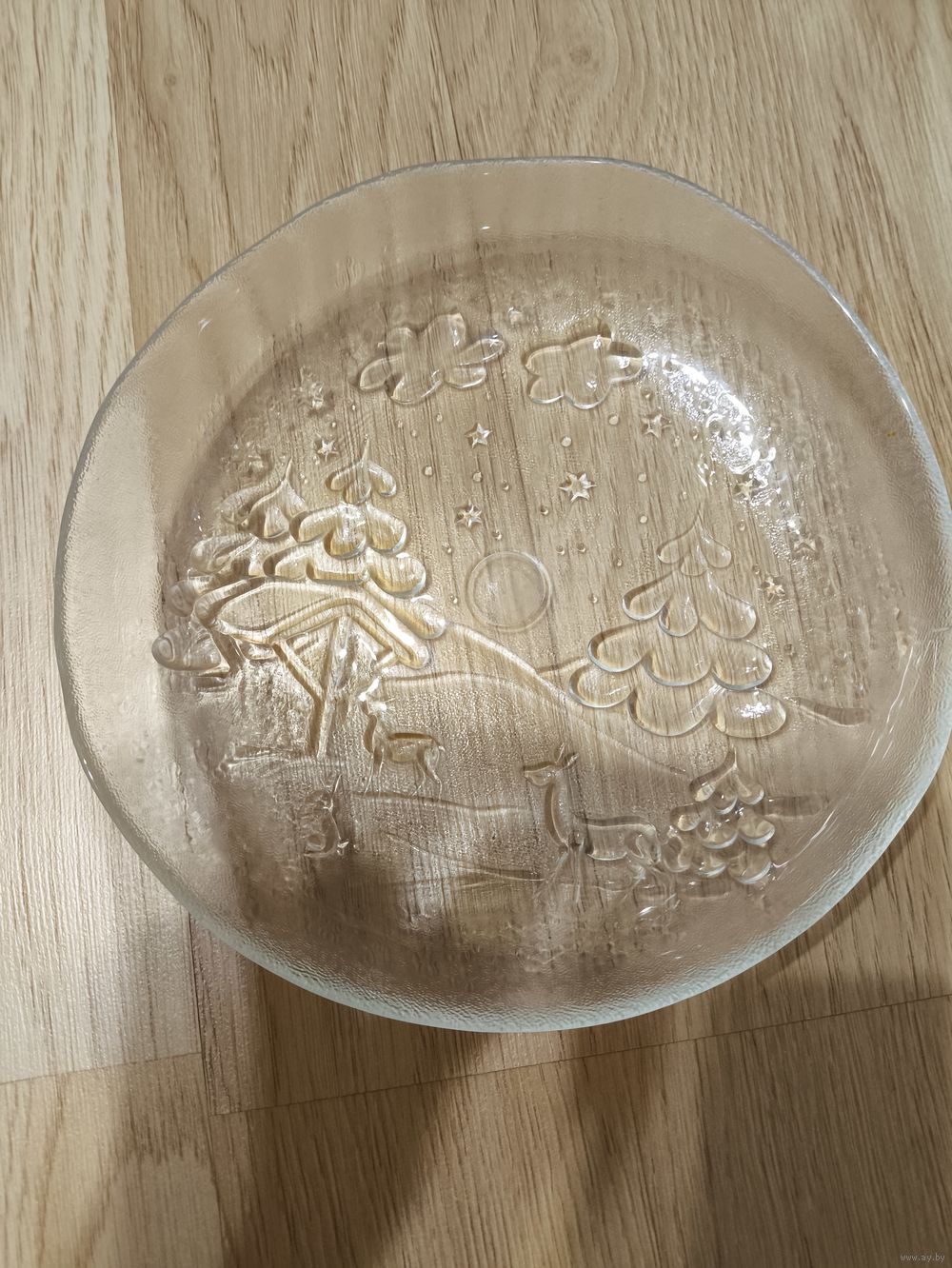 Прозрачное прессованное стекло. Рельефный узор с изображением оленей,елей и звёзд
