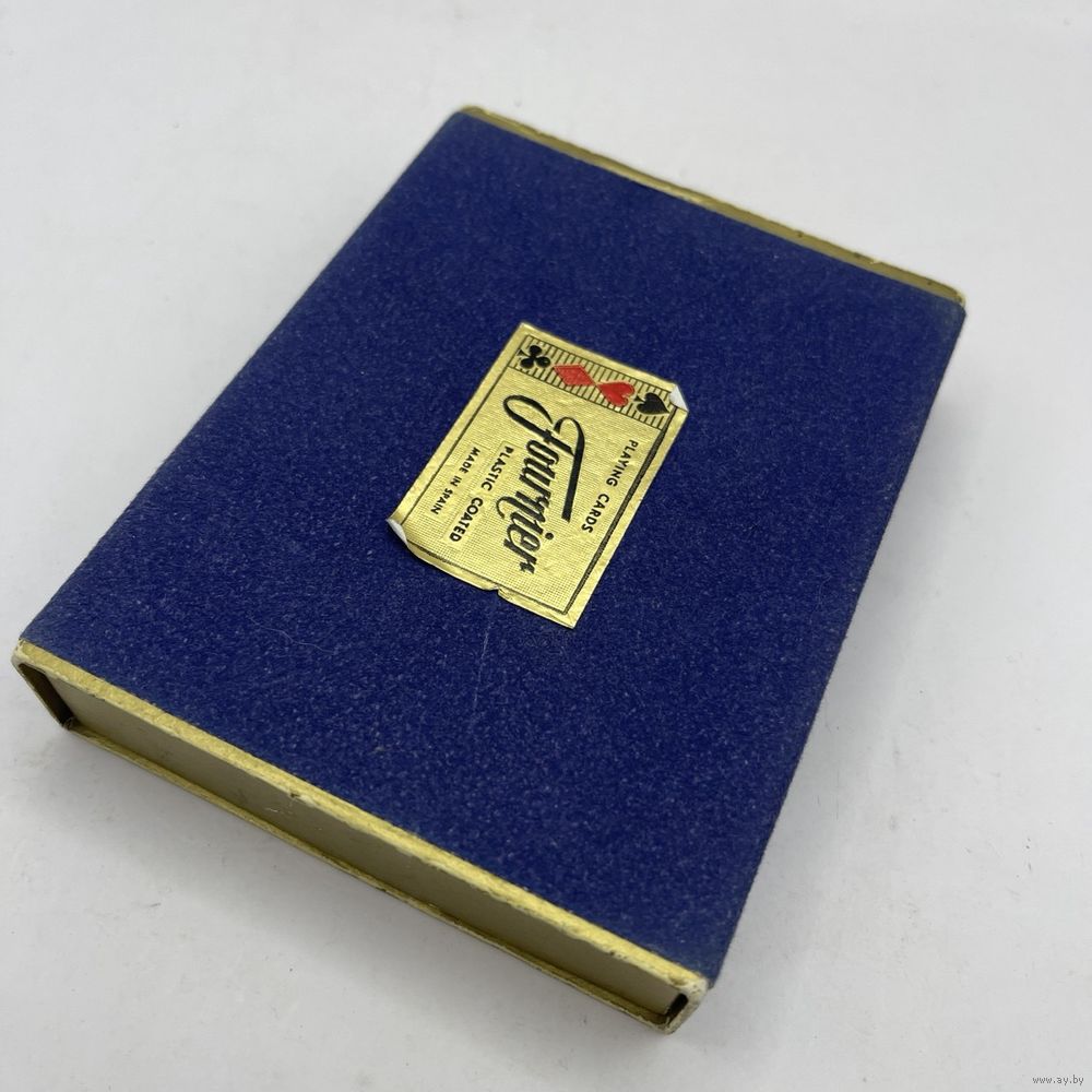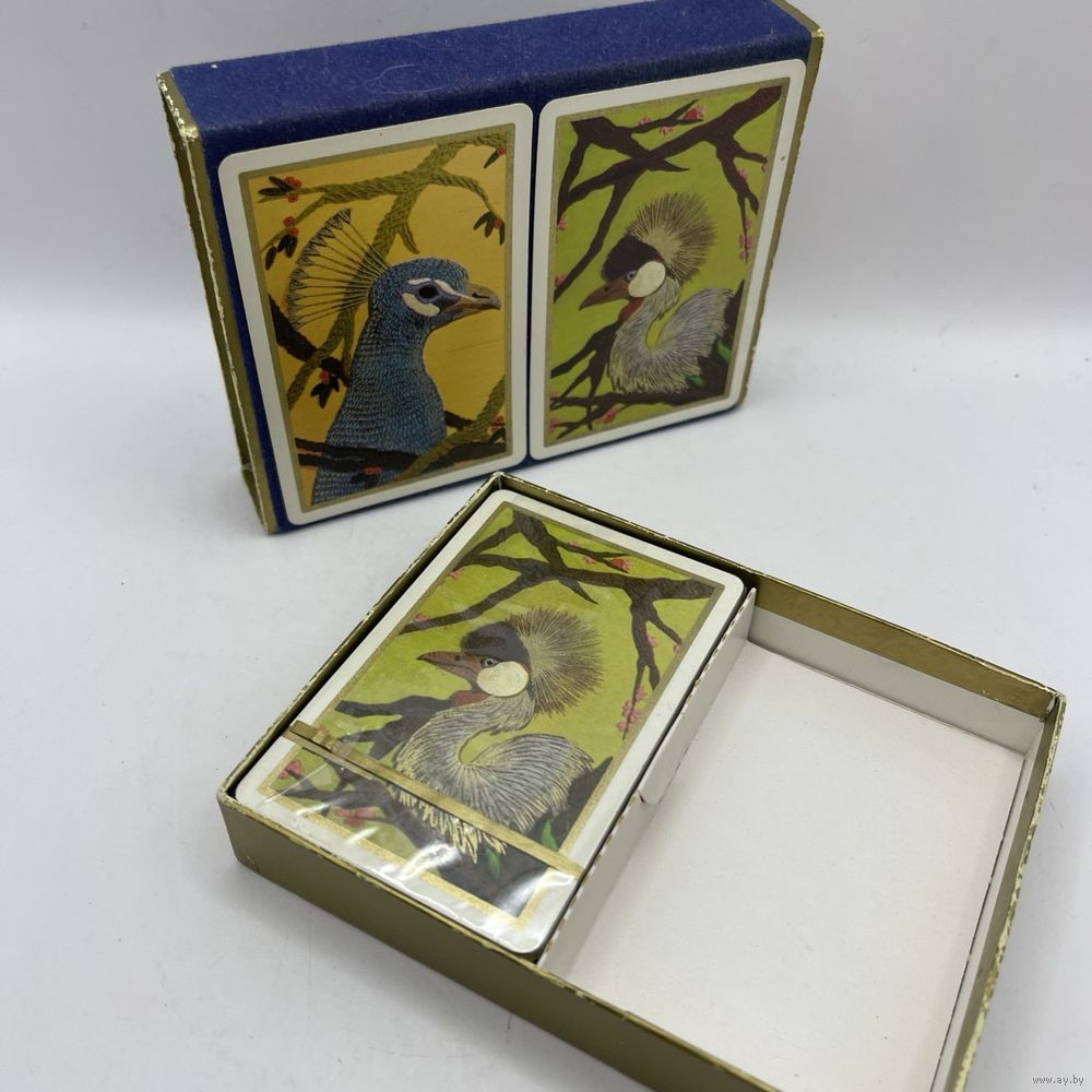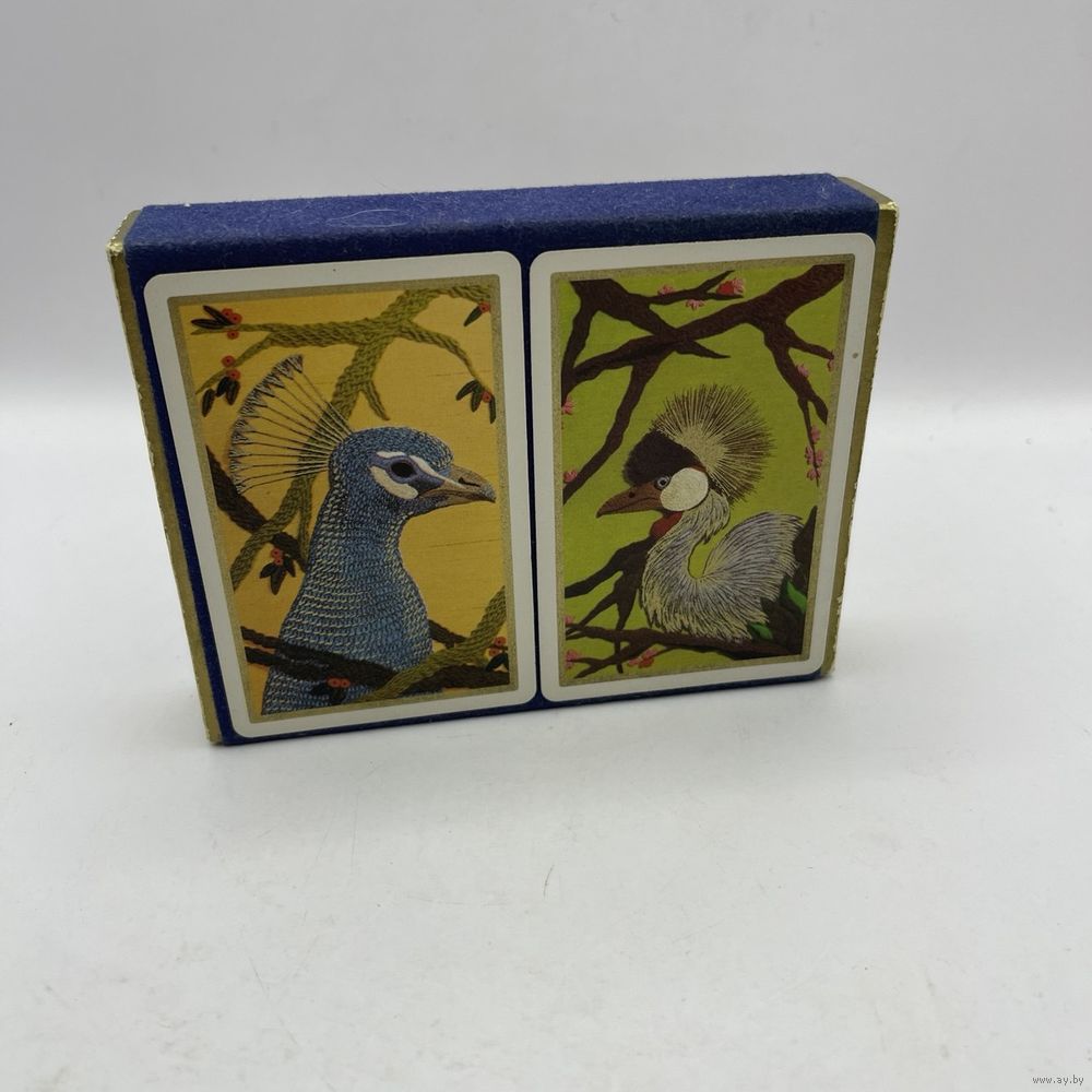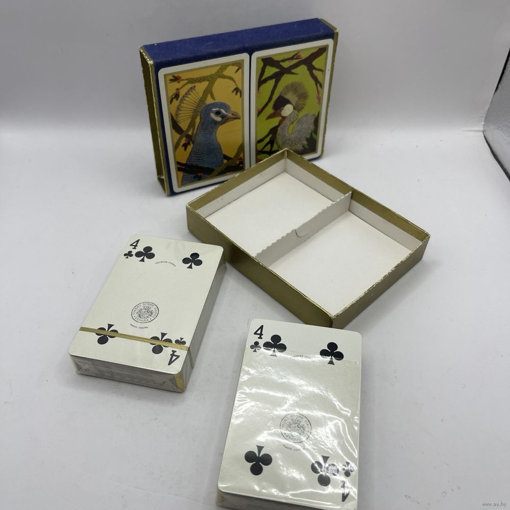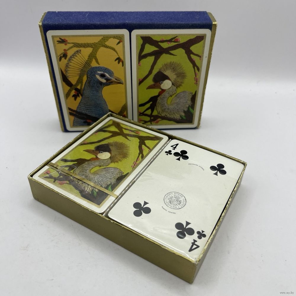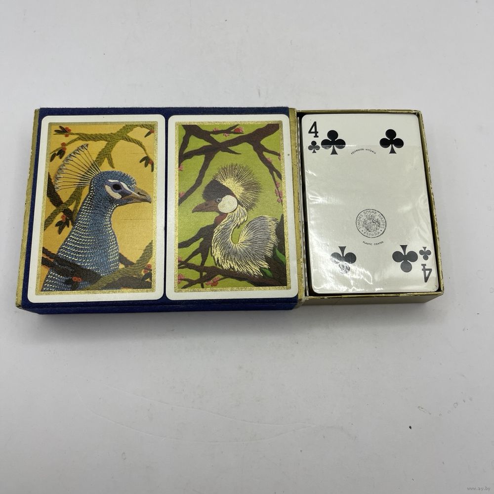 Набор винтажных игральных карт с пластиковым покрытием Fournier Rooster Peacock от компании Heraclio Fournier в оригинальной упаковке с двумя колодами. Испания. 1960-е г.г. Каждая колода содержит 54 карты, с джокерами. Одна колода запечатана. Одна колода распечатана, в оригинальной защитной пленке, без признаков использования. Размер коробки 12,5 х 9,5 х 2,5 см.