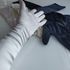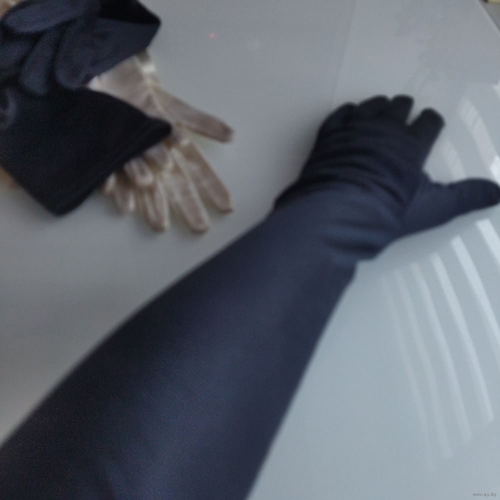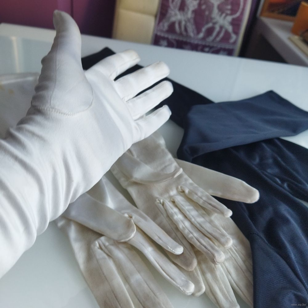 Черные - выше локтя. Белые атласные с лайкрой- чуть ниже локтя. Черные- немного больший размер. Из Германии. Винтаж. Цена за все три пары.