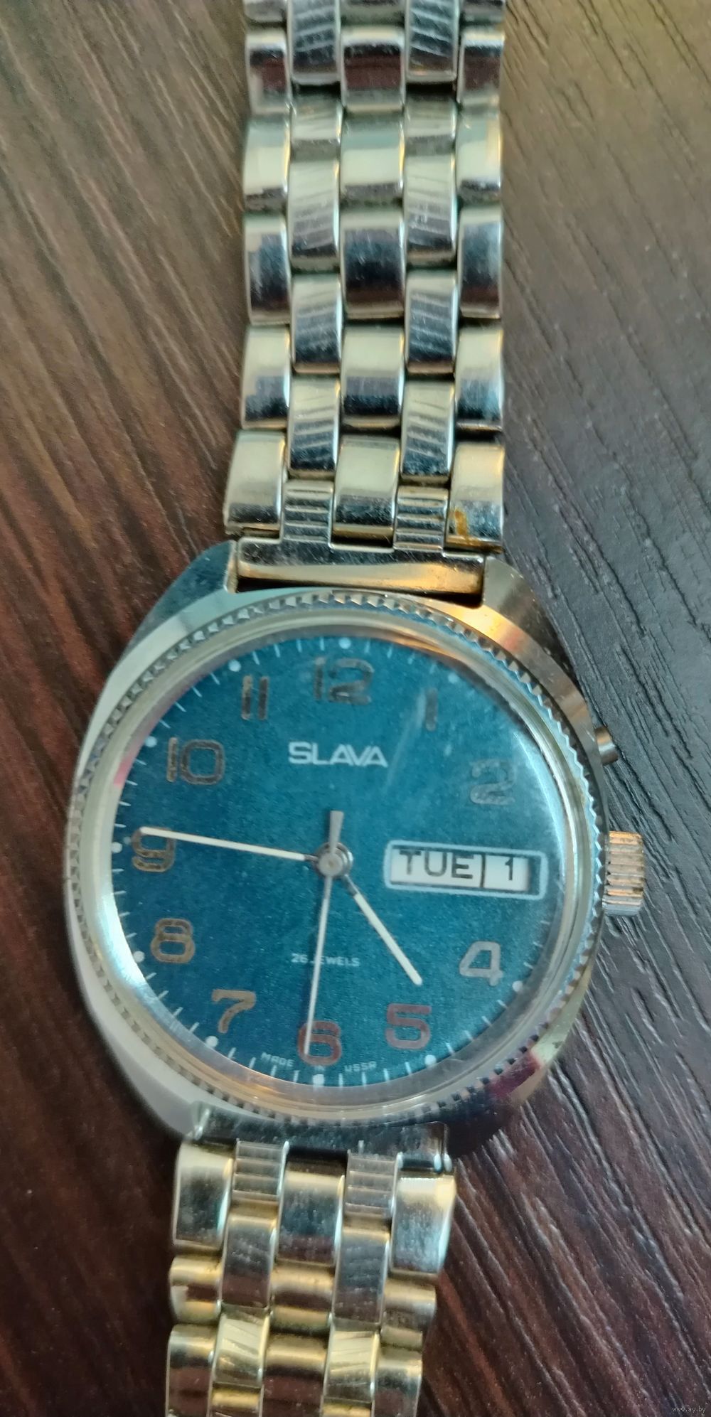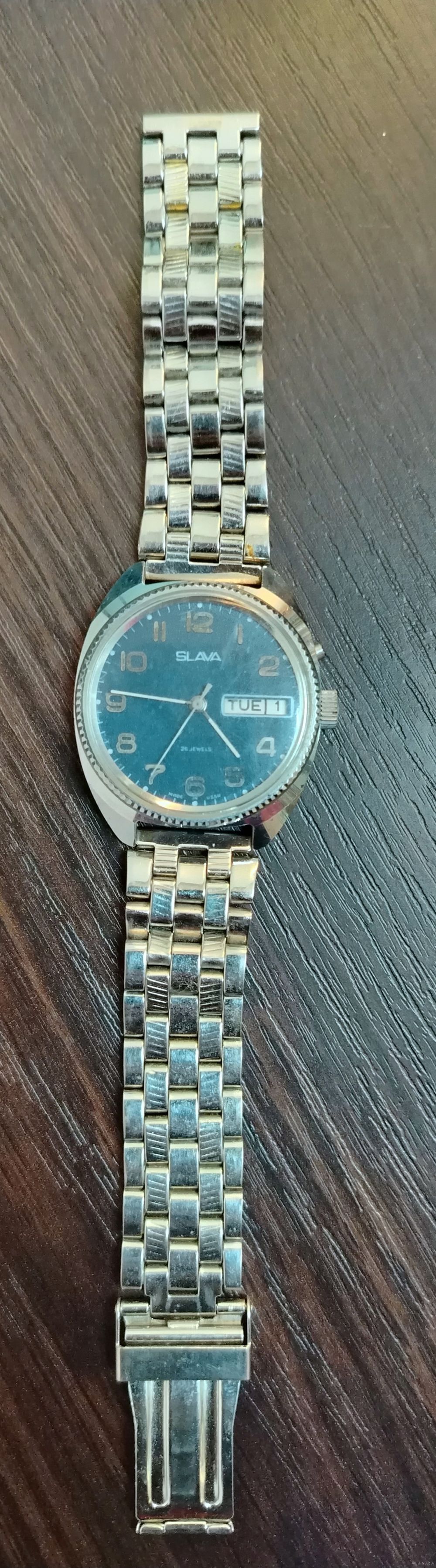 Винтажные советские наручные часы , механизм 26 камней , циферблат синий с двойным календарем день недели и дата , часы заводяться идут , ТО часов не проводилось , ремешок целый кроме застежки .