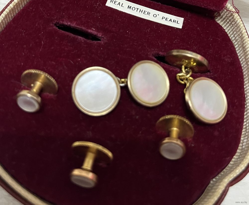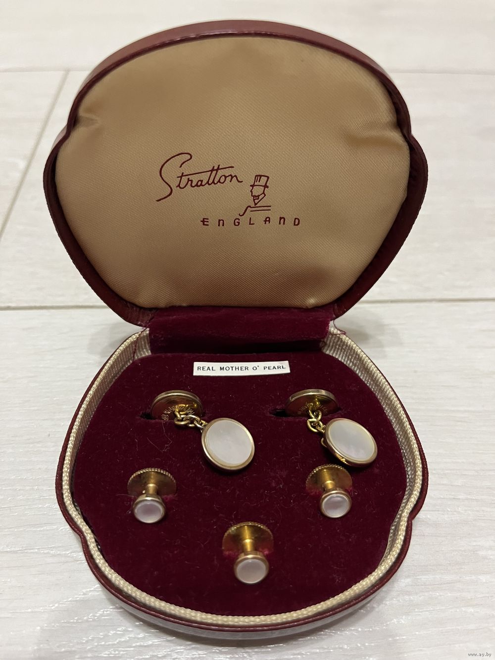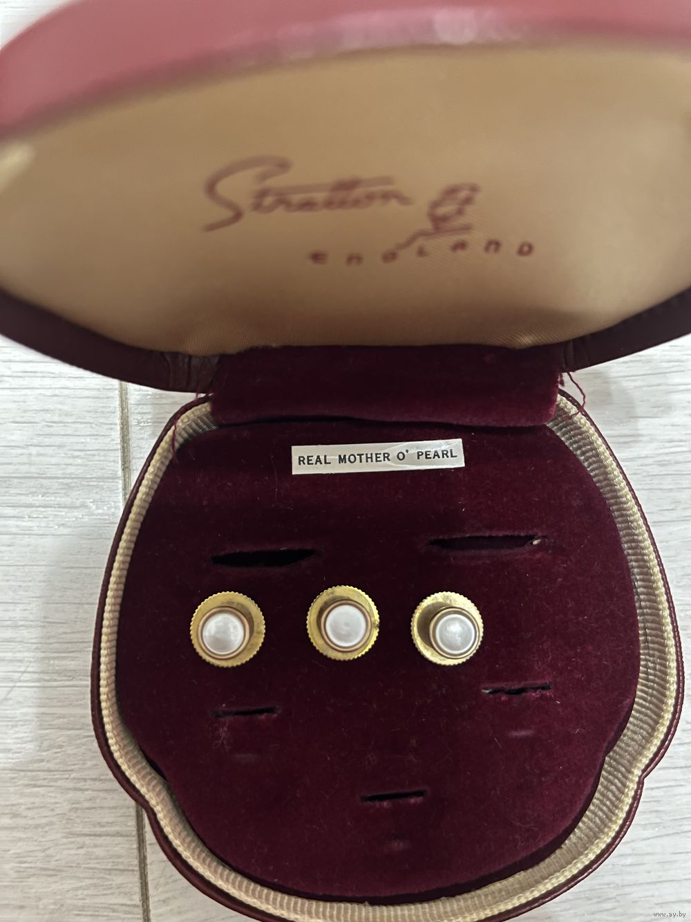Винтажный комплект запонок и шпилек для смокинга от бренда Stratton England, изготовленный с использованием натурального перламутра.