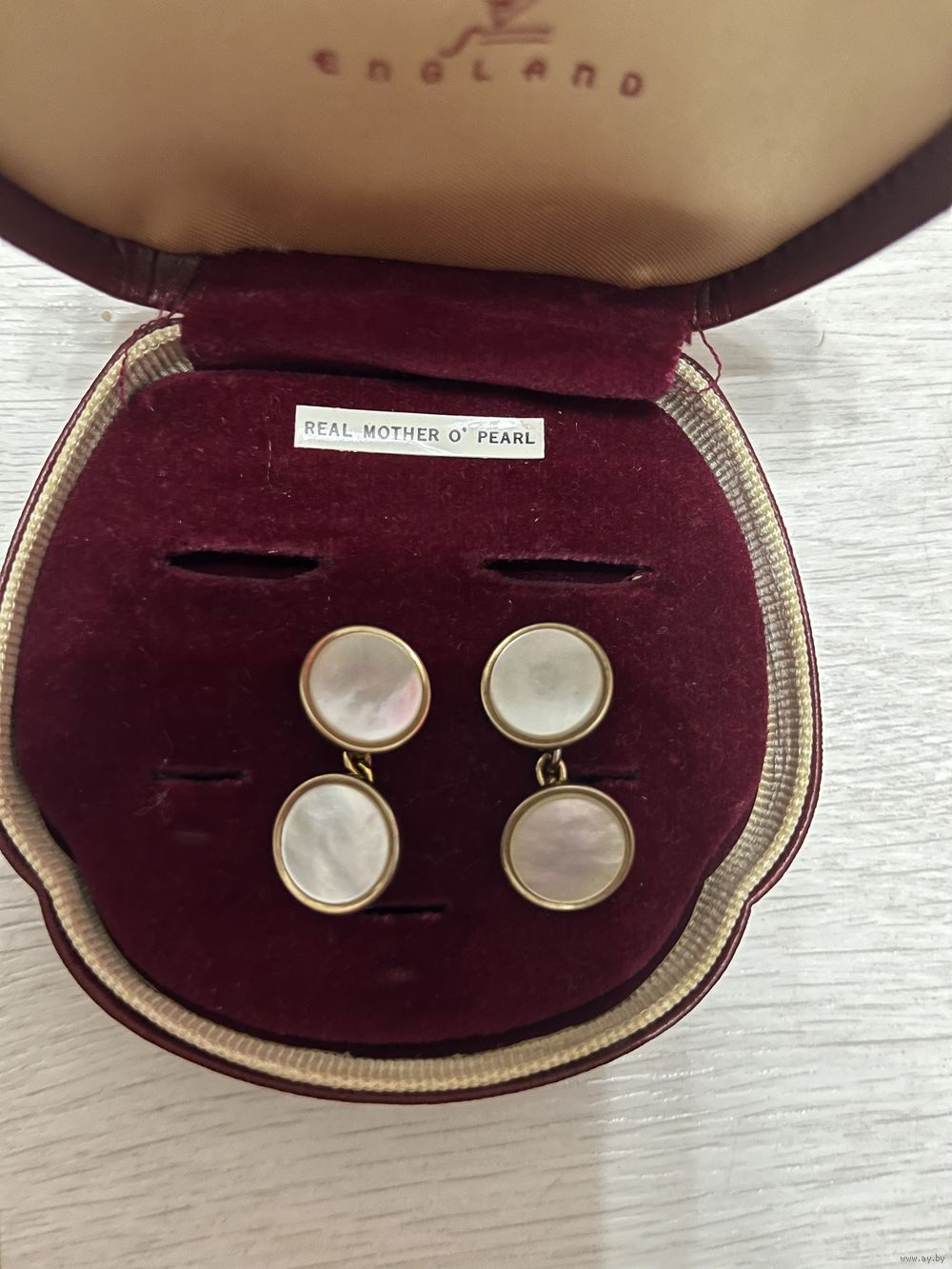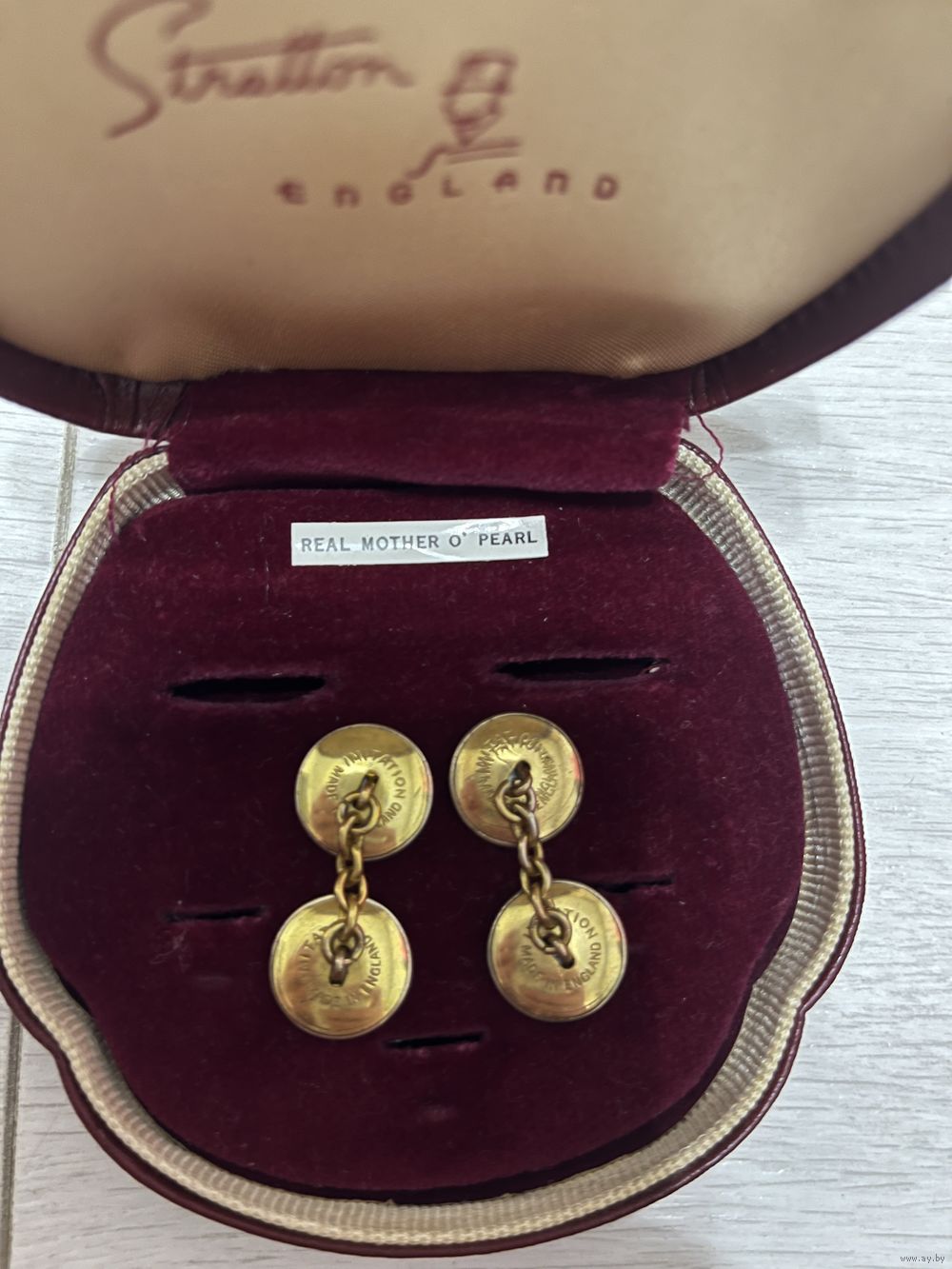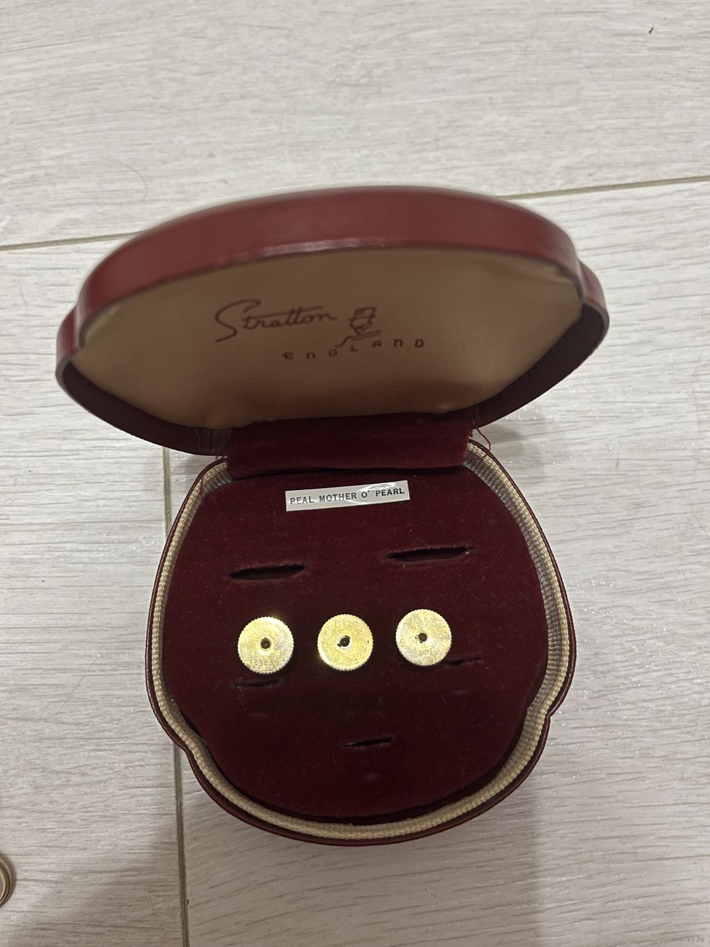 Винтажный комплект запонок и шпилек для смокинга от бренда Stratton England, изготовленный с использованием натурального перламутра.
