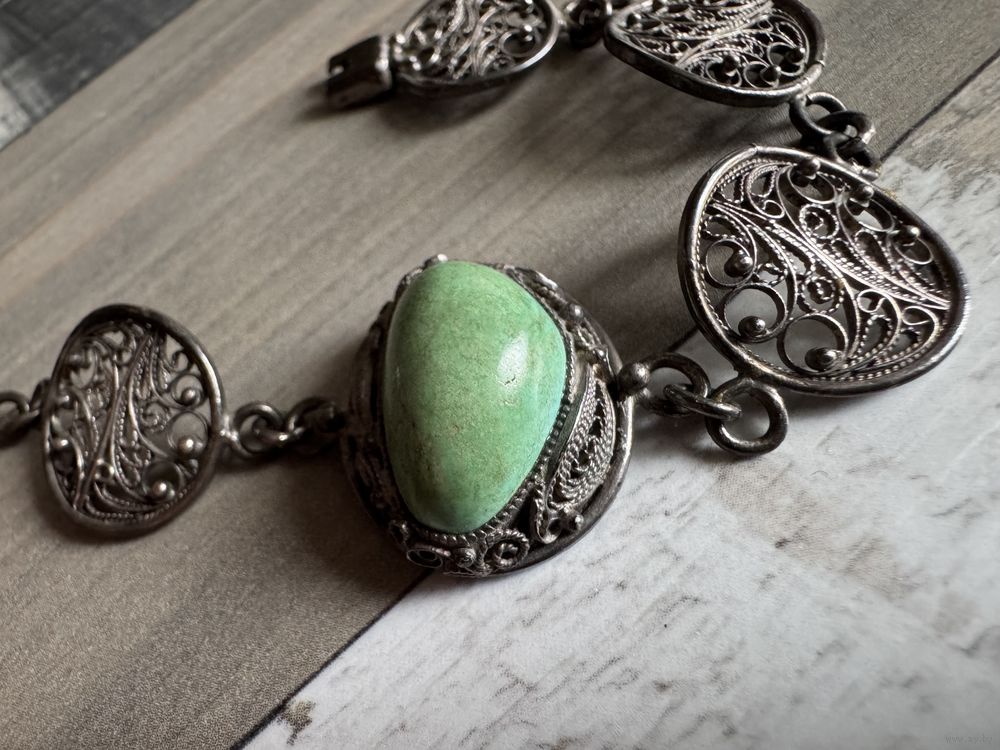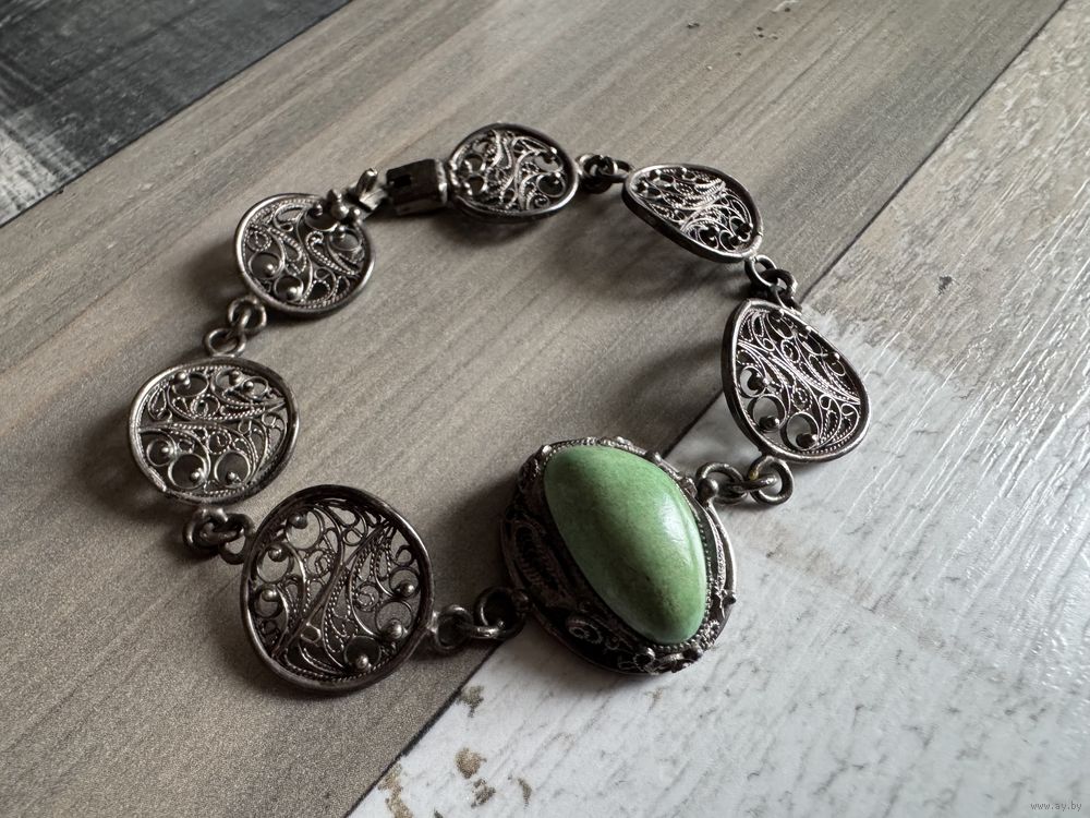 Винтажный браслет периода СССР выполнен в технике ручной филиграни с крупной вставкой кабашон из зеленого камня. Клейм нет, поэтому предположу что металл изделия мельхиор.