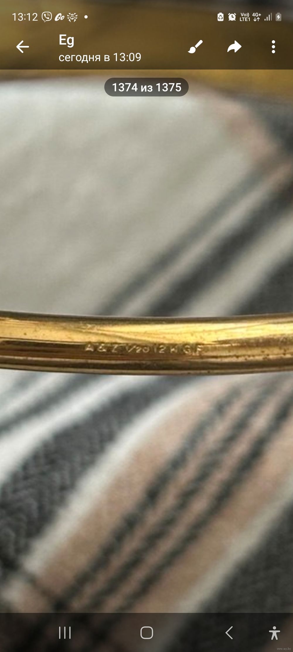 Винтажный детский (для младенца) браслет из позолоченного металла с маркировкой «A&Z 1/20 12K G.F.», указывающей на то, что он покрыт слоем 12-каратного золота (12K Gold Filled). Маркировка — A&Z 1/20 12K G.F. — указывает на то, что изделие выполнено по технологии «наполненного золота» (Gold Filled).Расшифровка маркировкиA&Z: Клеймо производителя. Оно принадлежит компании A&Z Chain Company (основана Карлом Аншеном и Саулом Цейтлином), которая работала в Род-Айленде, США, примерно с 1905 по 1975 годы.1/20: Обозначает долю золотого слоя в общем весе изделия. В данном случае золото составляет 5% (1/20 часть) от общей массы украшения.12K: Указывает на чистоту золота, использованного для внешнего слоя. 12 карат (12K) означает 50% содержание чистого золота в сплаве этого слоя (эквивалентно 500-й пробе).G.F.: Аббревиатура от Gold Filled (наполненное золото). Это метод механического нанесения толстого слоя золота на базовый металл (обычно латунь или медь) под воздействием высокой температуры и давления.НА БРАСЛЕТЕ ОТОГНУТ КРАЙ В РАЙОНЕ ЗАСТЕЖКИ (ВИДНО НА ФОТО)