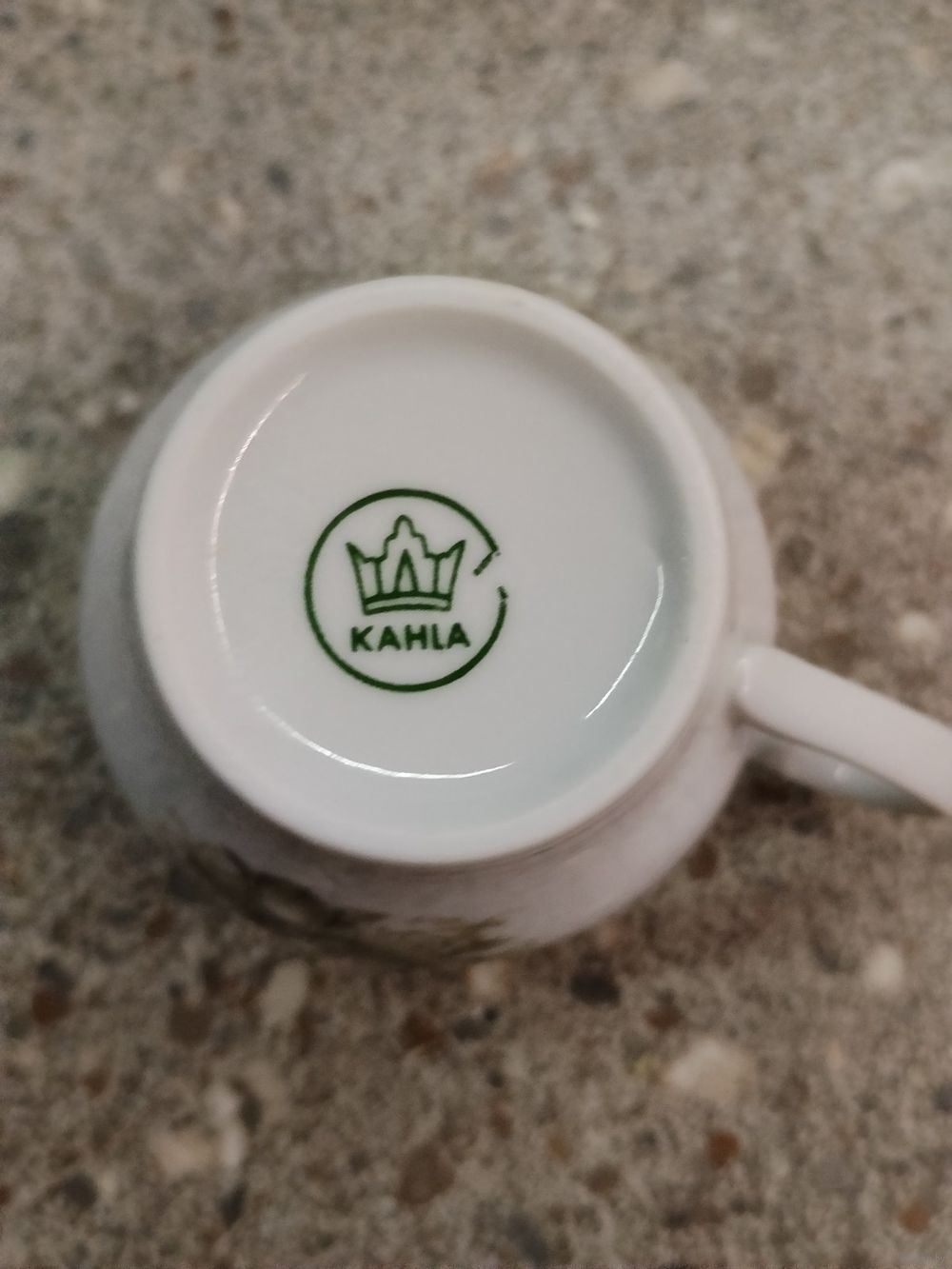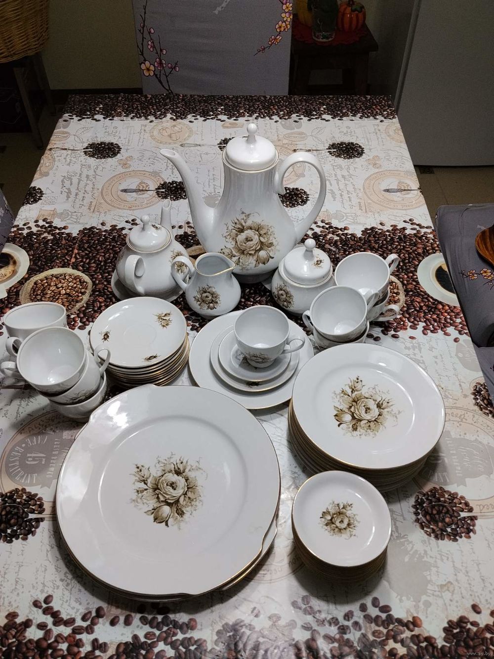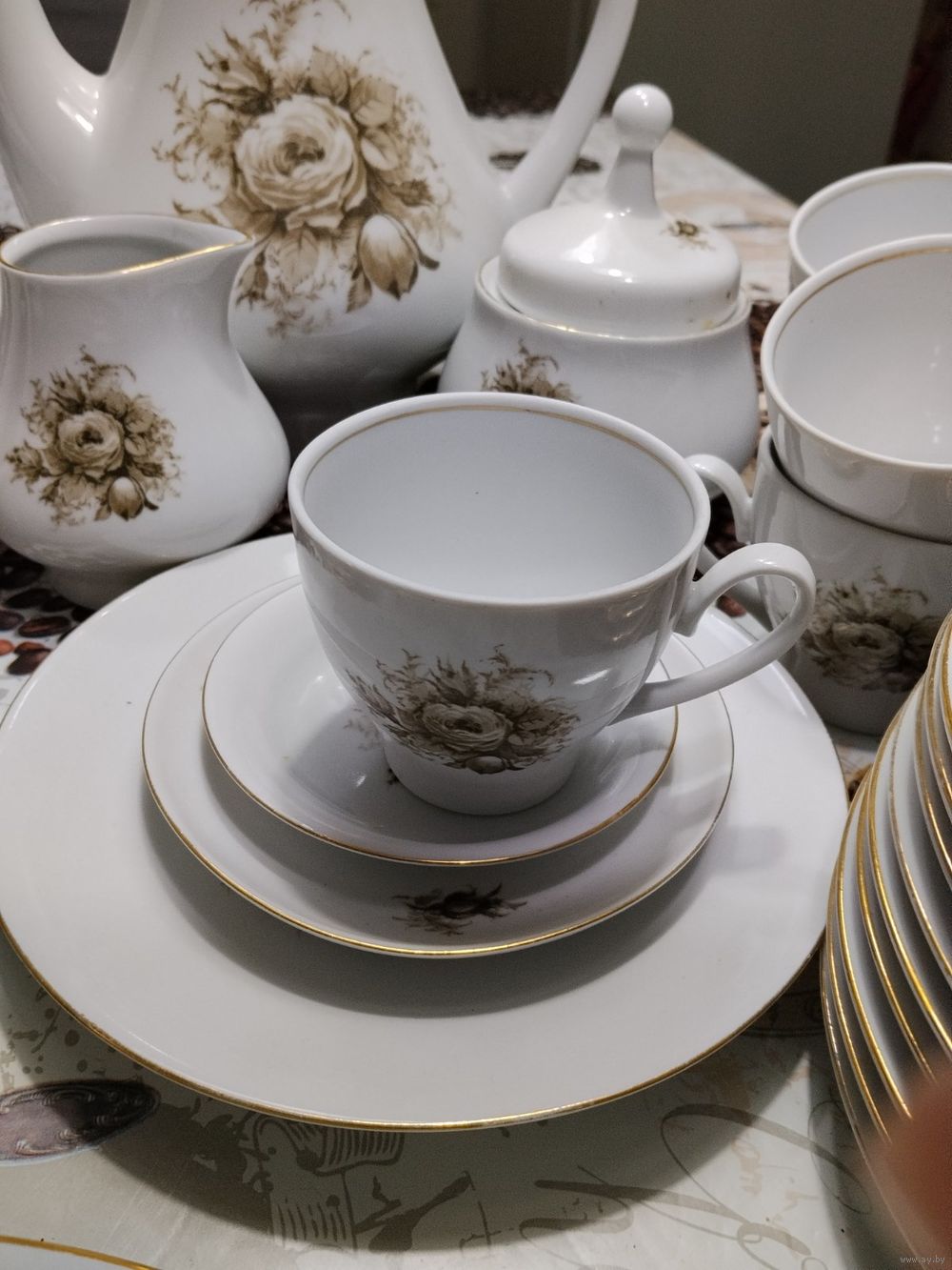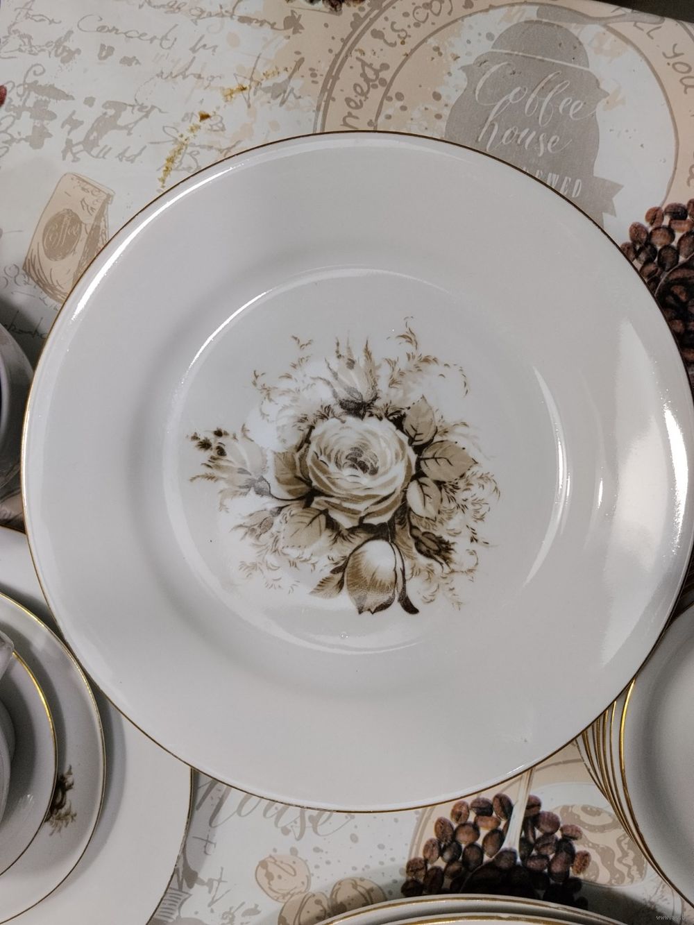 Винтажный чайно-обеденный сервиз из фарфора KAHLA (Кахла) производства ГДР (Германская Демократическая Республика), популярный в 1970-х годах. Декор выполнен в стиле «Нежная роза» с характерным коричневатым цветочным узором и золотой каймой по краю.
