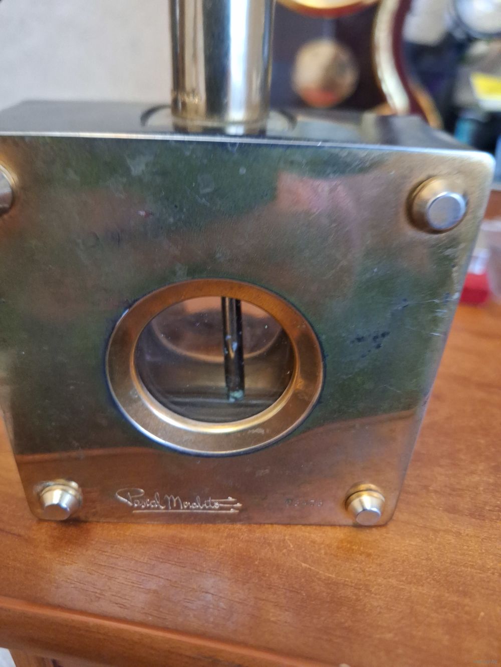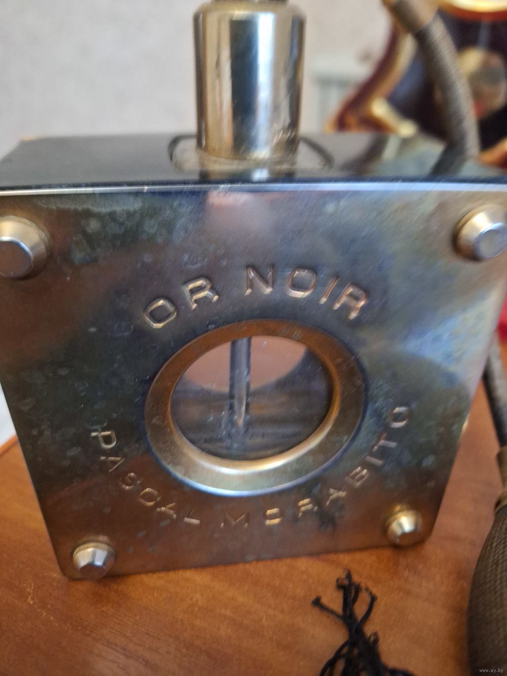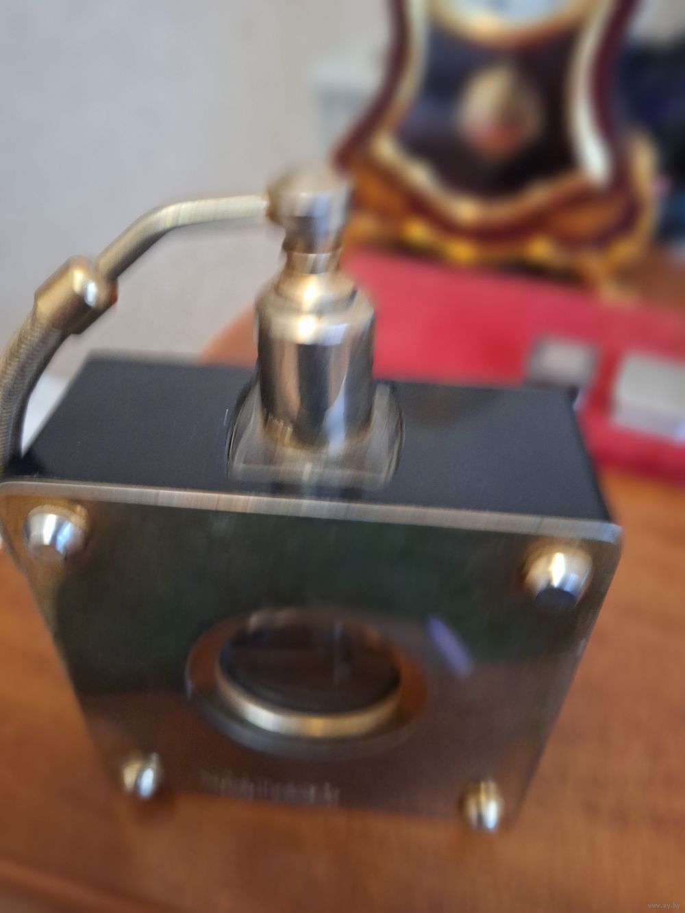 Флакон выполнен в виде металлического куба с круглым окошком.В комплект идет