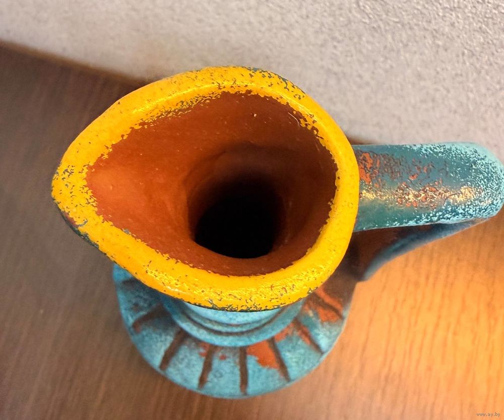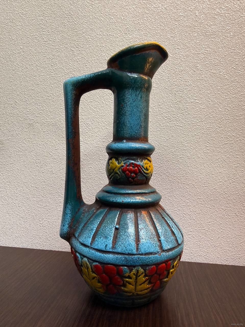 Винтажный керамический кувшин, украшенный рельефным узором из виноградных гроздьев и листьев.