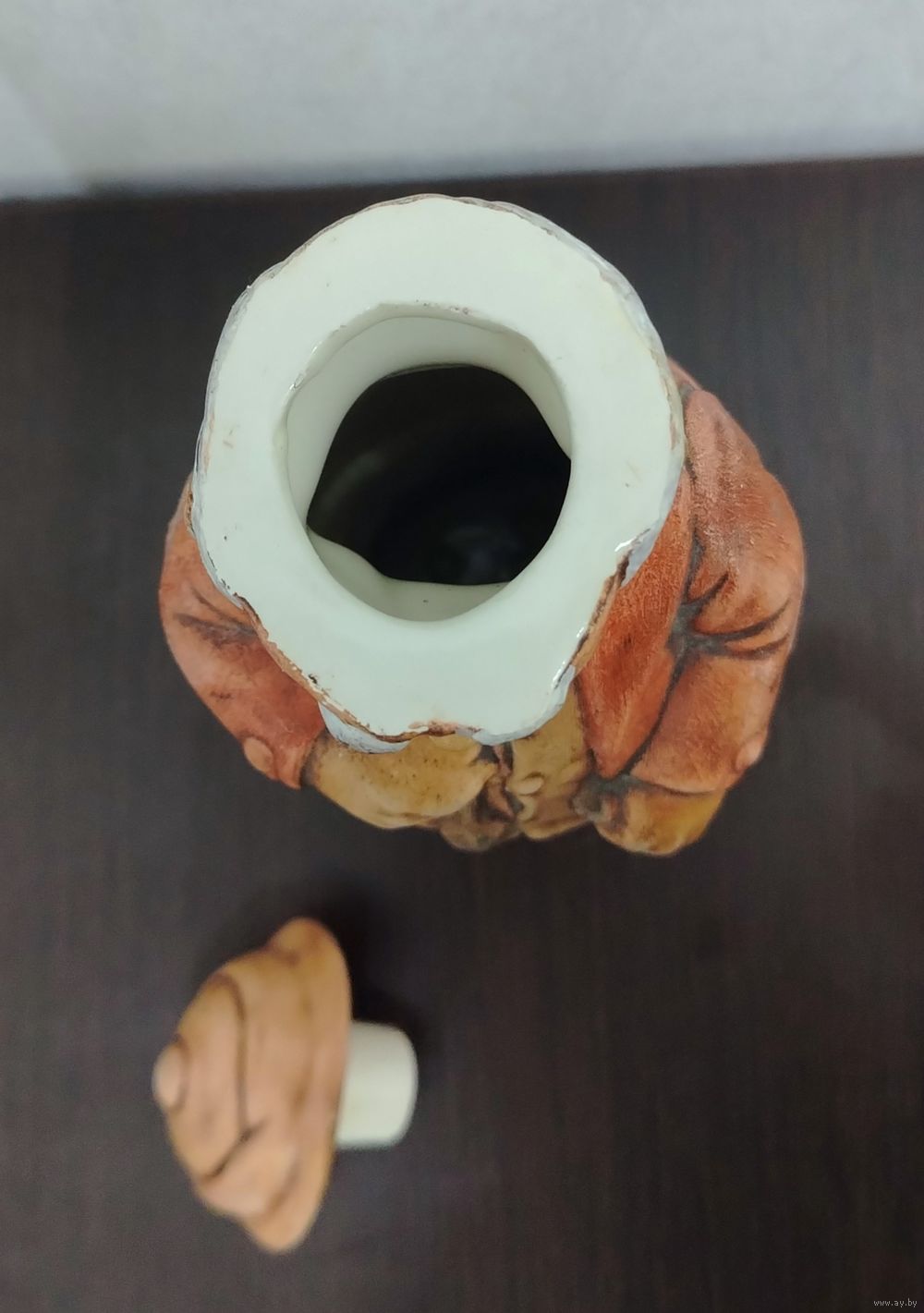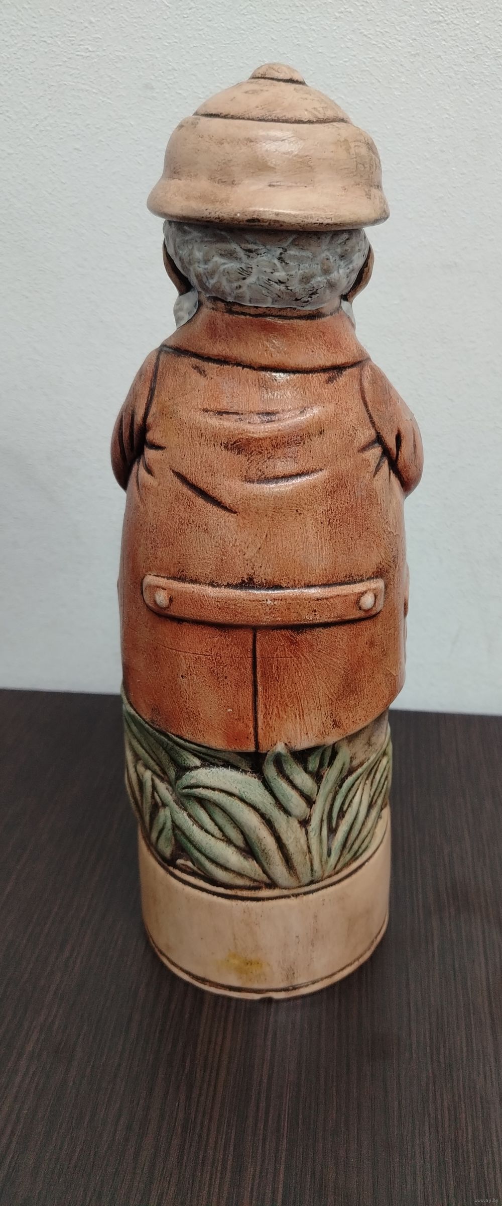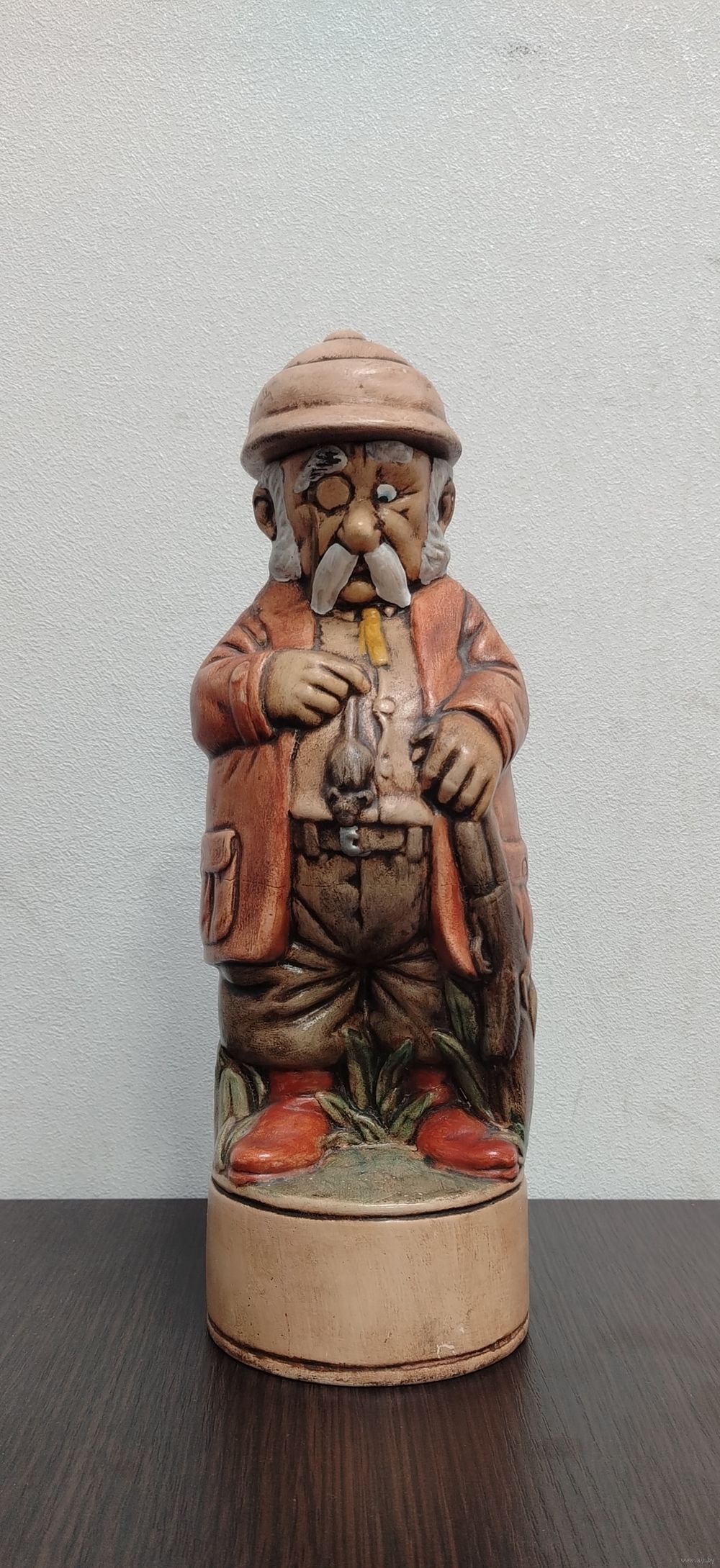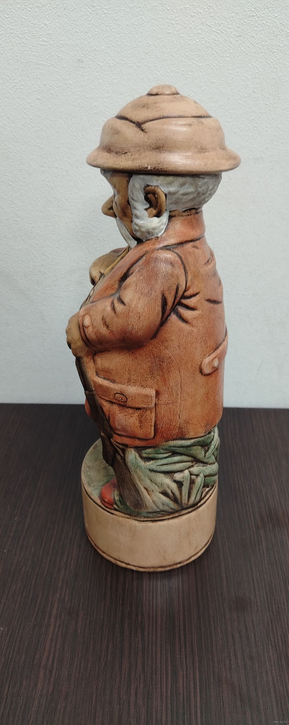 Винтажный керамический штоф ( бутылка для алкоголя ) в виде охотника в пробковом шлеме с моноклем , внутри с керамической глазурью белого цвета , состояние идеальное , все целое трещин и сколов нет , полностью герметичный . Размер высота 32 см ширина 10 см диаметр горловины 3 см . вес 1090 грамм .Хорошо подойдет как подарок или презент , или очень классный предмет декора , чаще всего используется как каминная статуэтка .