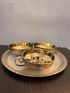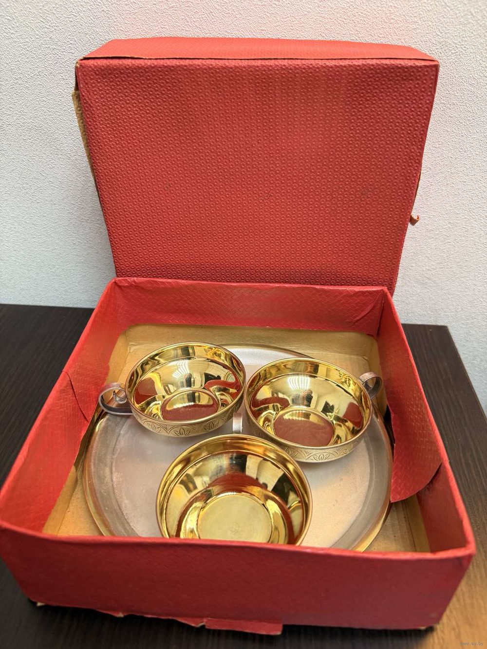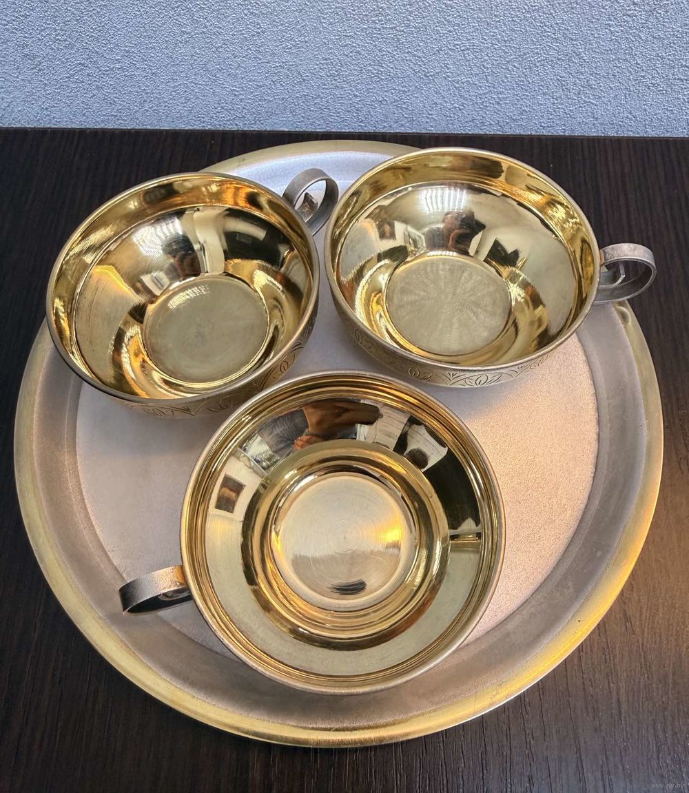 Винтажный кофейный набор СССР Ювелирный Завод Москва ( не использовался , состояние отличное , гравировка , золочение с серебрением клеймо 0юммет (1970г.) диаметр подноса 18см диаметр чашек 7см высота чашек 3с вес с коробкой 600 грамм. отлично подойдет в виде шикарного подарка или презента а так же очень красивая винтажная вещь интерьера . в идеальном состоянии без царапин вмятин и дефектов по покрытию , все в заводском блеске .