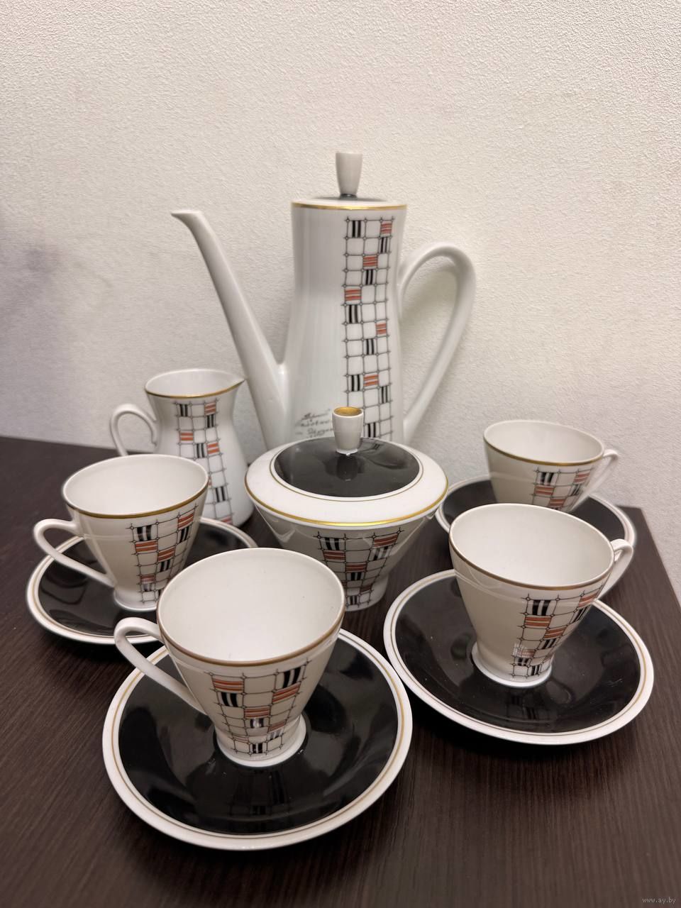 Винтажный кофейный сервиз Freiberger Porzellan из ГДР с геометрическим декором 1970-1990 гг.