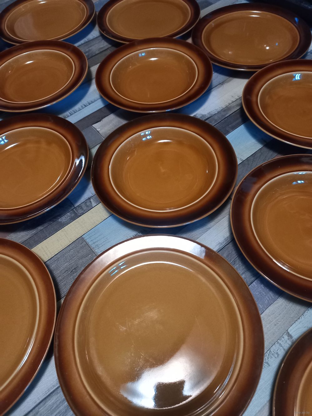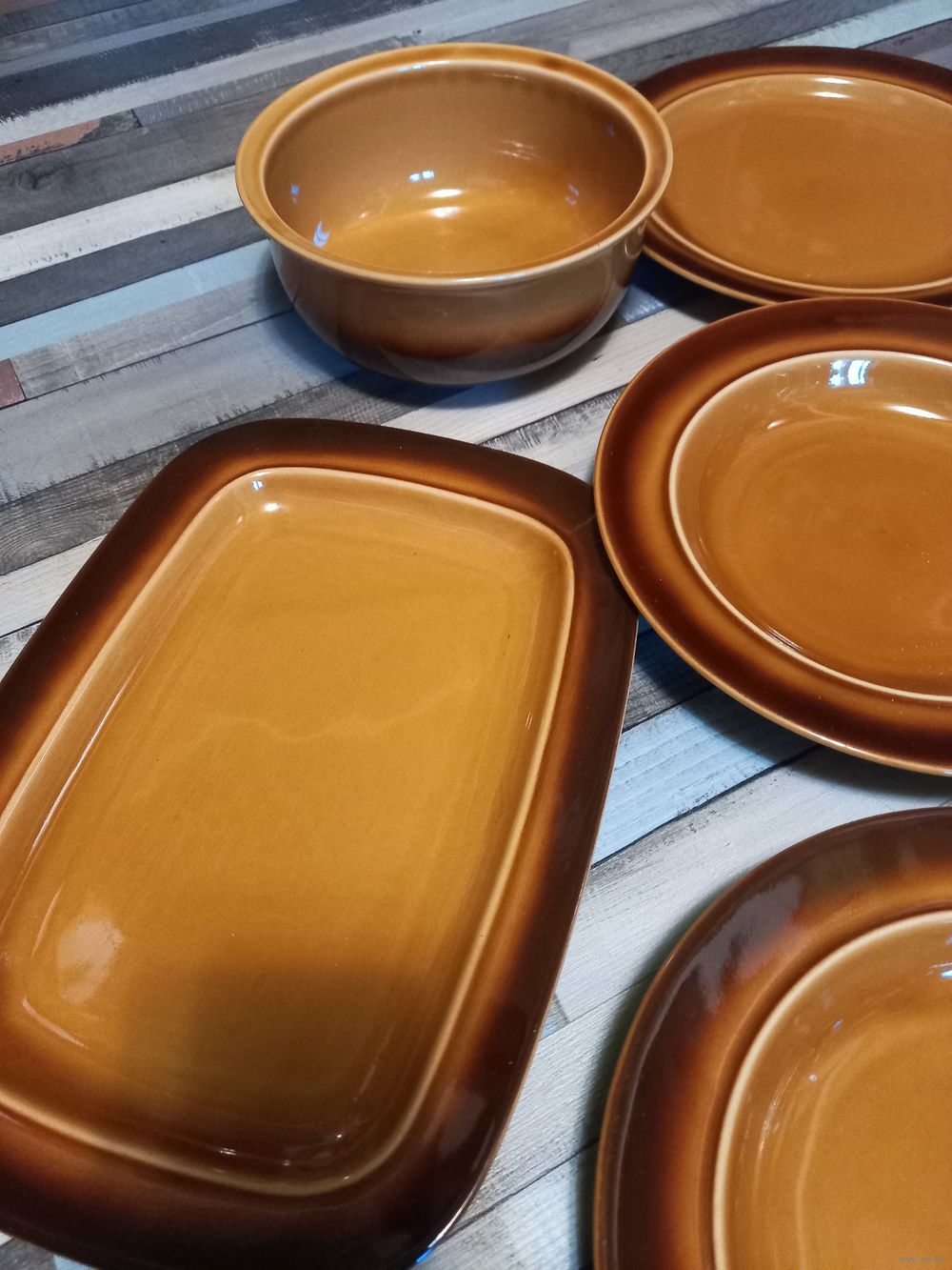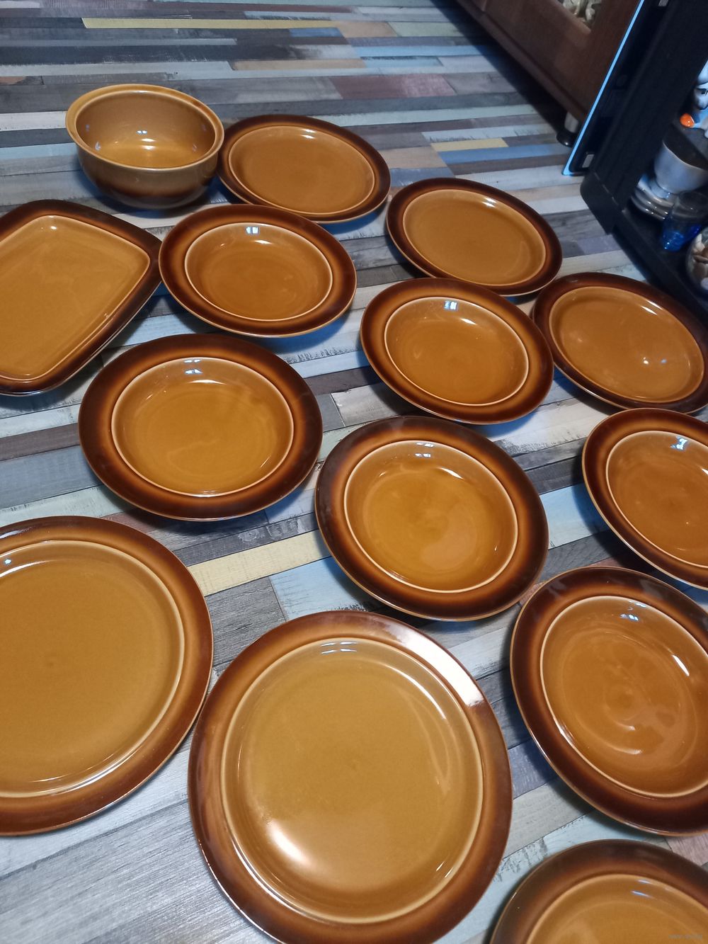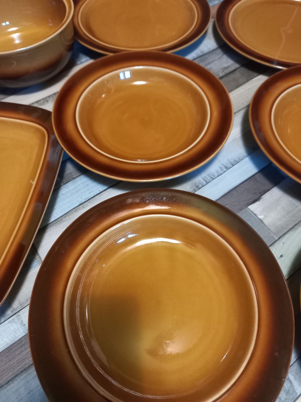 Комплект посуды Старая Польша состоит из 6 глубоких,6 десертных ,салатник,блюдо прямоугольное для сервировки-очень эффектно смотрится при сервировке, прекрасно для загородного дома,дачи ,квартиры диаметр 24 см ,22 см ,блюдо 28/20,салатник 18 см