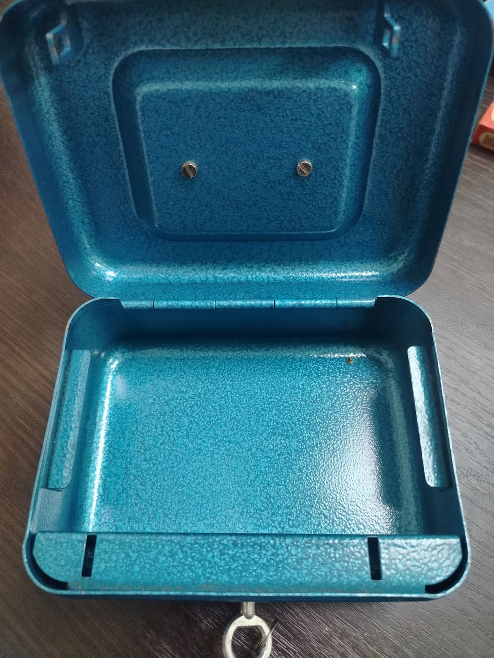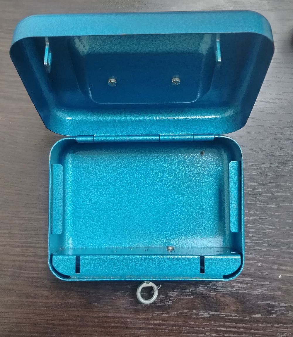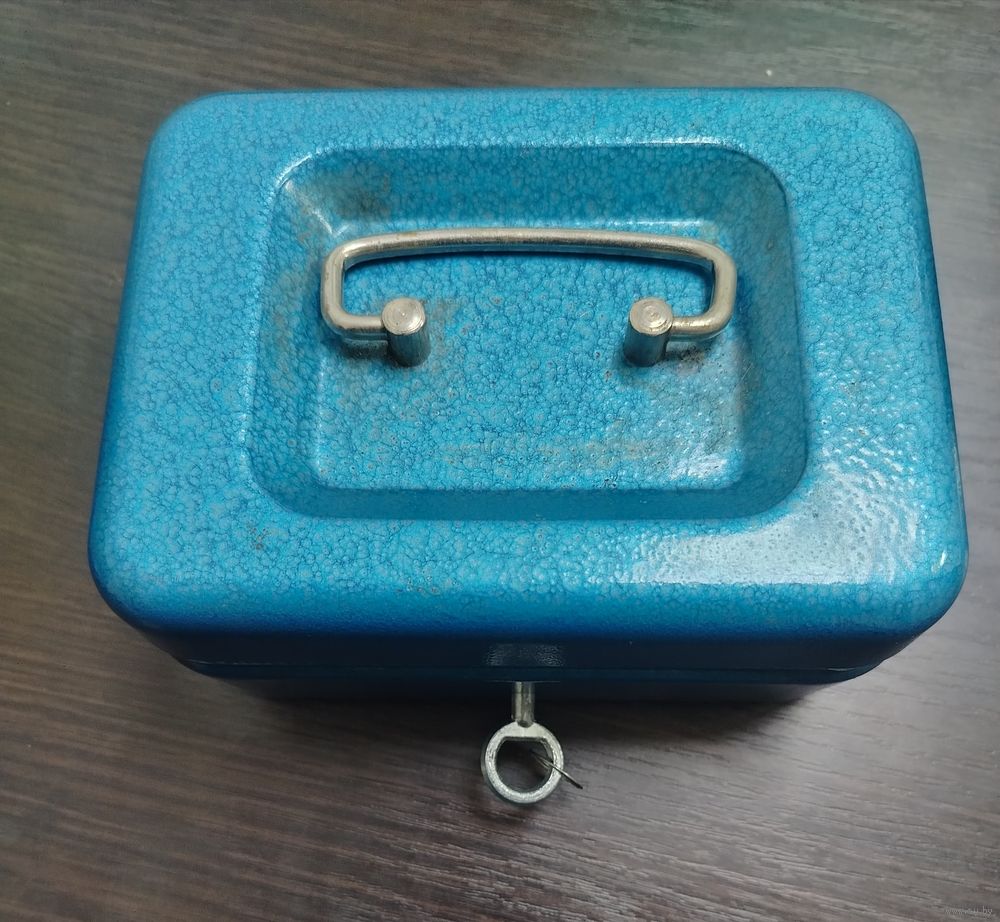 Винтажный металлический портативный сейф полностью в рабочем состоянии с ключиком , предназначен для хранения денег ,документов или мелких ценностей , материал - металл с характерной текстурной окраской синего цвета . Оснащен ручкой на верхней крышке для переноски и ключевым замком спереди . размеры - длинна 17 см высота 7.5 ширина 13 см . вес 960 грамм .