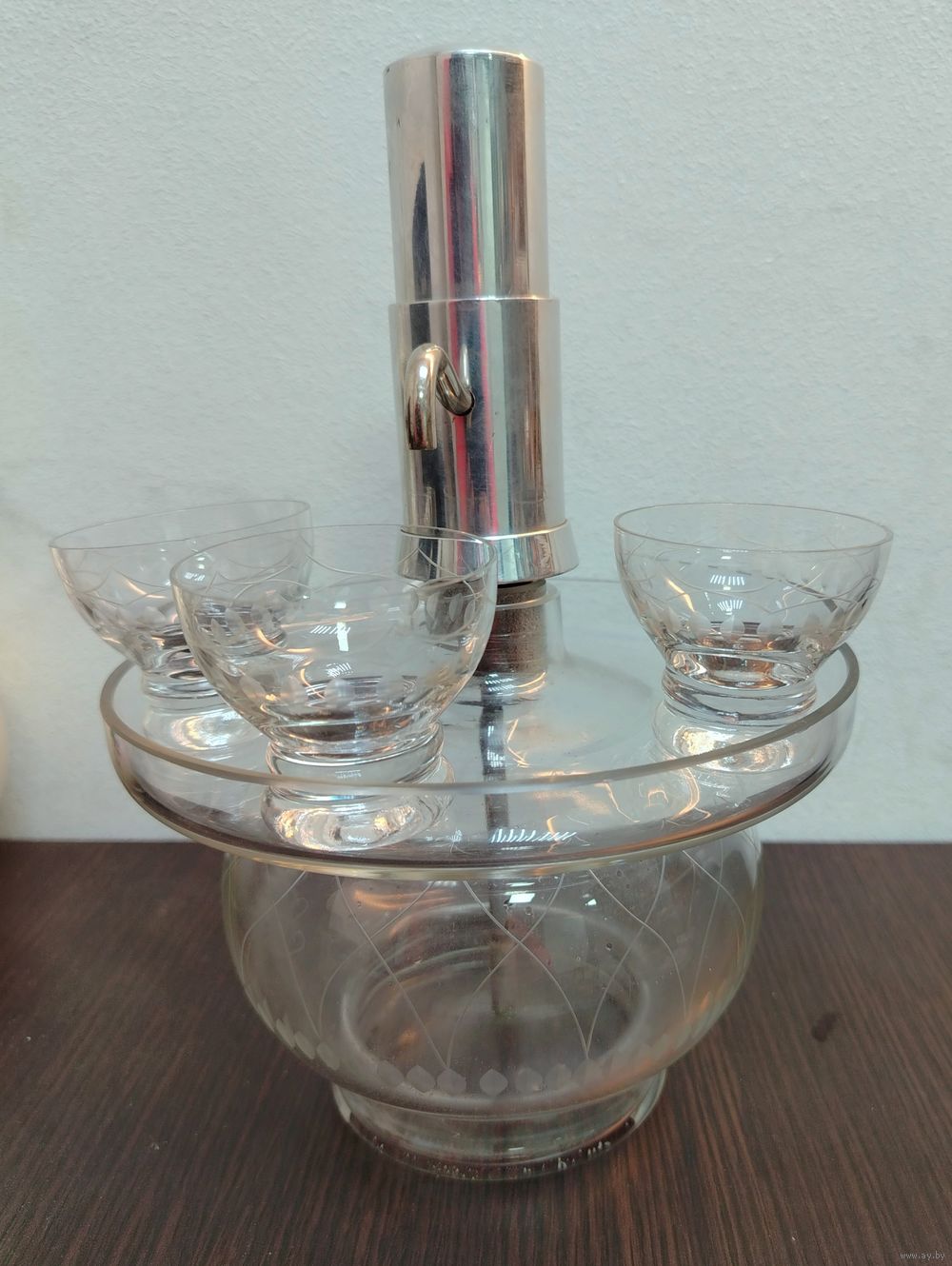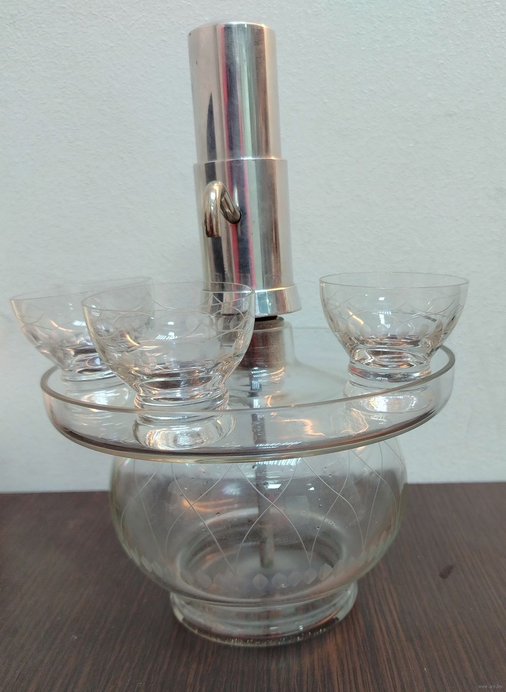 размеры высота 260мм ширина 130мм , если починить помпу можно использовать как красивую подачу напитка на стол . состоит из колбы , верхнего подноса с рюмками и помпы .